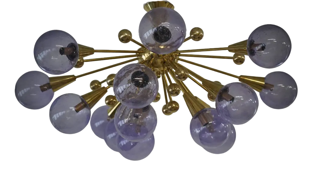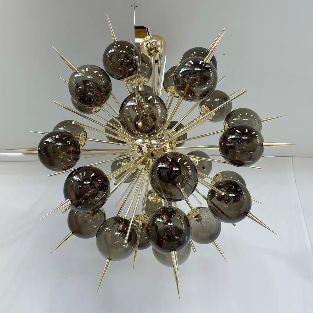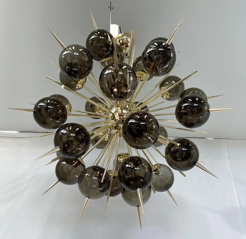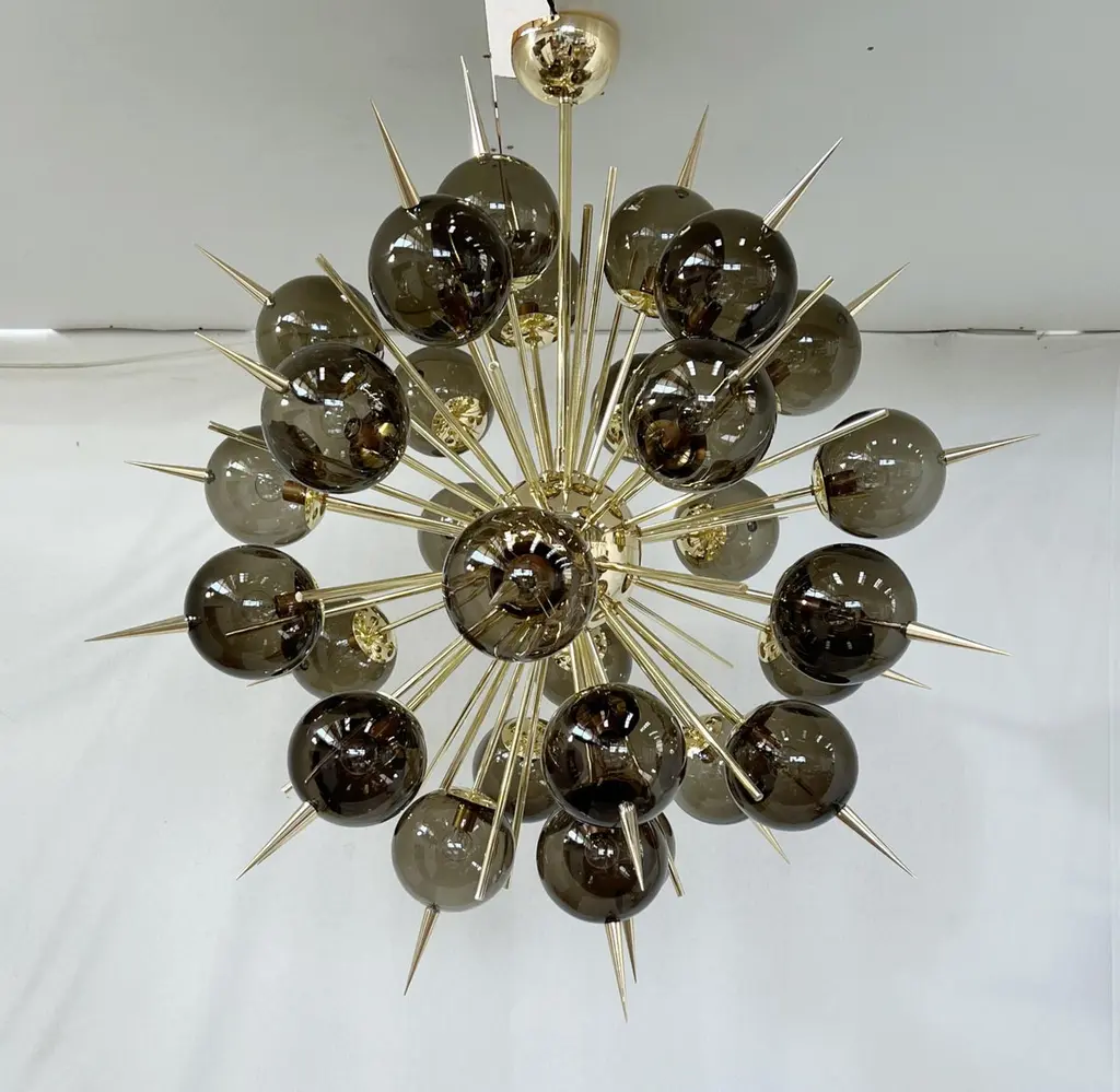 Italian Sputnik chandelier with 30 Murano glass globes and solid brass spikes mounted on brass frame / Designed by Fabio Bergomi for Fabio Ltd / Made in Italy30 lights / E12 or E14 type / max 40W eachMeasures: Diameter 47 inches / Height 54 inches including rod and canopyOrder only / This item ships from Italy.ORDER REFERENCE # : FABIOLTD PINOCCHIO 30