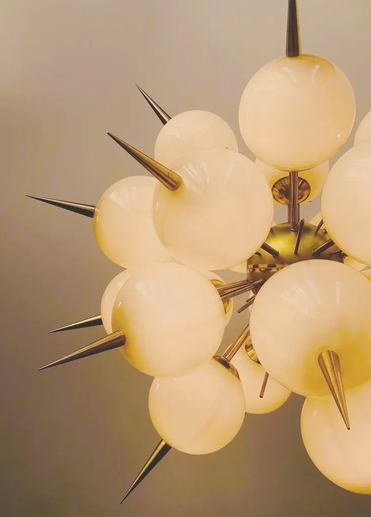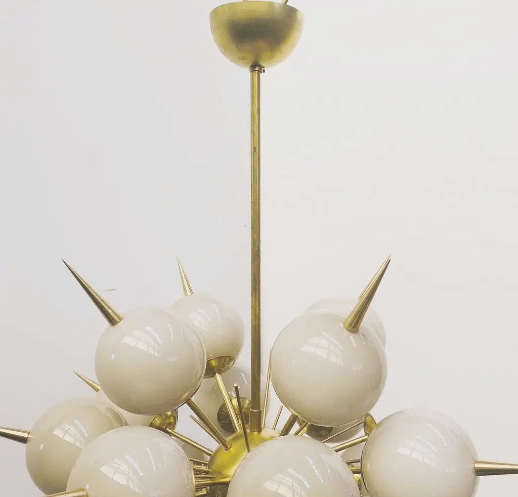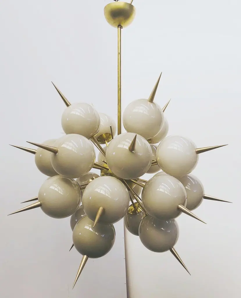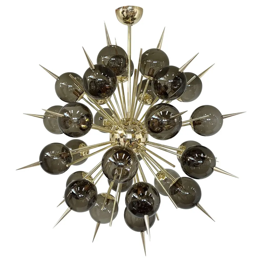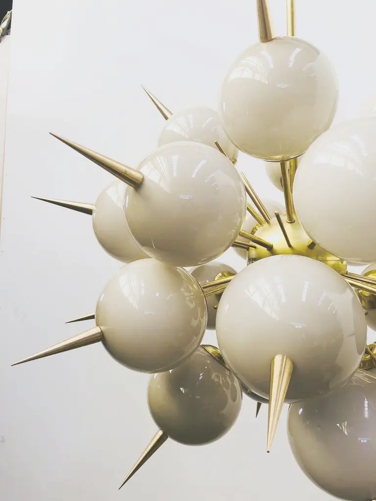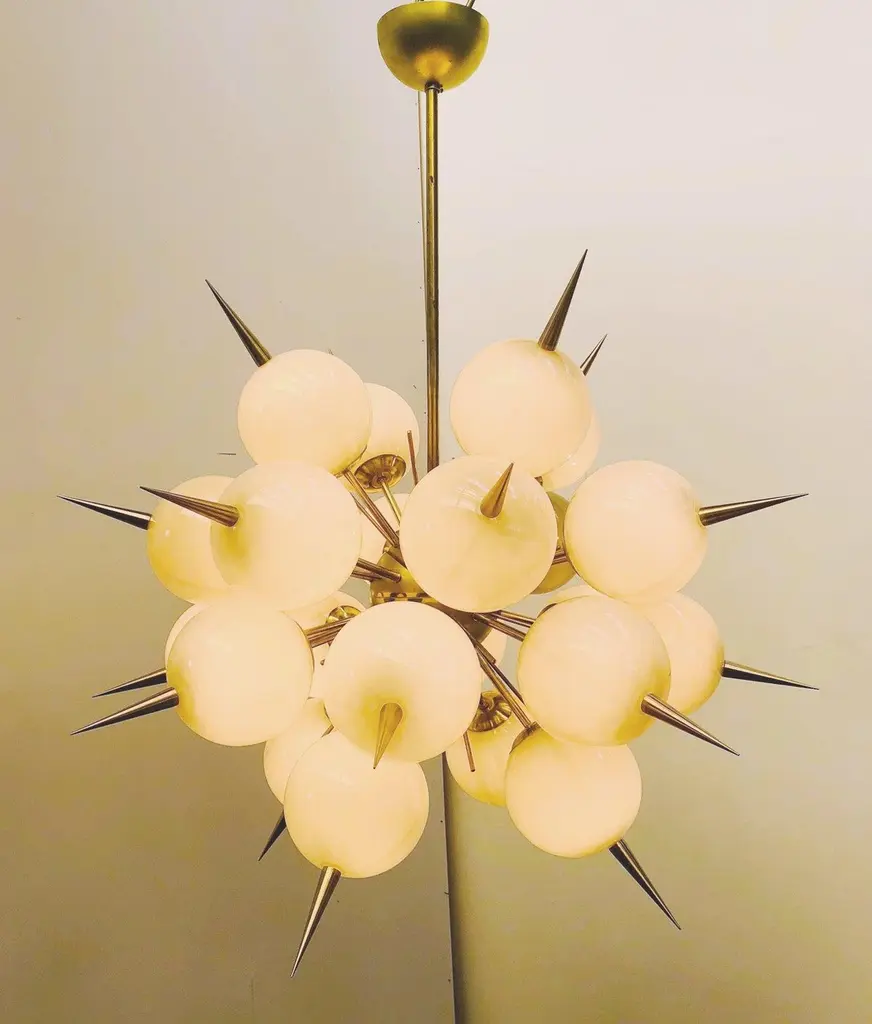 Italian Sputnik chandelier with 24 Murano glass globes and solid brass spikes mounted on brass frame / Designed by Fabio Bergomi for Fabio Ltd / Made in Italy24-light / E12 or E14 type / max 40W eachMeasures: Diameter 38 inches, height 46 inches including rod and canopyOrder only / This item ships from ItalyOrder Reference #: FABIOLTD PINOCCHIO 24