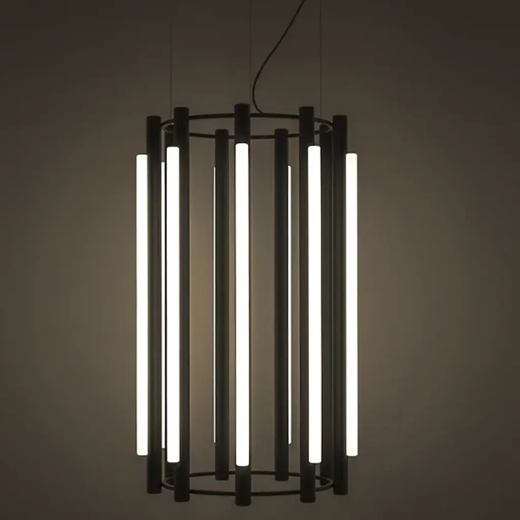 The Pipeline LED Chandelier from ANDlight showcases a sleek arrangement of linear sections that are cinched together by metal hoops to create a carousel-like form. Each linear section—or pipe—holds an LED and light diffuser to fill the room with ambient light. This chandelier is powered by 24V DC, and it requires constant voltage in order to operate, though the driver varies depending on input voltage and dimming requirements. The manufacturer recommends three people install the product—two to support the fixture while the third makes electrical and mechanical connections. Caine Heintzman designed the product to be practical and applicable to many different settings while providing evenly diffused linear light.