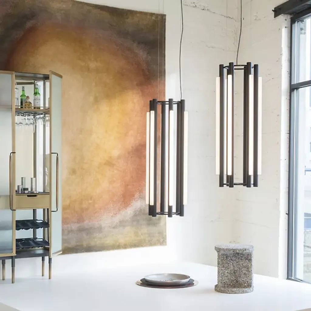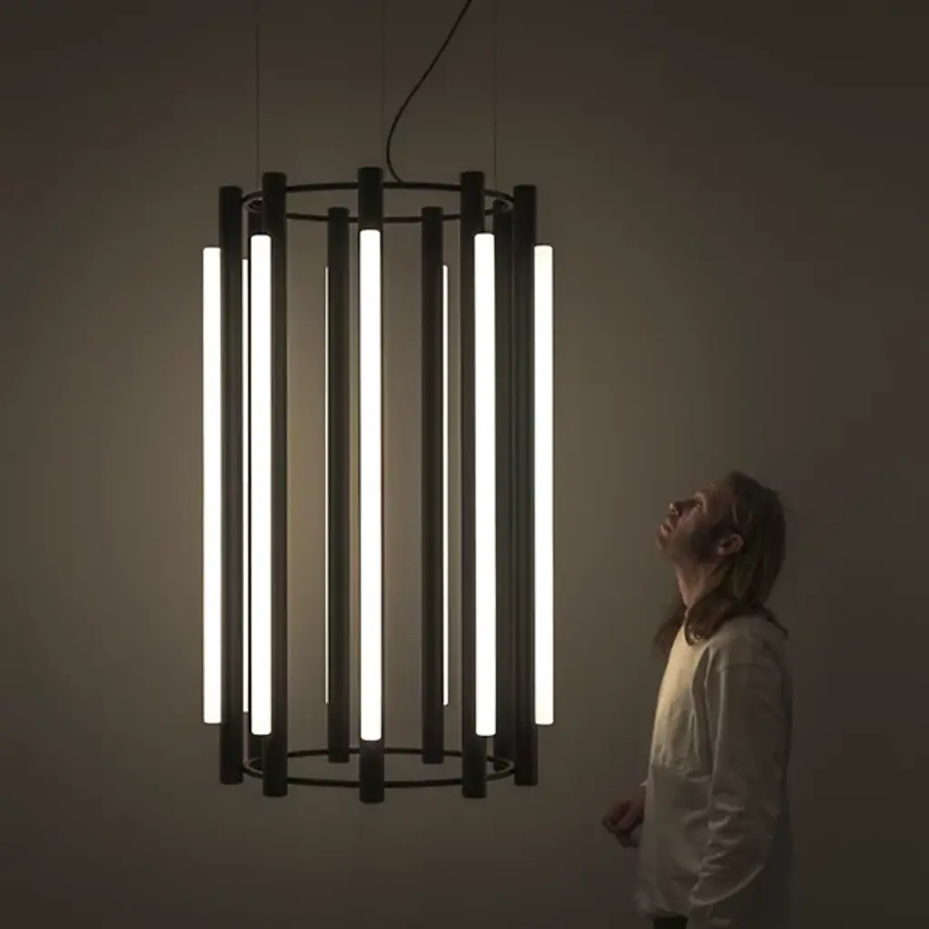 The Pipeline LED Chandelier from ANDlight showcases a sleek arrangement of linear sections that are cinched together by metal hoops to create a carousel-like form. Each linear section—or pipe—holds an LED and light diffuser to fill the room with ambient light. This chandelier is powered by 24V DC, and it requires constant voltage in order to operate, though the driver varies depending on input voltage and dimming requirements. The manufacturer recommends three people install the product—two to support the fixture while the third makes electrical and mechanical connections. Caine Heintzman designed the product to be practical and applicable to many different settings while providing evenly diffused linear light.
