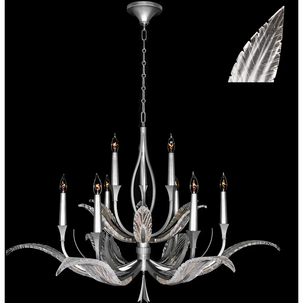 Interweaving signature Fine Art studio glass with the noble element of our handmade metal fabrication, this soft gold leaf chandelier combines classical lines with a contemporary glass design. Each plume is handblown and sculpted with a translucent mixtu