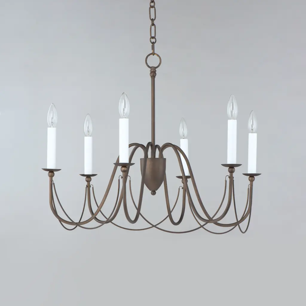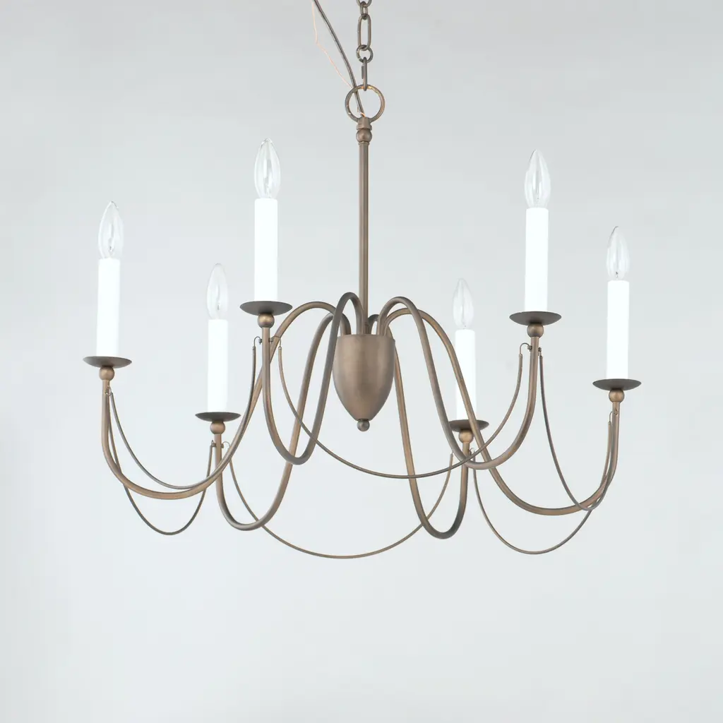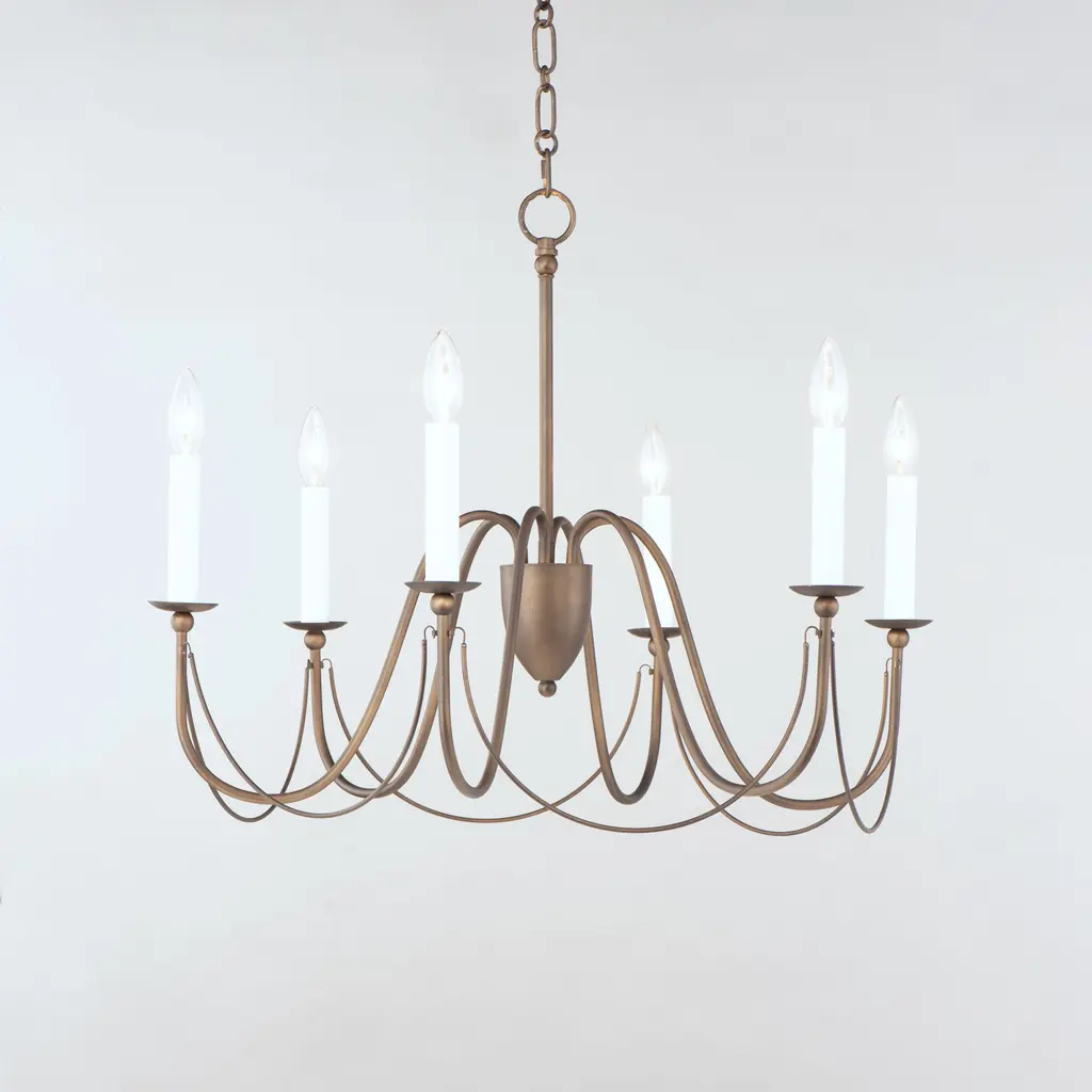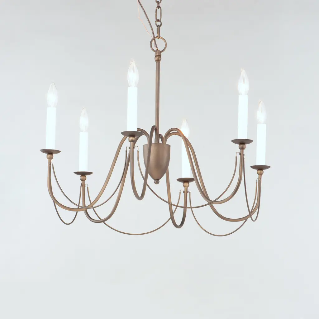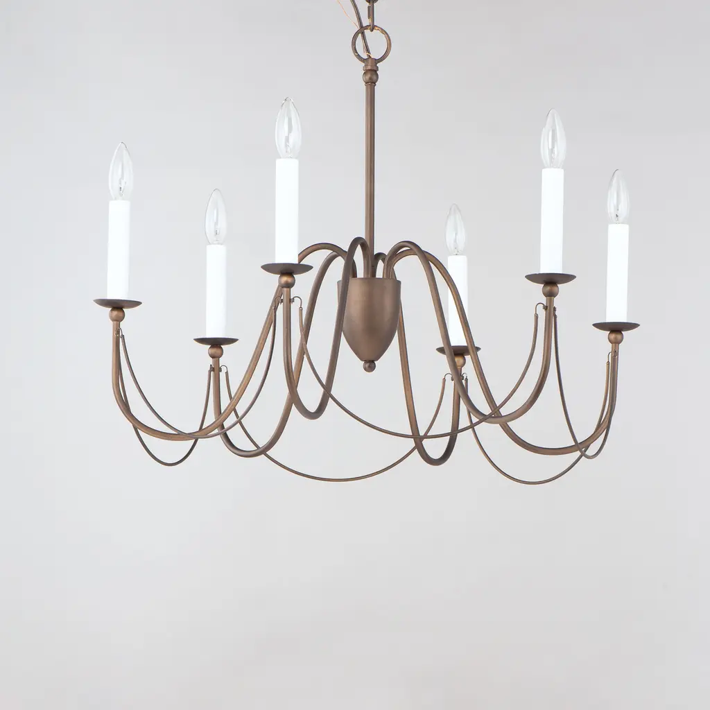 Sweeping metal accents links create classic curves on a minimalist chandelier. Available in hand-rubbed Chestnut Bronze or elegant Gold Leaf finishes. This look humbly evokes French Country charm and enchants any room it illuminates.