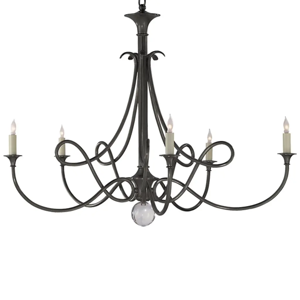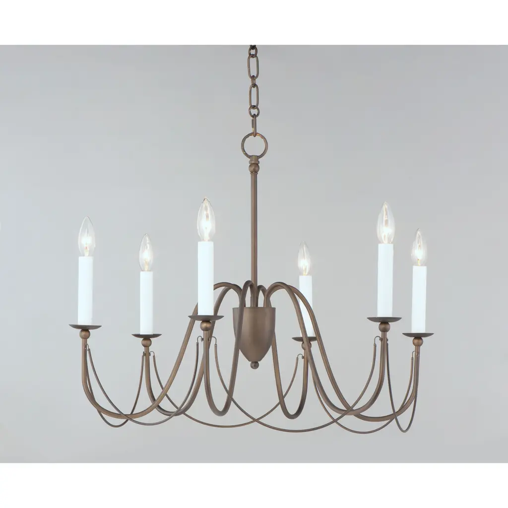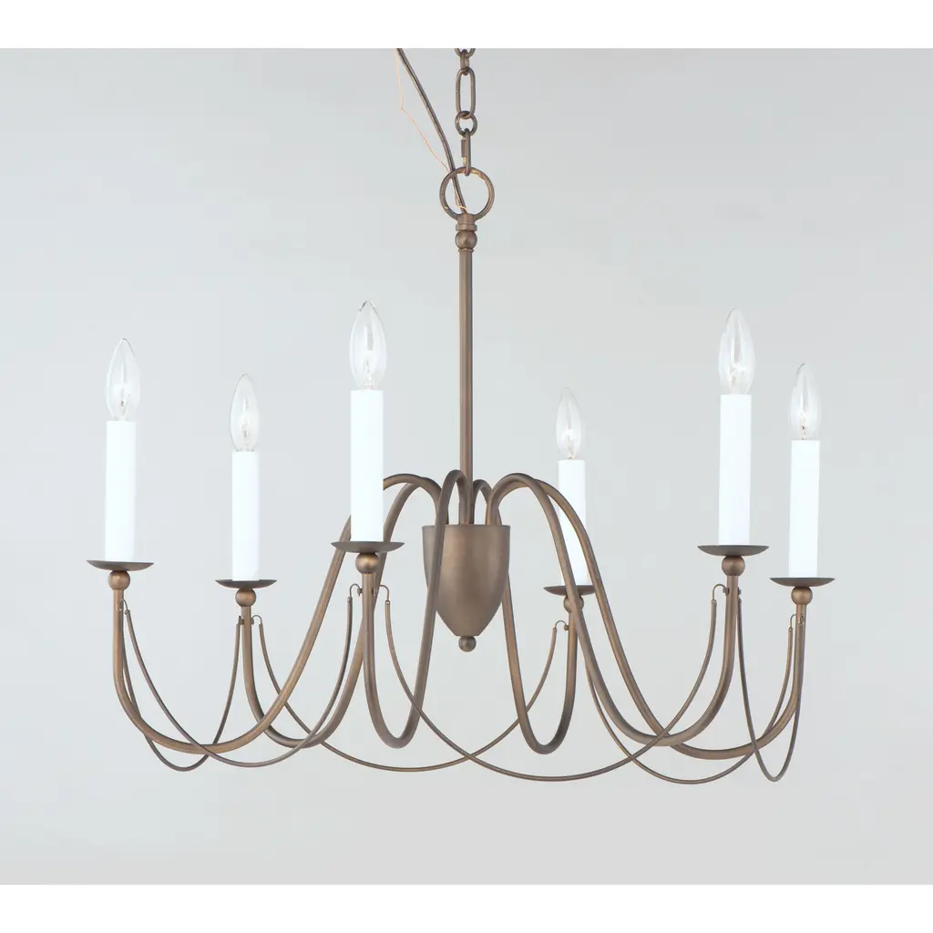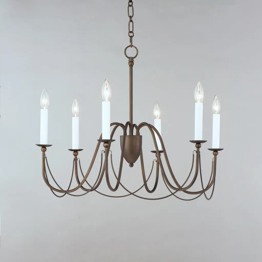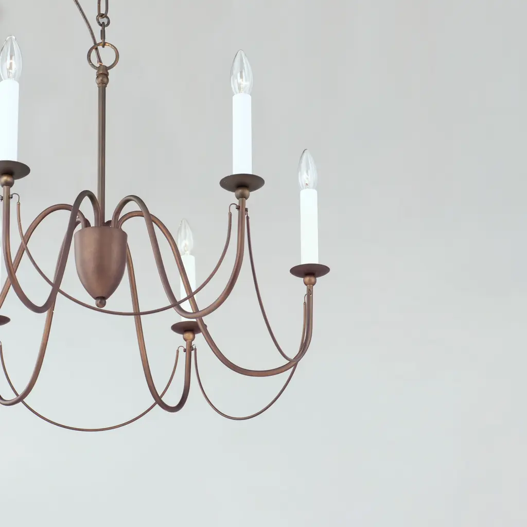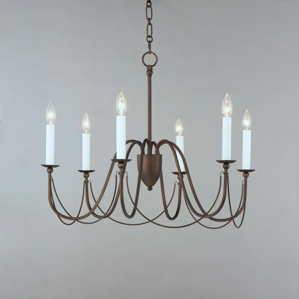 Sweeping metal accents links create classic curves on a minimalist chandelier. Available in hand-rubbed Chestnut Bronze or elegant Gold Leaf finishes. This look humbly evokes French Country charm and enchants any room it illuminates.
