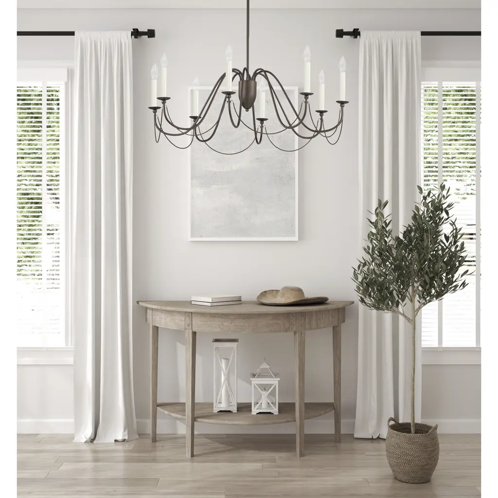 Sweeping metal accents links create classic curves on a minimalist chandelier. Available in hand-rubbed Chestnut Bronze or elegant Gold Leaf finishes. This look humbly evokes French Country charm and enchants any room it illuminates.