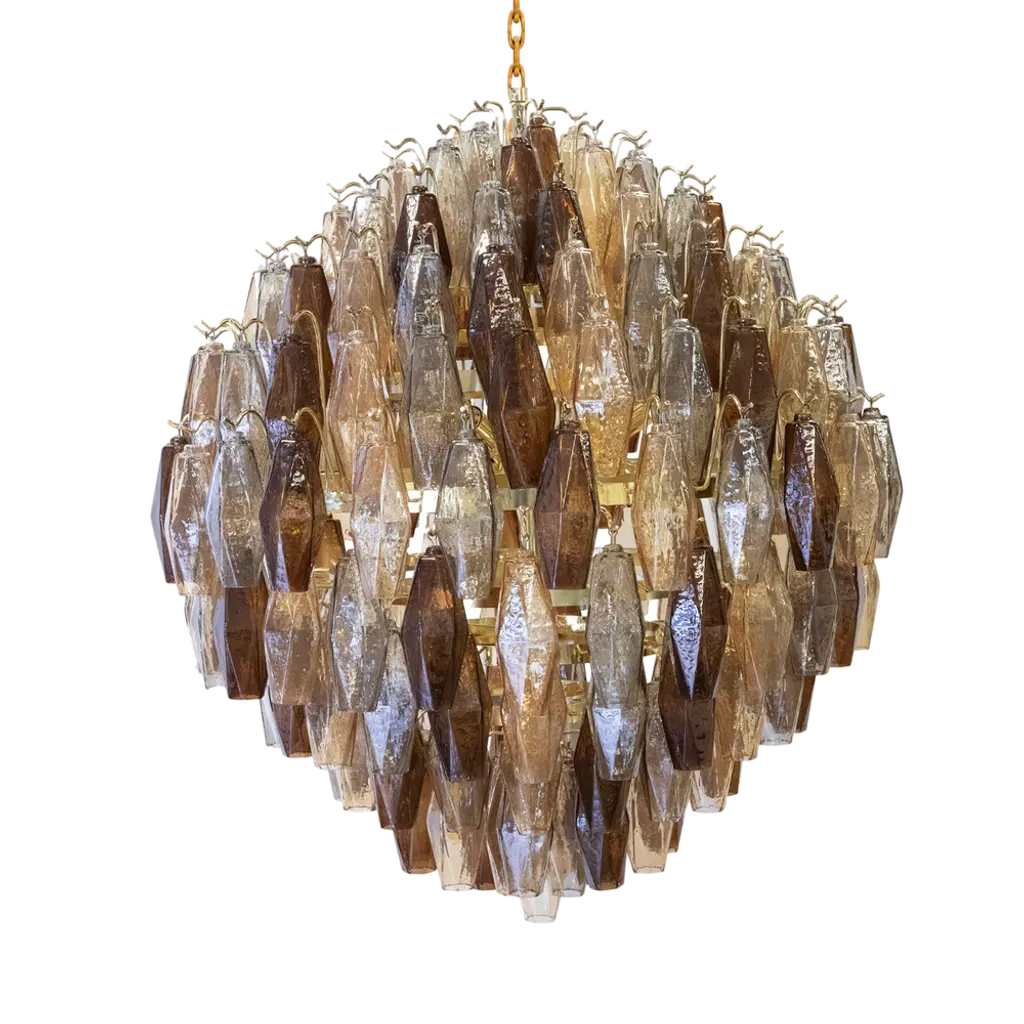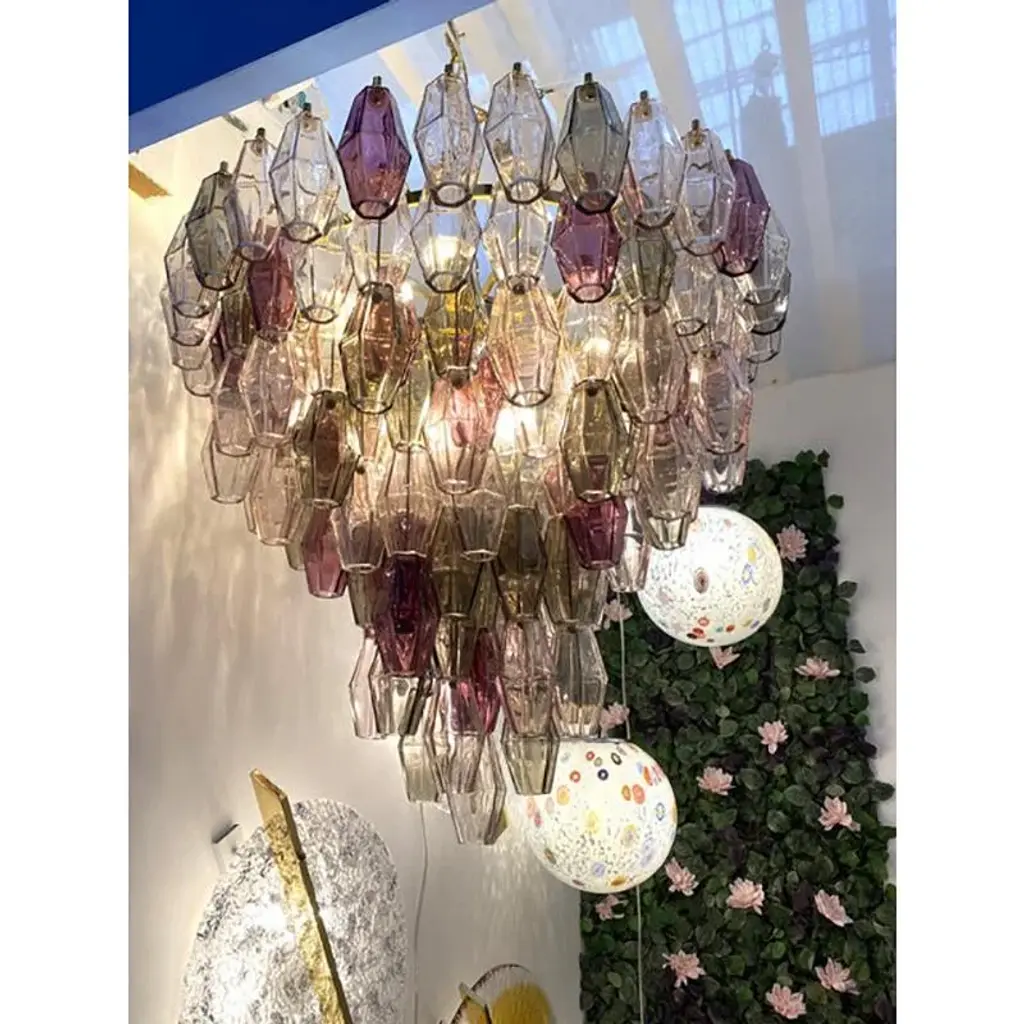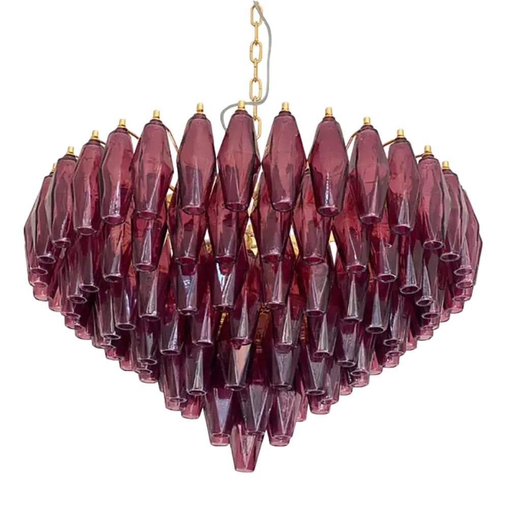 Luxury elegant chandelier in gold 24k bath of metal frame and "poliedri" in murano glass. pink, violet, fumè and wine: four colors for a lively chandelier in venini style all made in italy, ship from italy. exclusive design by simoeng dimensions (cm/in): d 80 cm h 90cm/ d 31.5″ h 35.4″ finiture: gold 24 brass metal frame chain 19.7″ more canopy us plug (up to 110v).