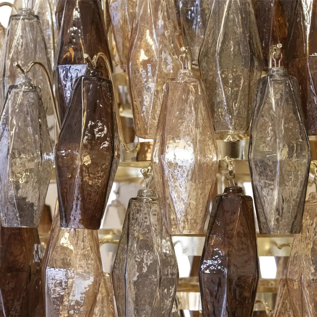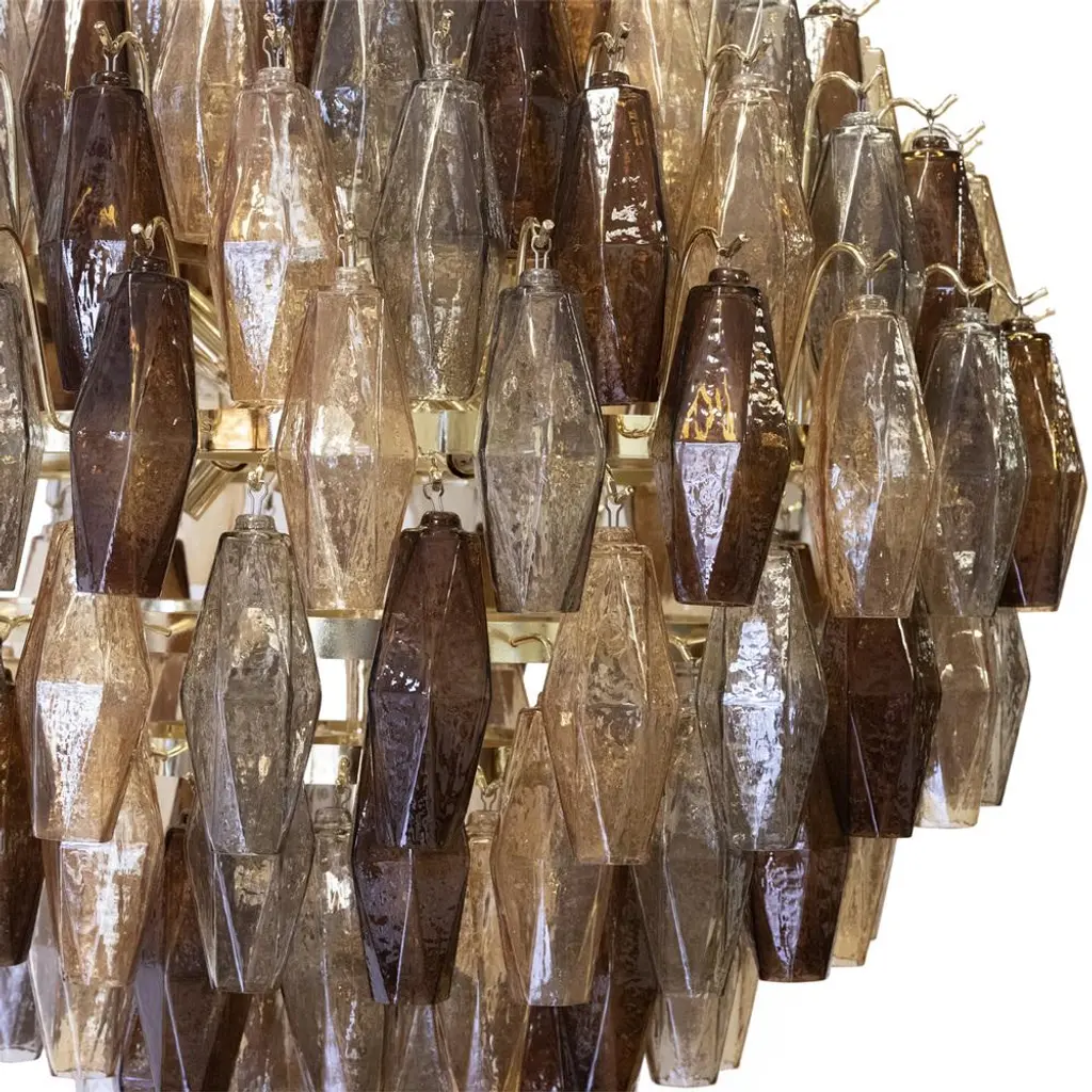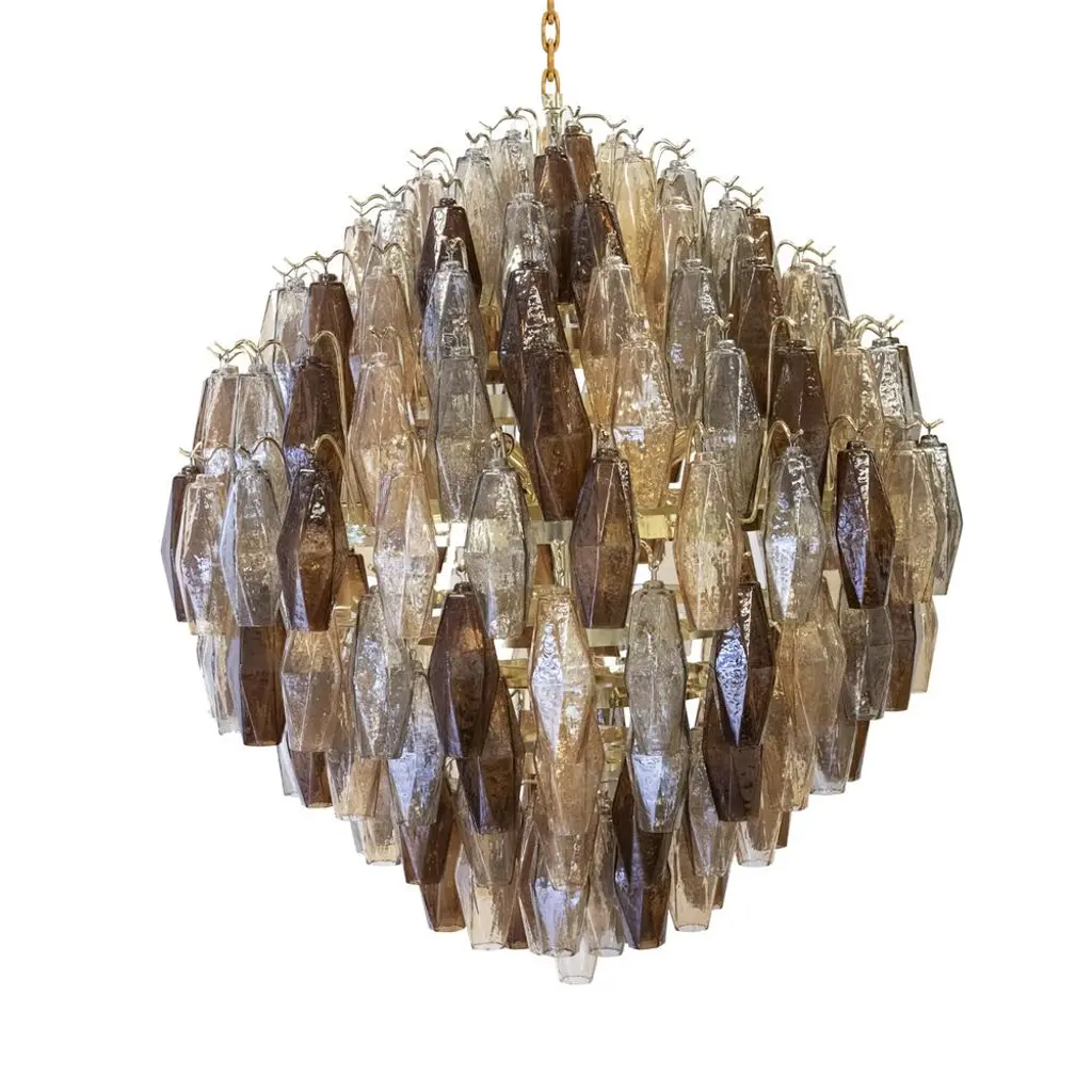 Elegant handcrafted chandelier in a spherical shape with a diameter of 85 cm, composed of glass polyhedrons in glacé, amber, and smoky tones. The impressive size and refined polished brass finish make this piece unique and imposing—ideal for spaces that require a distinctive design element. Handmade using traditional Murano glass slab techniques, the chandelier echoes the creative Murano glass design from the early 20th century. Each piece is one of a kind and comes with the authenticity guarantee of "Vetro Artistico di Murano e del Veneziano." It is available with a 50 cm chain (or longer) or a ceiling metal bar. Up to 250V (Europe/UK Standard).