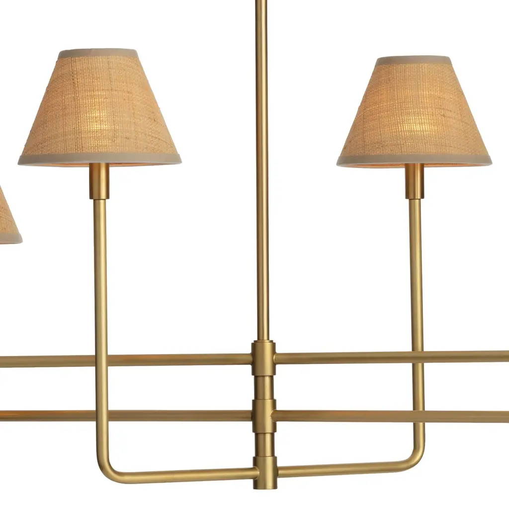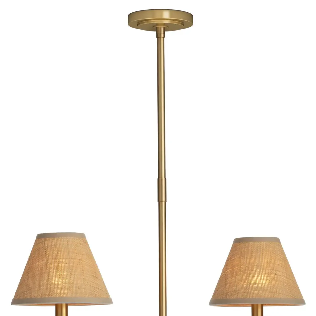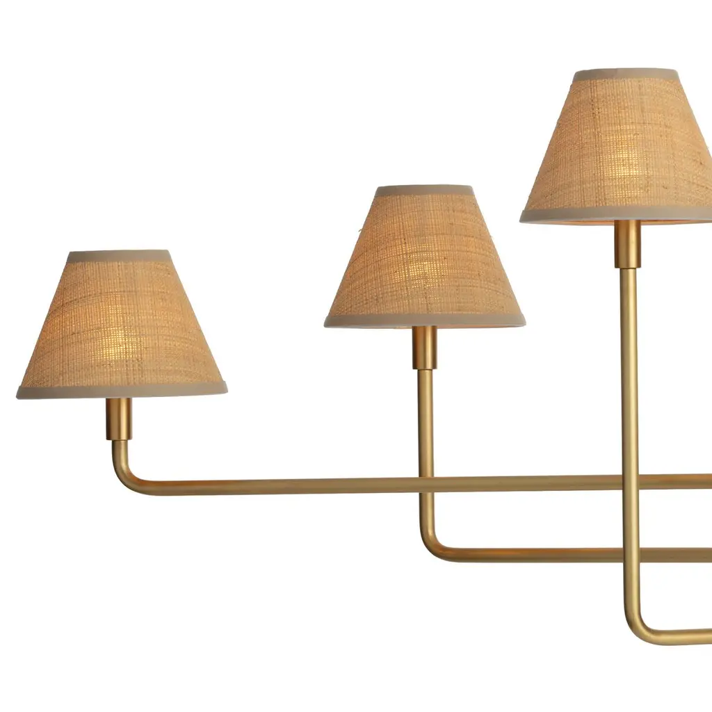 The Polly Chandelier embodies grace and versatility with its six shades, delicately crafted and sewn into a charming scalloped pattern. Its multi-tiered design, coupled with rotatable arms, offers flexibility in configuration, allowing for linear arrangements or coverage over a round dining table.