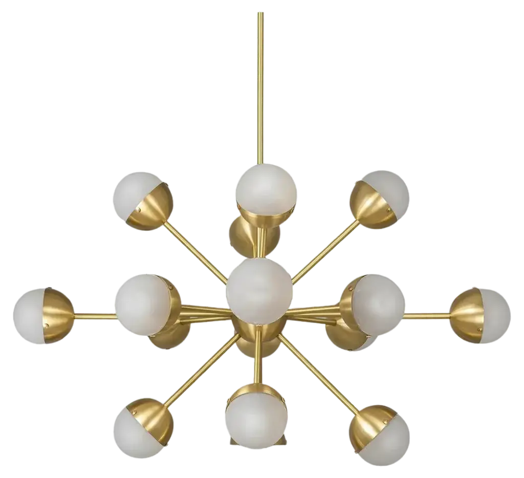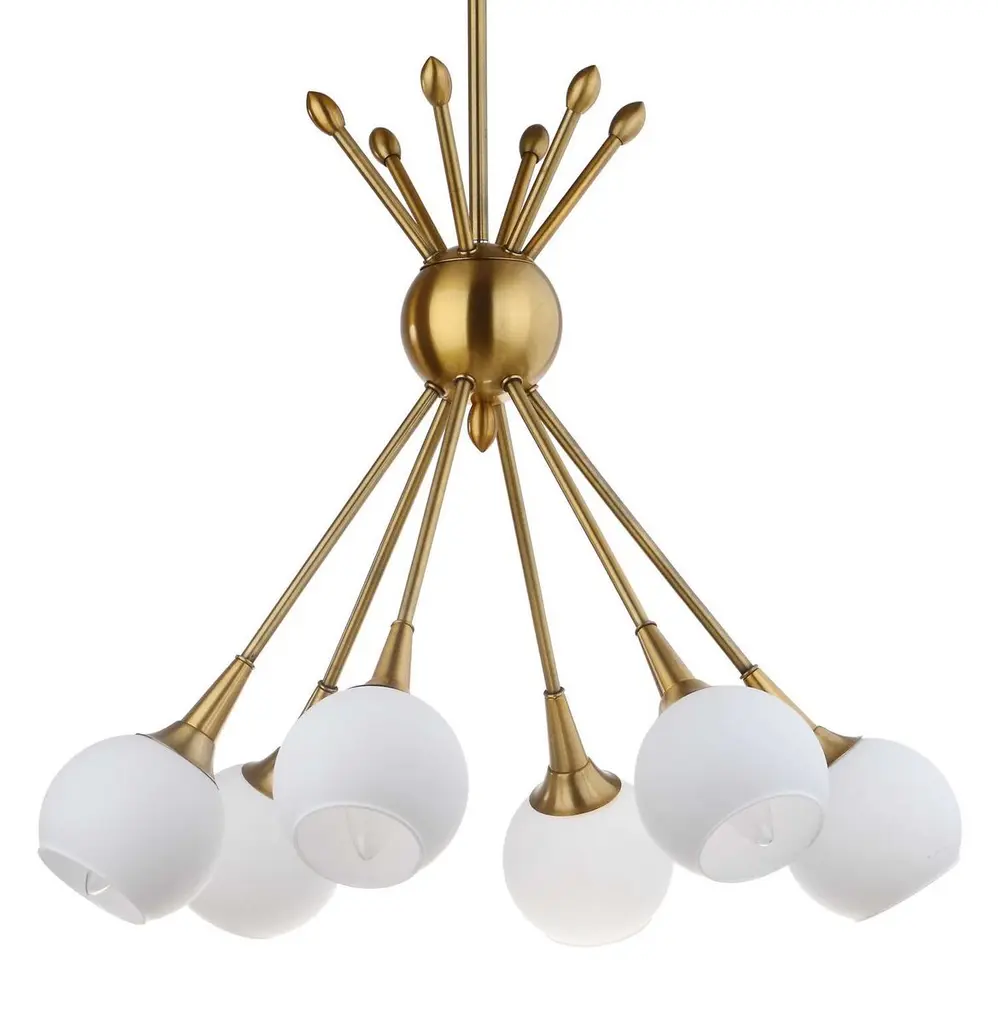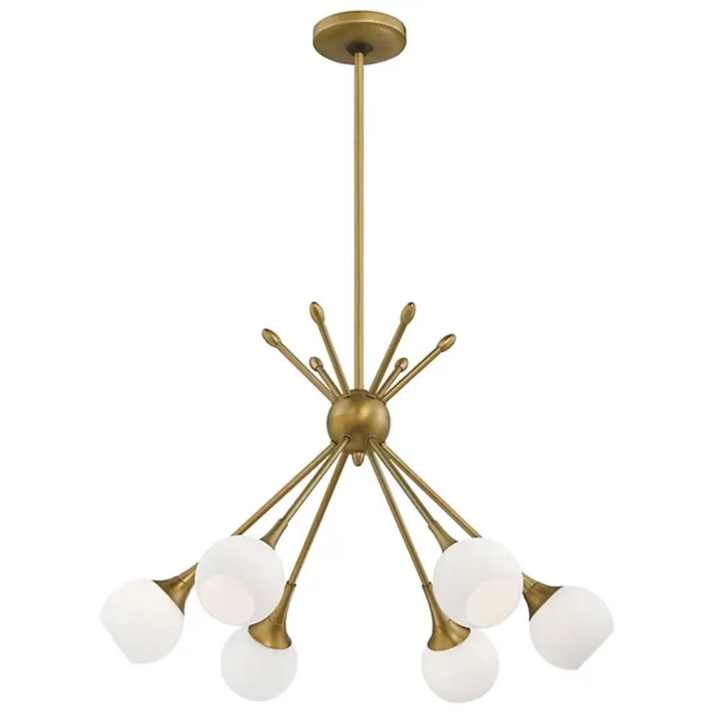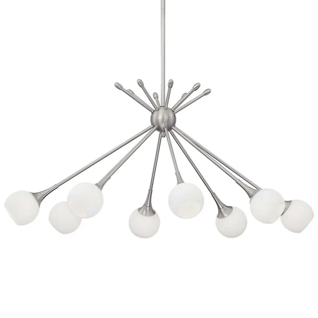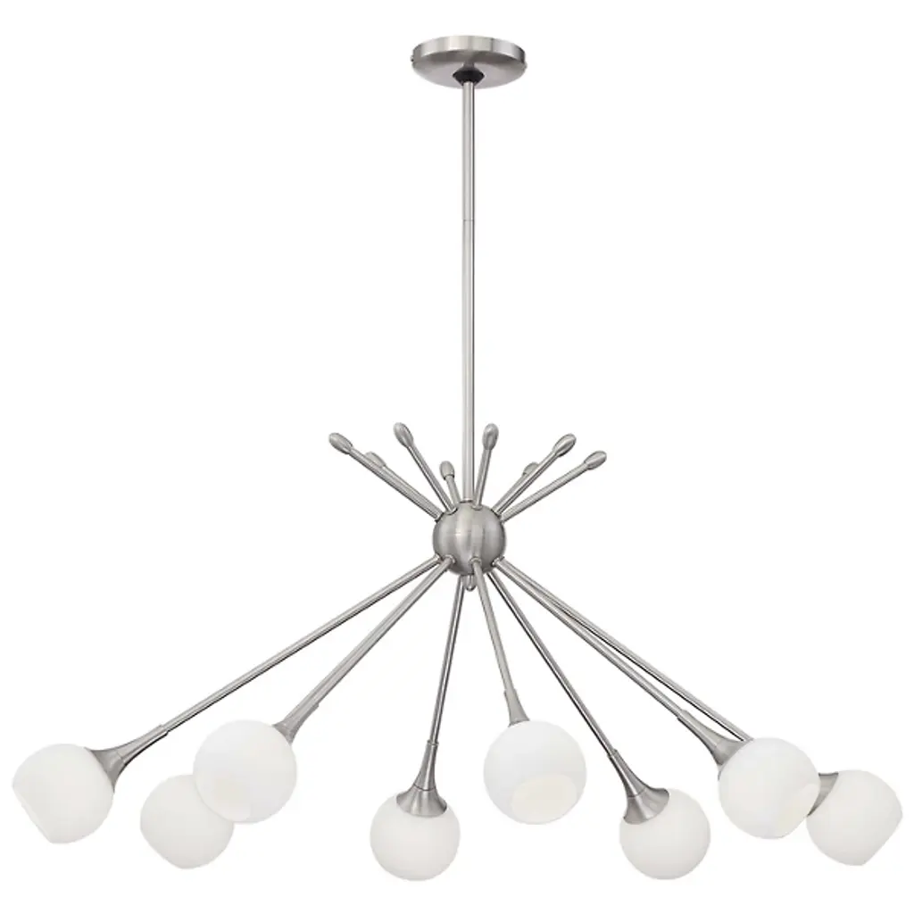The Pontil P1808 8-Light Chandelier by George Kovacs brings a warm, mid-century modern flair to your home décor. Its design features several torch-like fixtures which cross at dramatic angles through a spherical hub and culminate in Etched Opal glass globes. Once in use, a soft, ambient light filters through the glass, creating an upscale ambiance for entryways, dining rooms, and open living spaces.
