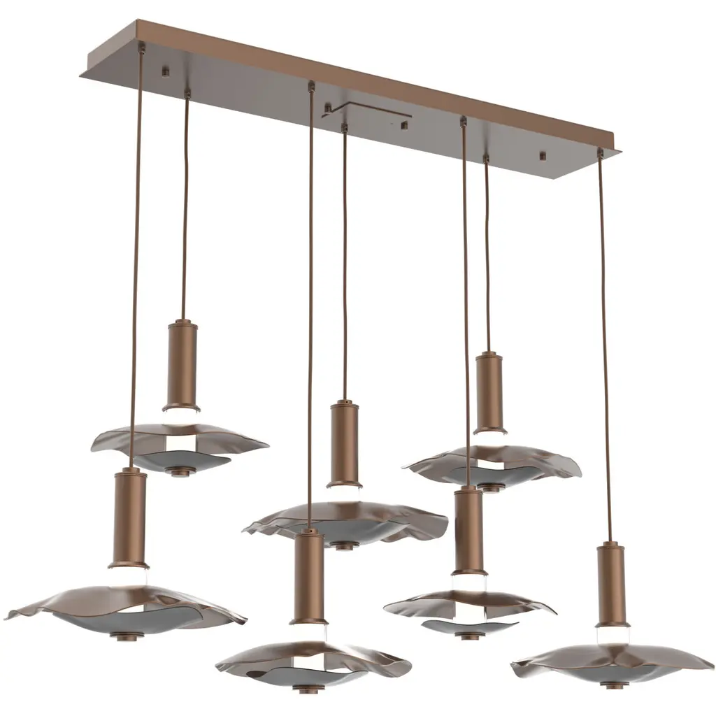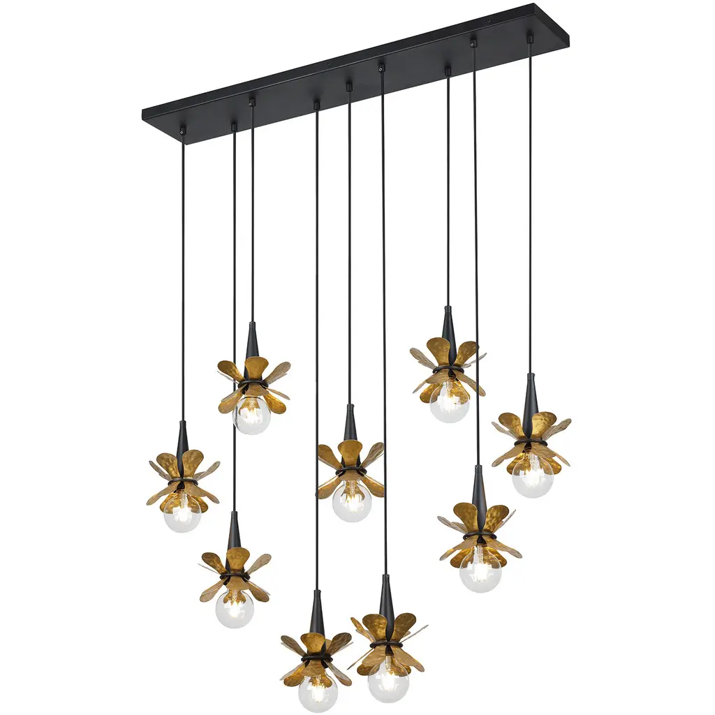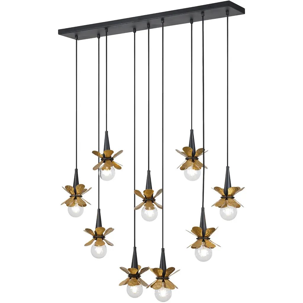 The Savoy House Portinatx 9-light linear chandelier was designed by Breegan Jane, an award-winning interior designer and TV host. Adorn your home with the beautiful, edgy metal flowers that cascade down from the linear frame. Hammered metal petals wear a hand-applied Gold finish that contrasts nicely with the structure's hand-applied Satin Black finish, perfectly exemplifying how Breegan believes metallics elevate a design without trying too hard. Portinatx is 54.75" in height, 40" in length and 9.38" in width. The hanging height of each light is adjustable. Uses nine standard size bulbs of up to 60 watts per bulb. Bulbs not included.
