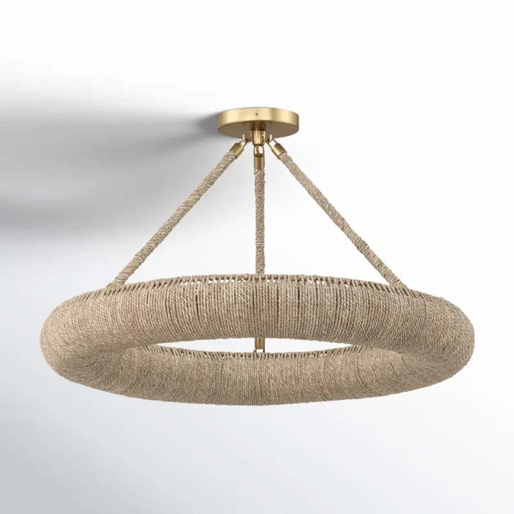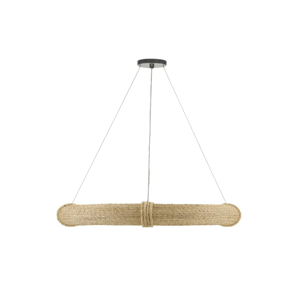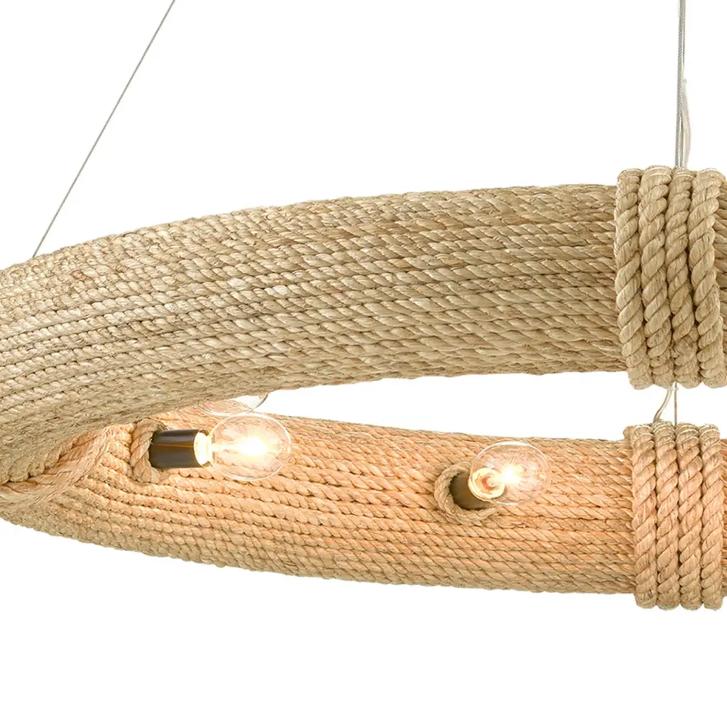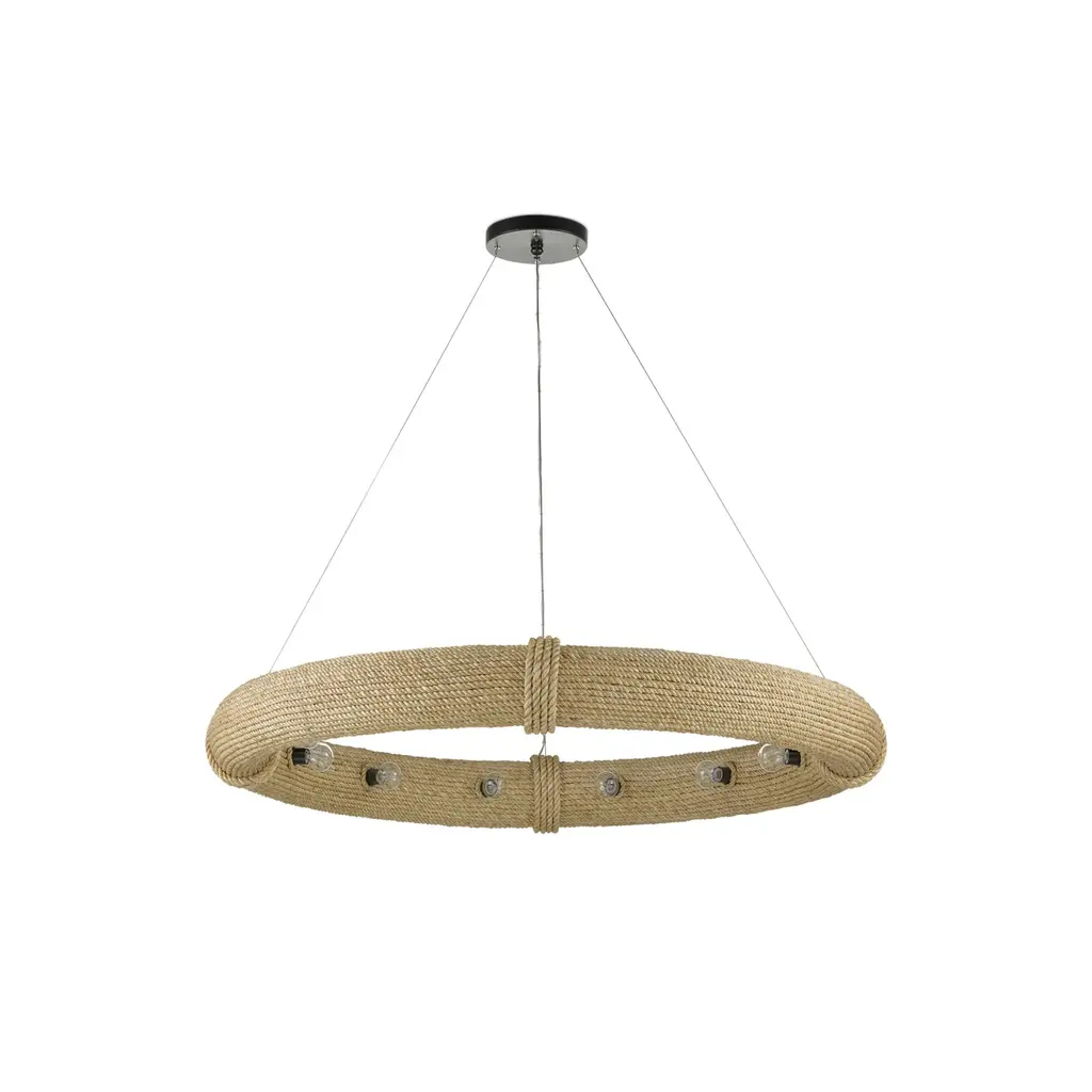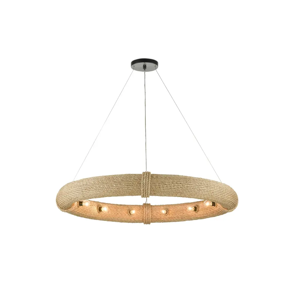 During the pandemic, movies were one of Clarence Mallari's sources for inspiration: "I became fascinated with the shape and function of a lifebuoy and wondered how I could translate it into lighting. It took me some time to come out with the design due to the fact that it was challenging to conceive and arduous to make." The frame on this Portmeirion Chandelier is made of wrought iron around which abaca rope has been wrapped for the nautical feel that inspired it. This small version of the Portmeirion has 6 lights, while the larger version has 12 lights, both of which are suspended on an aircraft cable to make the fixtures seem like they are floating in the sea. Ships In 7-10 Business Days Ships In 7-10 Business Days This image is for illustrative purposes only. The colors shown are accurate within the constraints of lighting, photography, and the color accuracy of your screen.