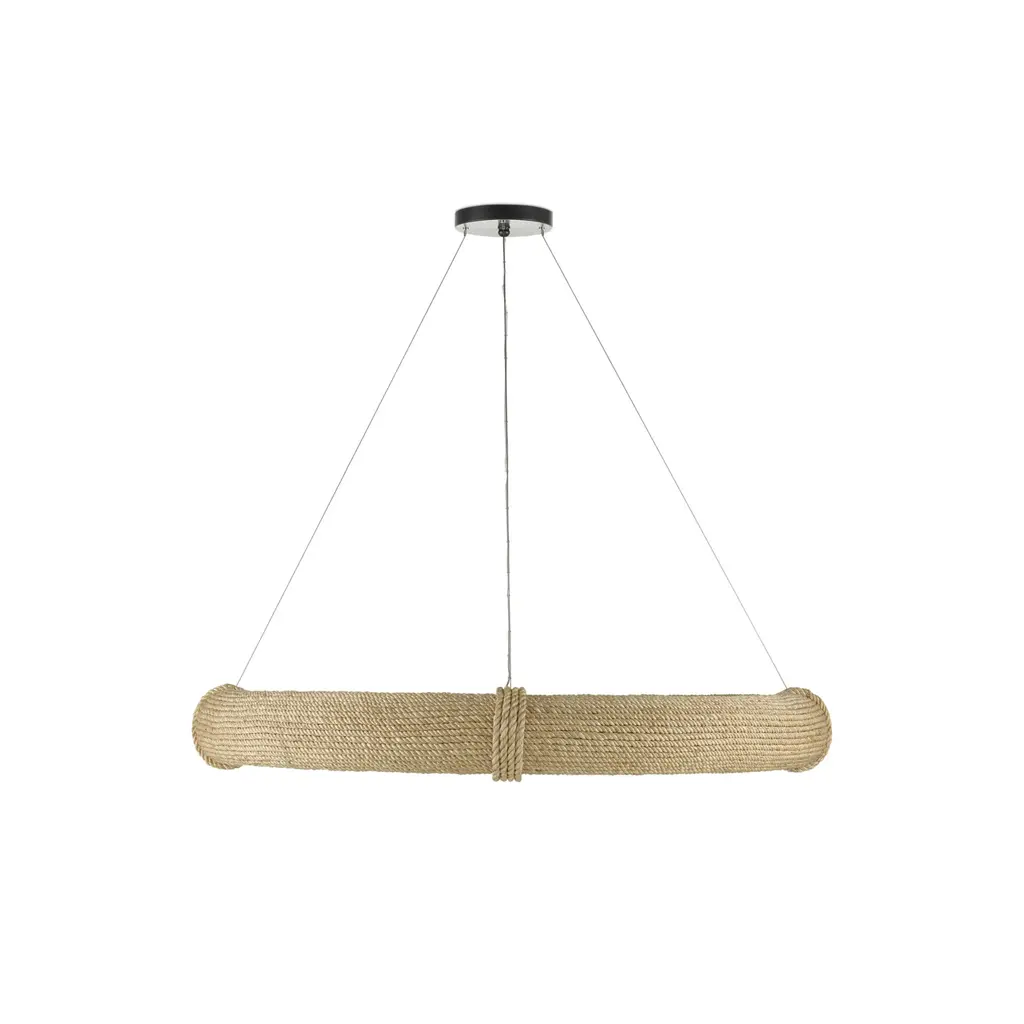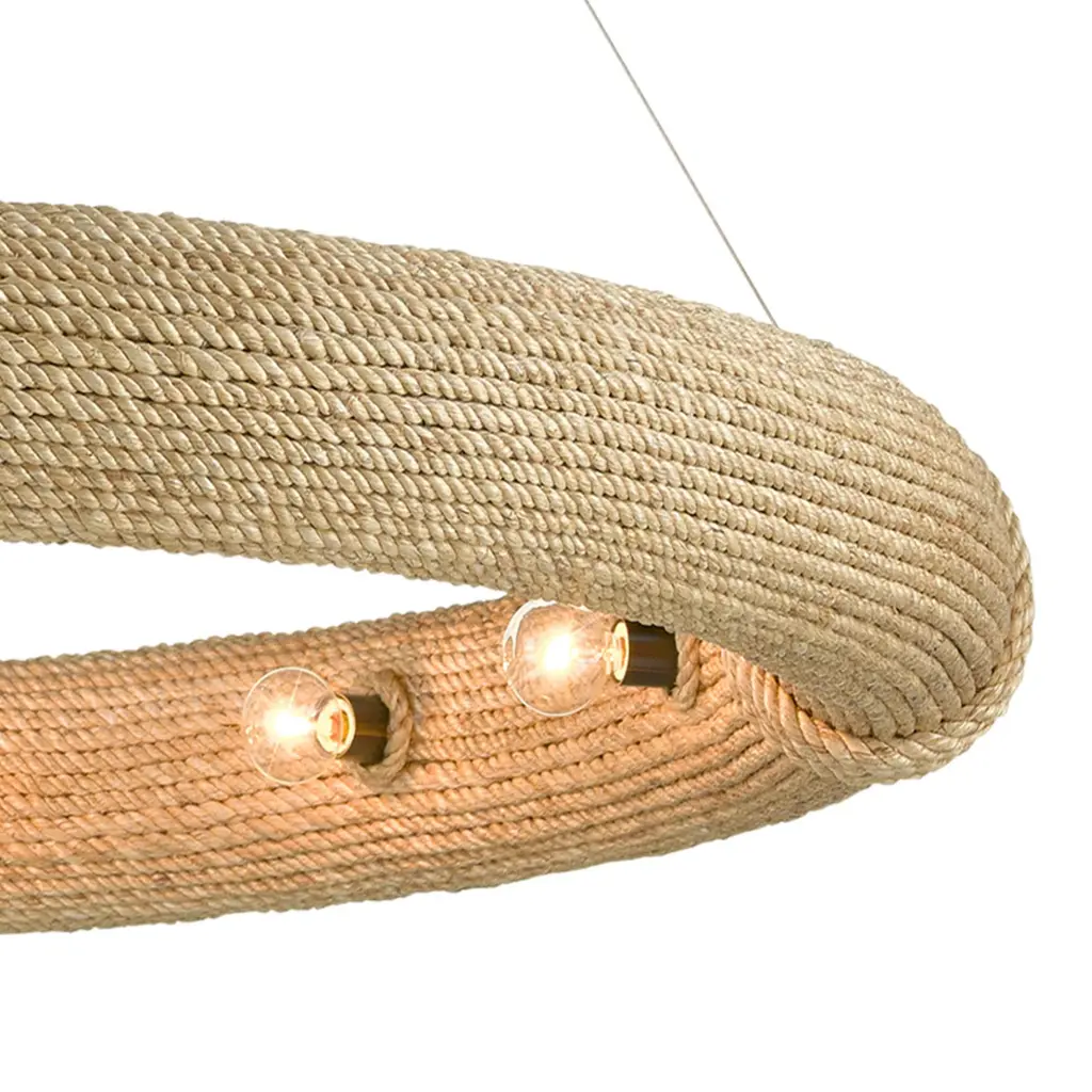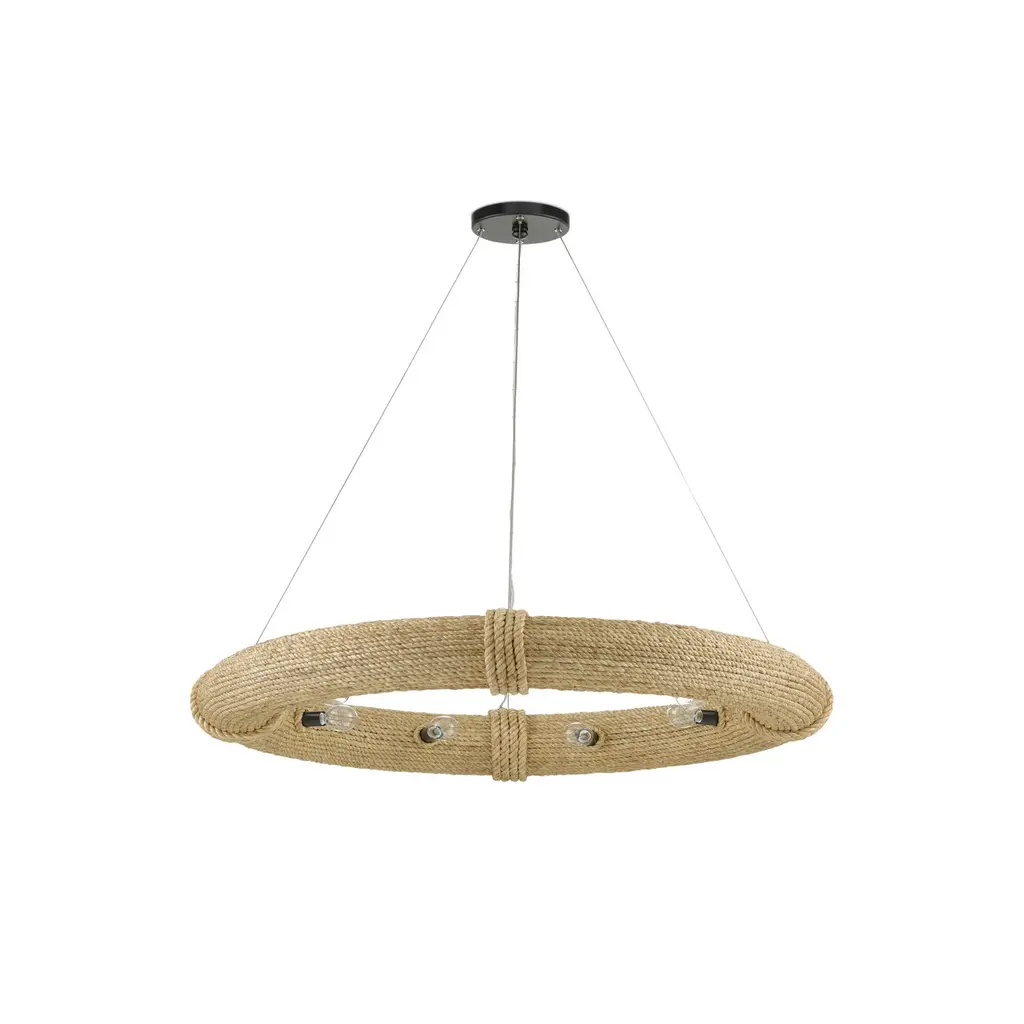 During the pandemic, movies were one of Clarence Mallari's sources for inspiration: "I became fascinated with the shape and function of a lifebuoy and wondered how I could translate it into lighting. It took me some time to come out with the design due to the fact that it was challenging to conceive and arduous to make." The frame on this Portmeirion Chandelier is made of wrought iron around which abaca rope has been wrapped for the nautical feel that inspired it. This small version of the Portmeirion has 6 lights, while the larger version has 12 lights, both of which are suspended on an aircraft cable to make the fixtures seem like they are floating in the sea. Ships In 7-10 Business Days Ships In 7-10 Business Days This image is for illustrative purposes only. The colors shown are accurate within the constraints of lighting, photography, and the color accuracy of your screen.