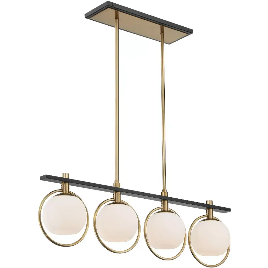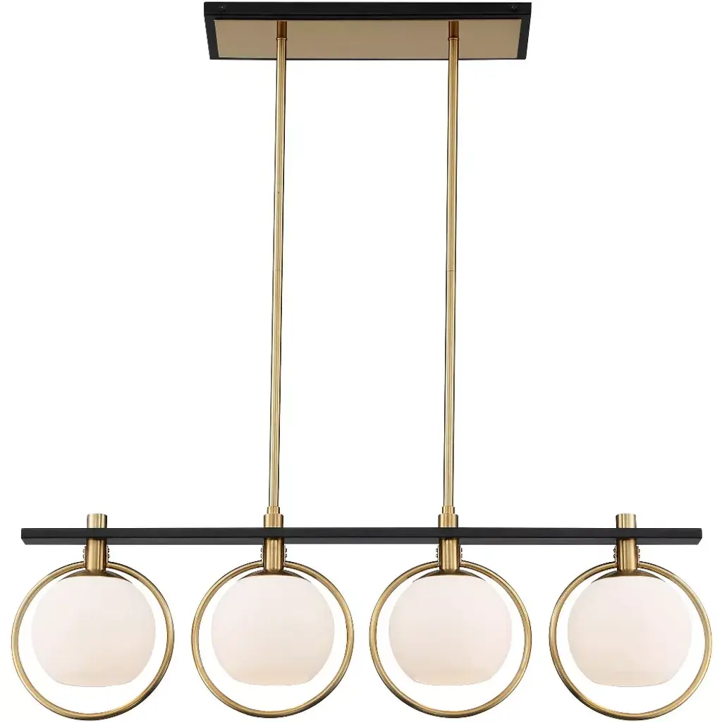 Bring artistic elegance to a modern space with this four-light island pendant light by Possini Euro Design®. With an Art Deco vibe, this contemporary light fixture illuminates a kitchen island or bar space in style. Antique brass and black finishes saturate its steel frame, calling attention to sleek frosted white glass globe shades. A linear and geometric silhouette offers a crisp, updated look to a retro classic.