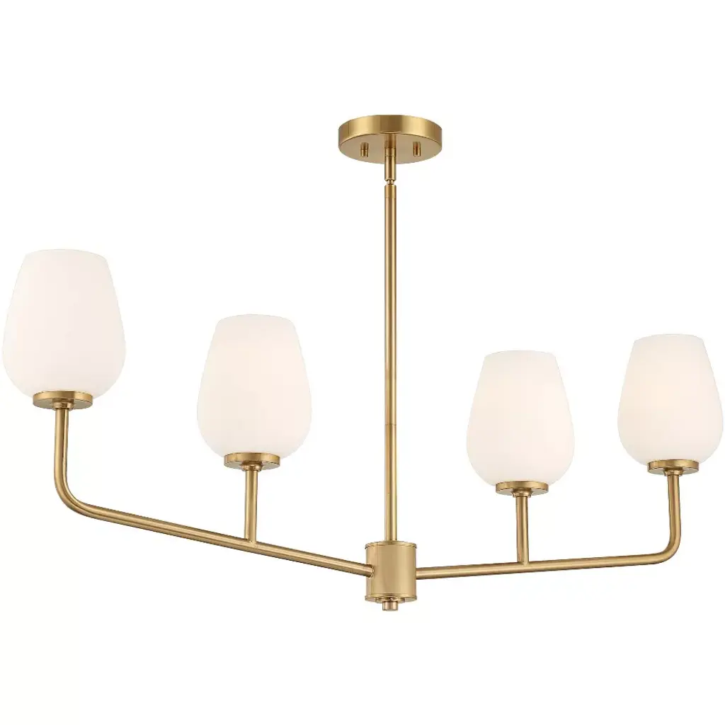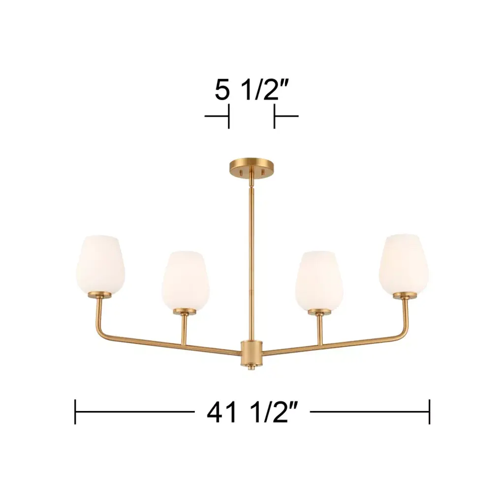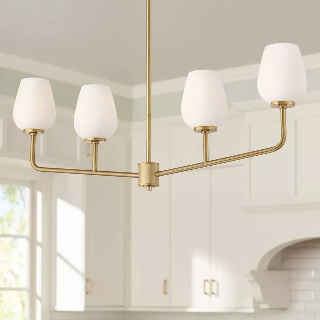Brighten a kitchen island or dining table with the clean simplicity of this modern glam four-light island chandelier. From Possini Euro Design®, it boasts a dual-arm design in a warm gold finish sure to create a welcoming ambiance. The rounded, tulip-inspired shades are crafted in white glass for excellent light diffusion. Perfect for grabbing a bite in the morning or catching up with the family while making dinner.