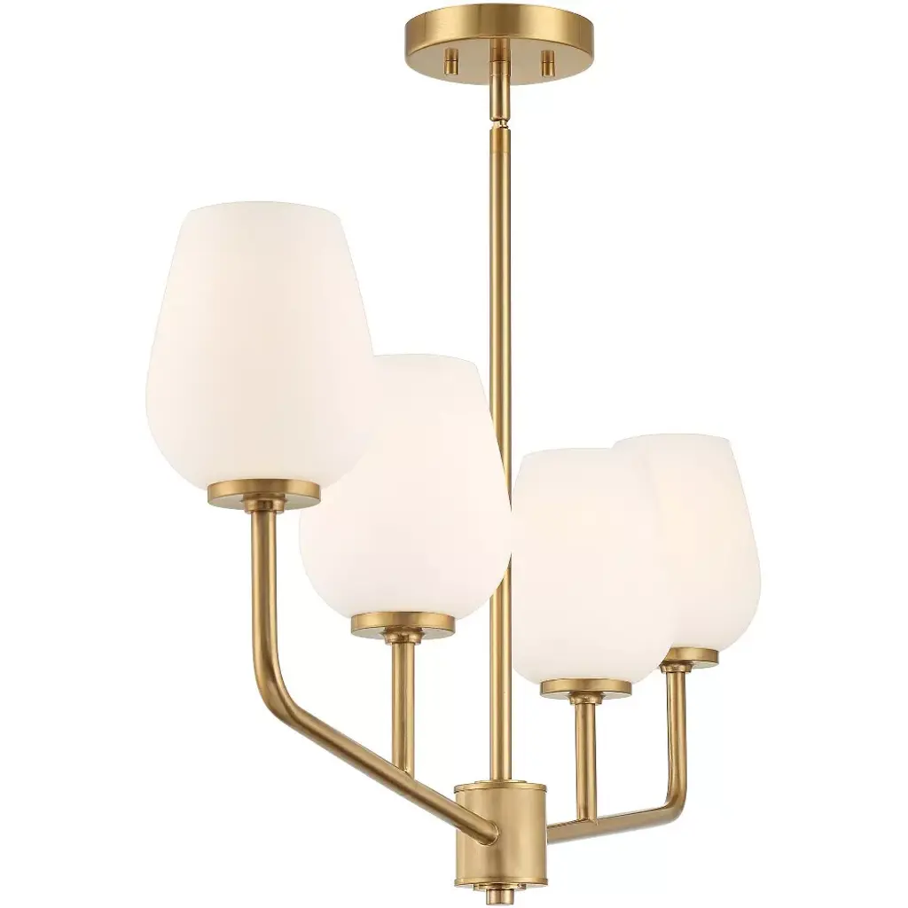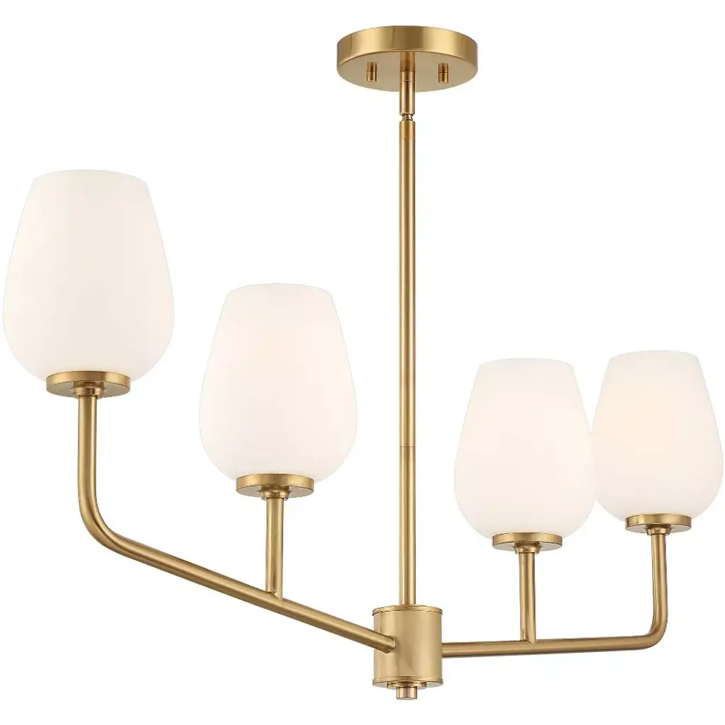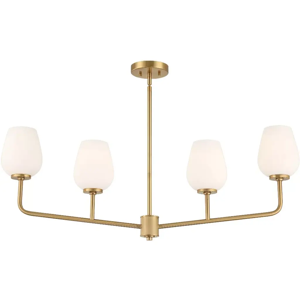 Brighten a kitchen island or dining table with the clean simplicity of this modern glam four-light island chandelier. From Possini Euro Design®, it boasts a dual-arm design in a warm gold finish sure to create a welcoming ambiance. The rounded, tulip-inspired shades are crafted in white glass for excellent light diffusion. Perfect for grabbing a bite in the morning or catching up with the family while making dinner.
