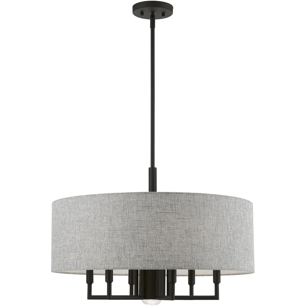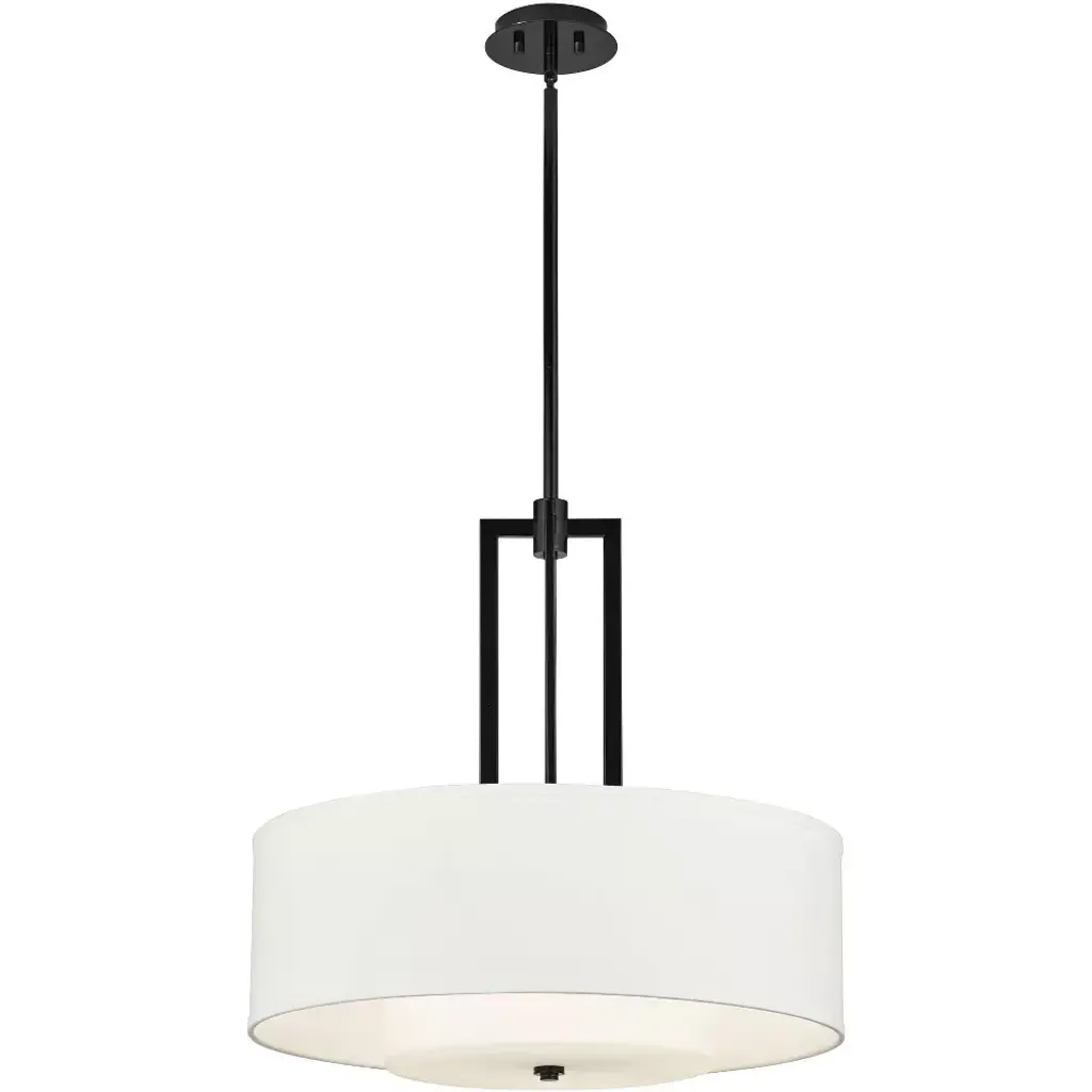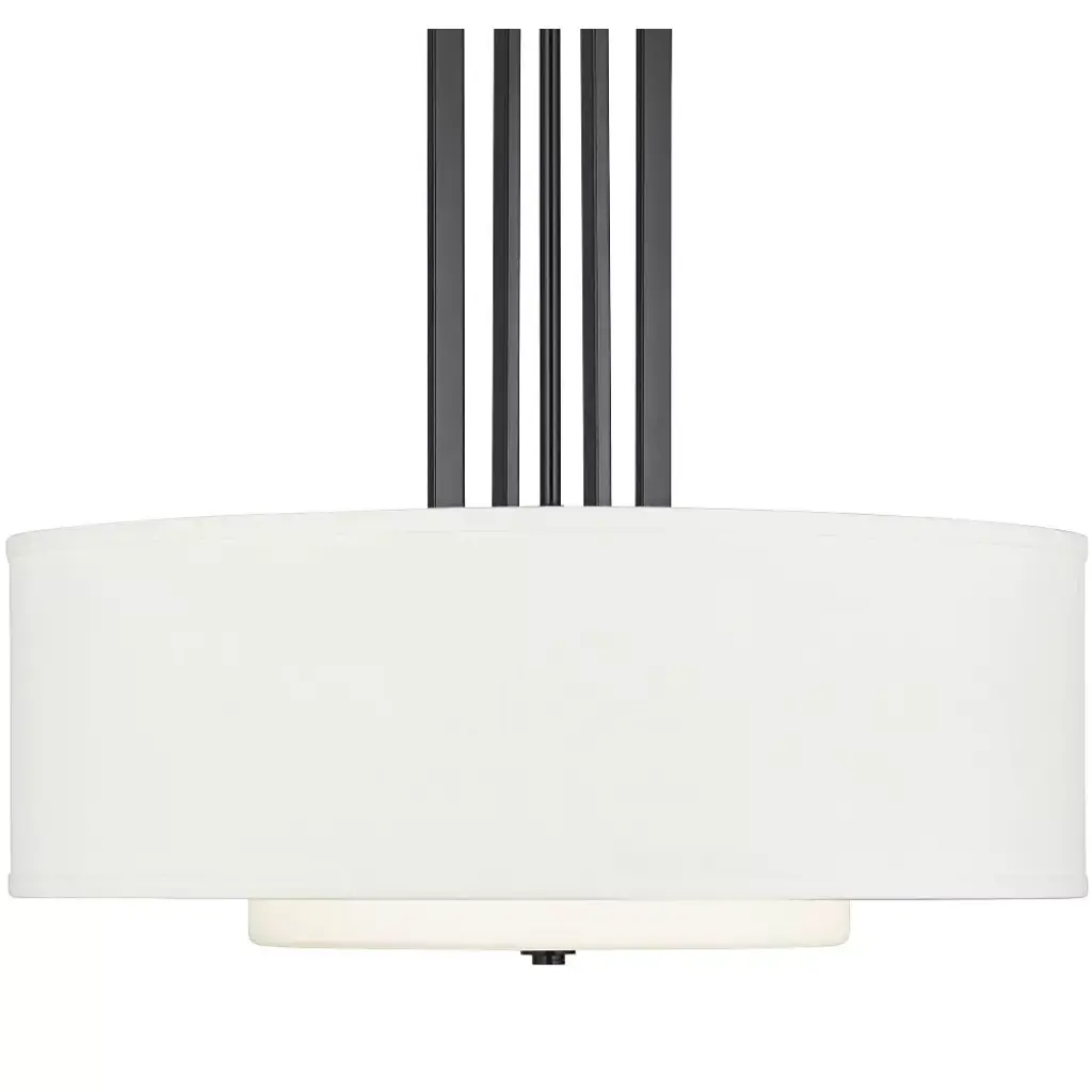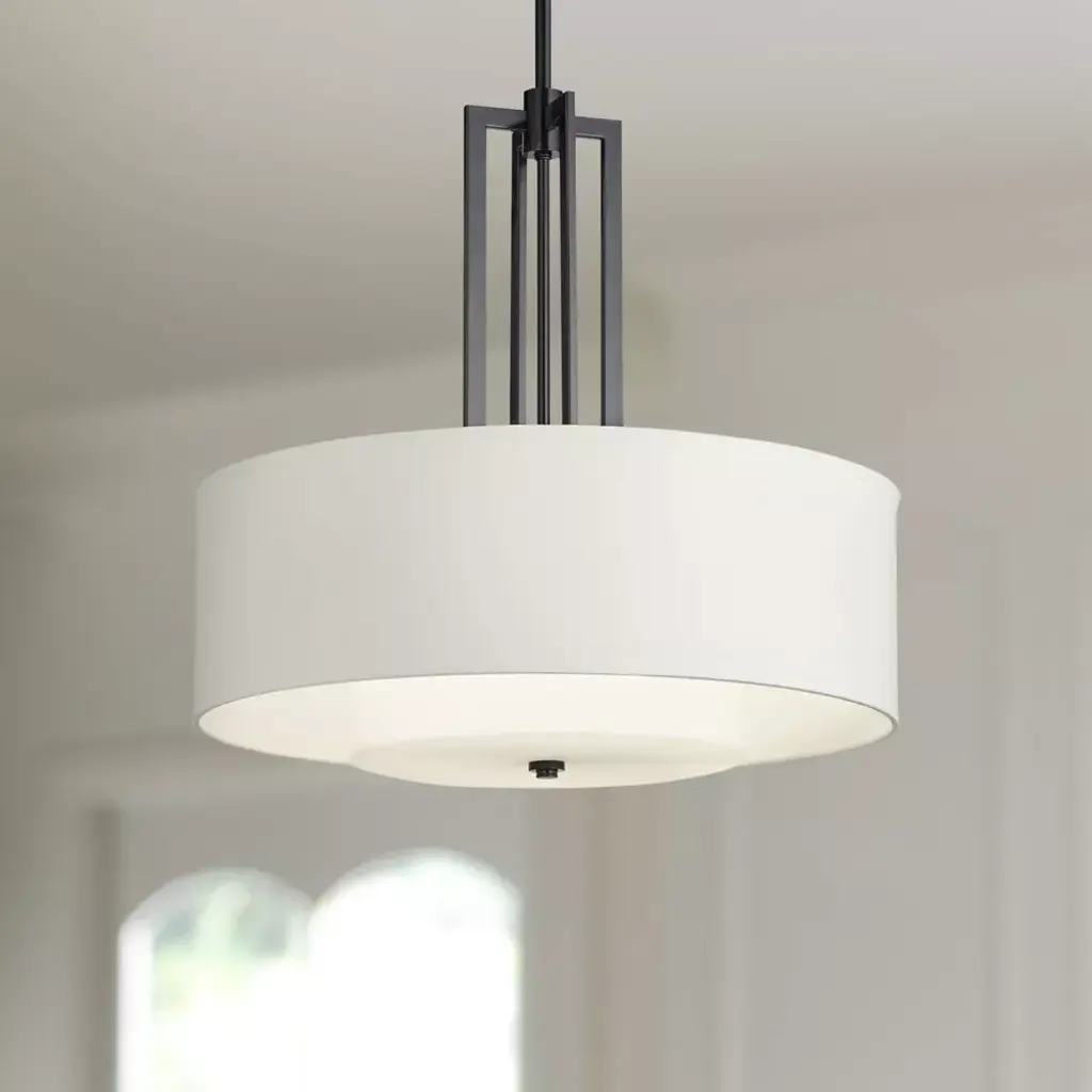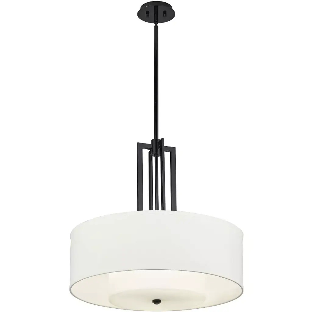 Precise in its elegance, this contemporary drum pendant light features a tiered shade that adds rich dimensionality. From Possini Euro Design®, this striking pendant features a semi-gloss black finish, decorative frame, delivering impressive modernity to your entry or bedroom. Its two-layer shade features an outer drum of off-white linen with an echoing frosted white glass inner shade for excellent light diffusion.