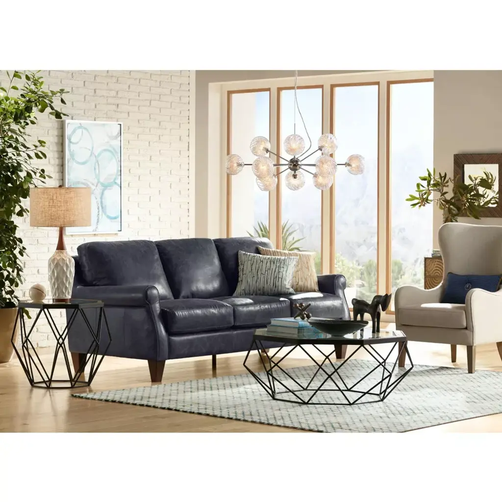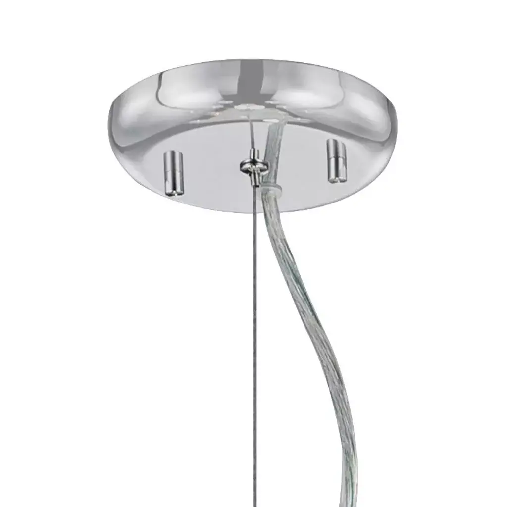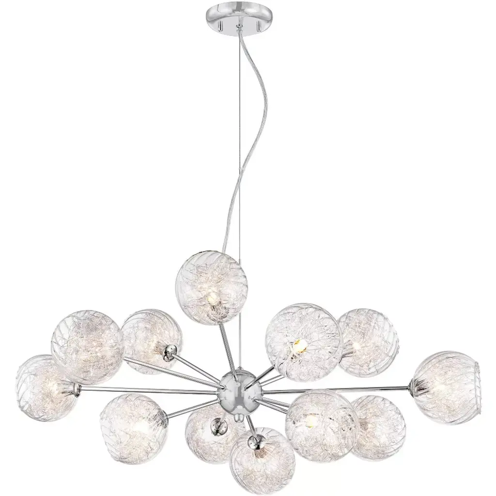 This stunning modern chandelier features a chrome finish center piece upon which twelve arms are mounted. Attached to each arm is a mouth-blown glass cup with a distinctive aluminum wire decoration inside each. The light hangs from a wire and cable attached to a round, chrome finish canopy.