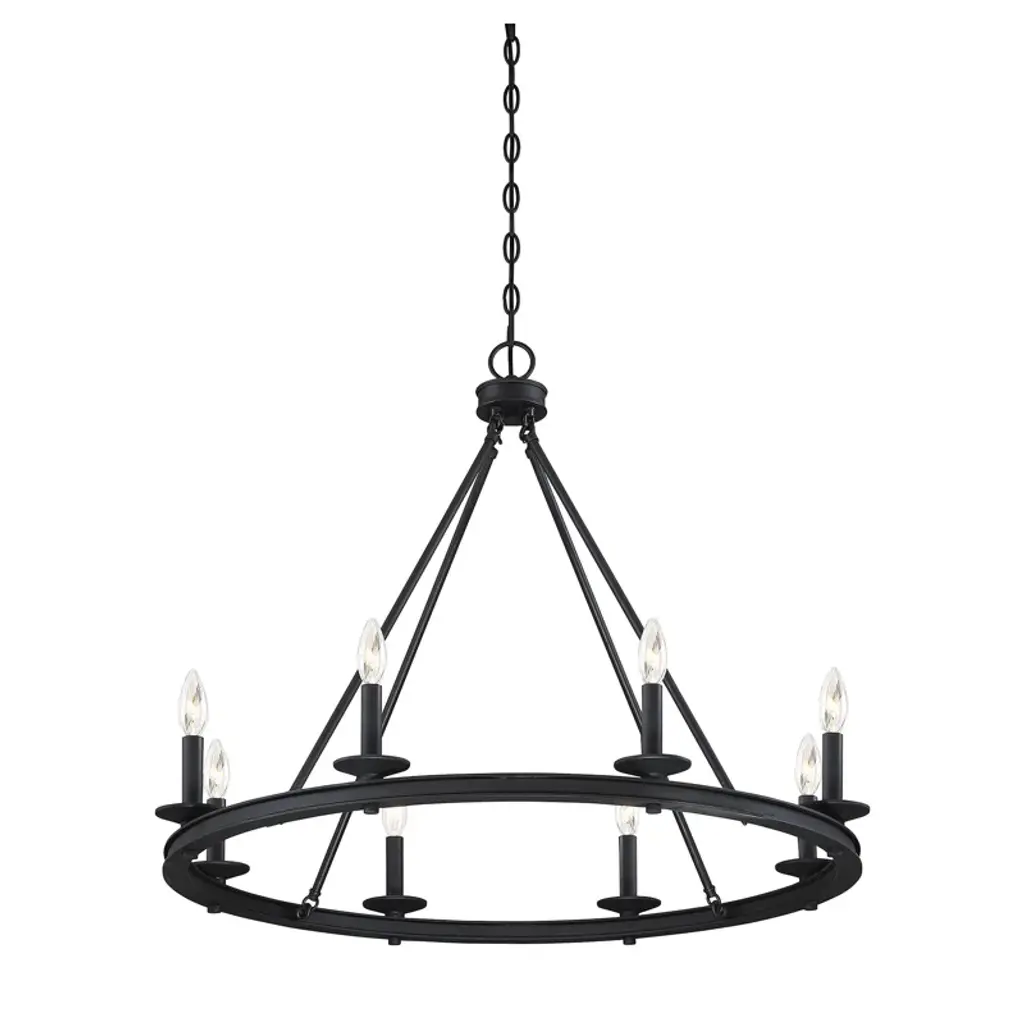The wagon wheel silhouette, exposed candle-style lights, and metallic finish of this chandelier make it a salt-of-the-earth piece that's just right for the farmhouse. Each of the eight lights uses a bulb of up to 60W (we recommend a C11). This piece is crafted from sturdy metal, and is easy to clean with a damp cloth. The pendant comes with a sloped ceiling adapter, so you can hang it wherever you choose. It can also be made dimmable for that "just right" glow, and you can adjust its height using the suspended chain.