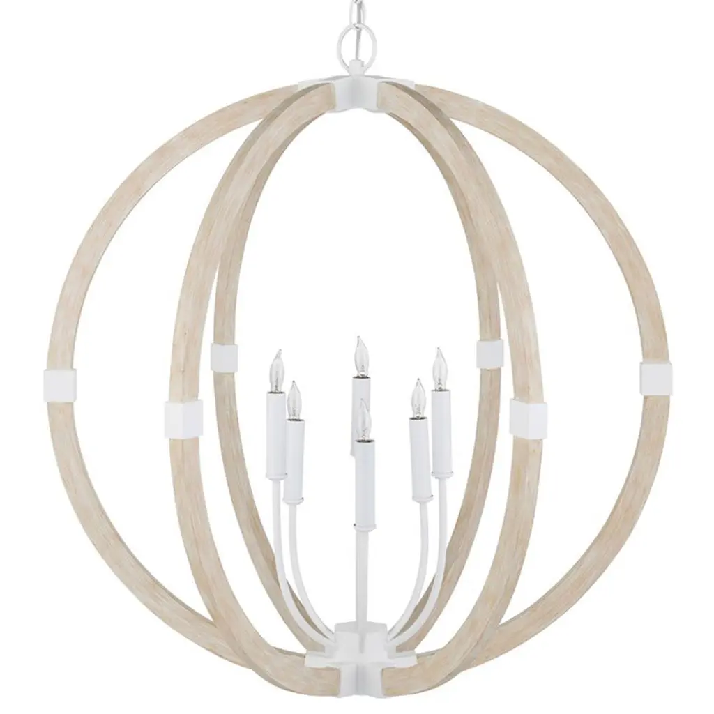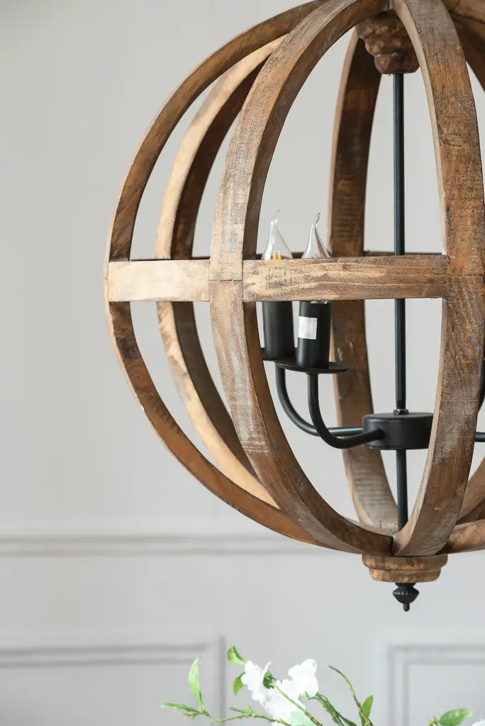 The Design The Pratt Sphere Four-Light Chandelier adds a warm, inviting look to any space with its globe design, rich wood, and contrasting black iron fixture. With its simple style, the Pratt Chandelier enhances a variety of styles with its appealing, versatile look. Hang in a farmhouse kitchen, eclectically-decorated living room, lofty foyer, or above a modern dining table, .