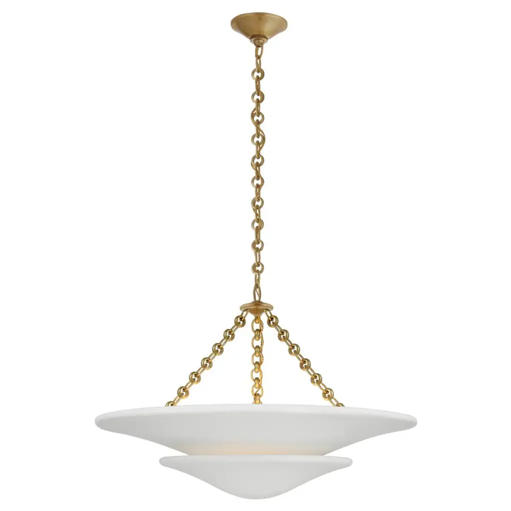 Blending the modern with the traditional, Prattsburgh features a classic shape, unique wrapping technique, and a jewelry-like chain. Open at the center, the disc-shaped shade is wrapped in faux silk, creating a textural pattern that calls to mind a pleated lampshade. Illuminated by an internal LED, this distinctive chandelier emits a glowing halo of light. The Aged Brass finish on the frame gives Prattsburgh a subtly antique feel.