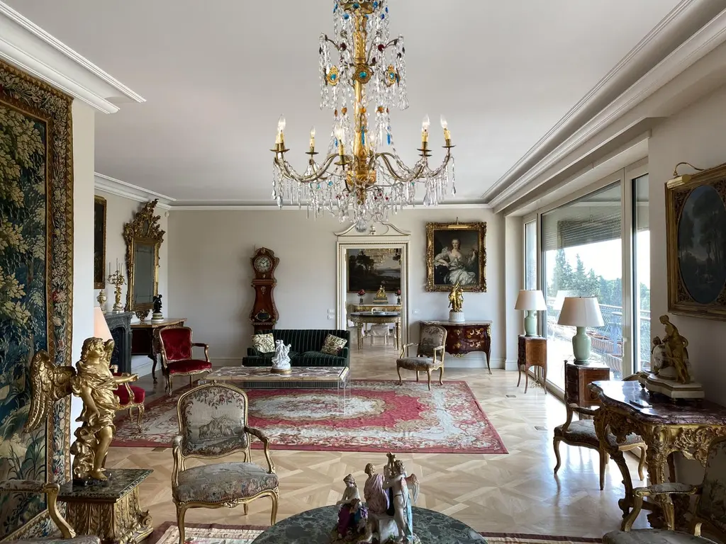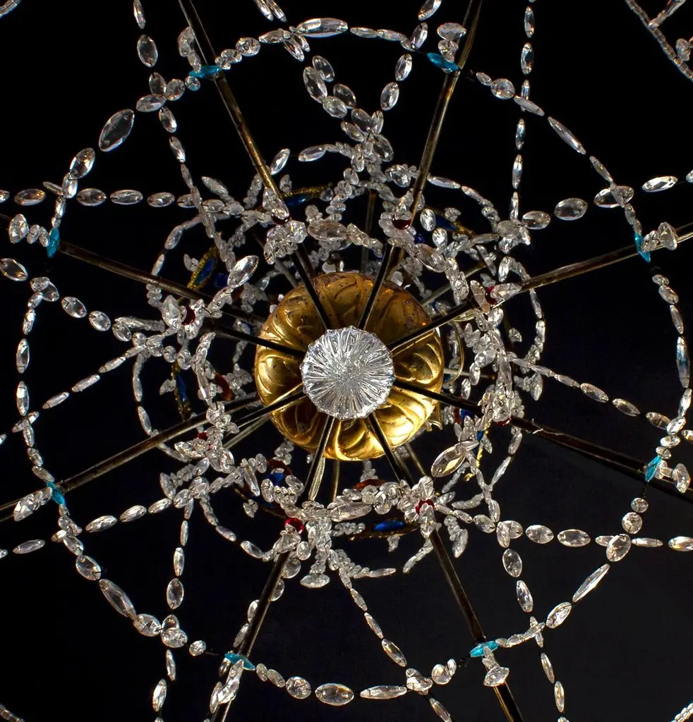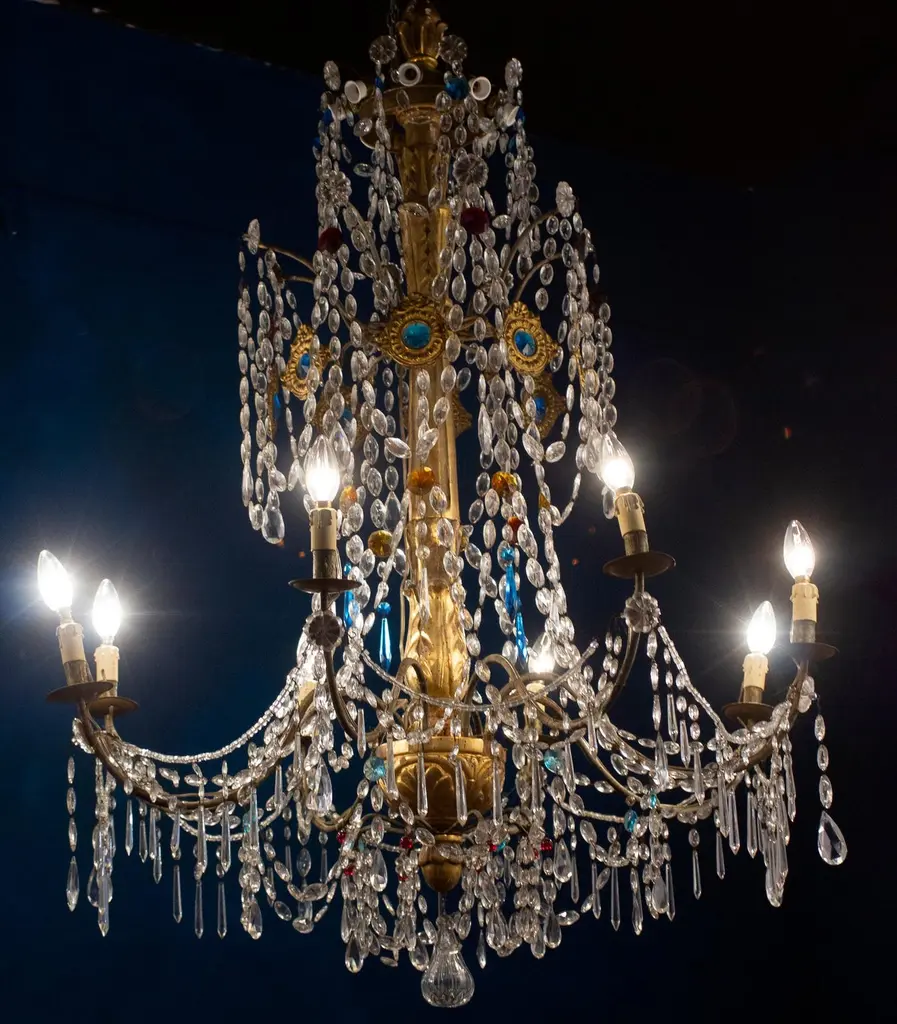 Elegant and finely carved gilt-wood central base with 8 "S" scrolled gilt bronze arms decorated with hundreds of precious crystal drops creating garlands joined by different levels enriched with sapphire and ruby color crystal drops and pendants .Provenience form a Genoese Aristocratic Palace of the 18th century.8 E14 Candle light bulbs.This Chandelier is in original condition but will be delivered cleaned , restored and re-wired, in full working order and ready to use.We will deliver professionally packed in a wooden case.