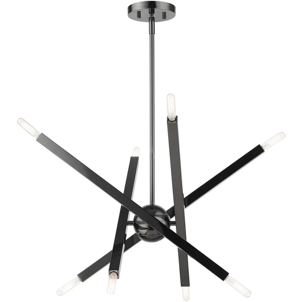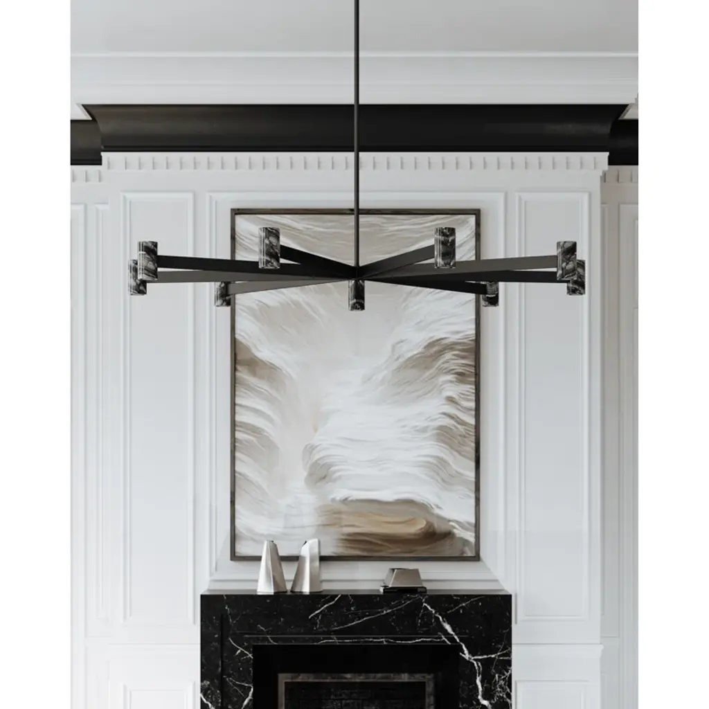 This pared-back chandelier showcases nine cylindrical shades crafted from glossy black + gray Nero Madera marble, each with an integrated LED light. Clean-lined steel arms with a black finish add sleek material contrast, tempering the luxe look with an industrial-inspired element.
