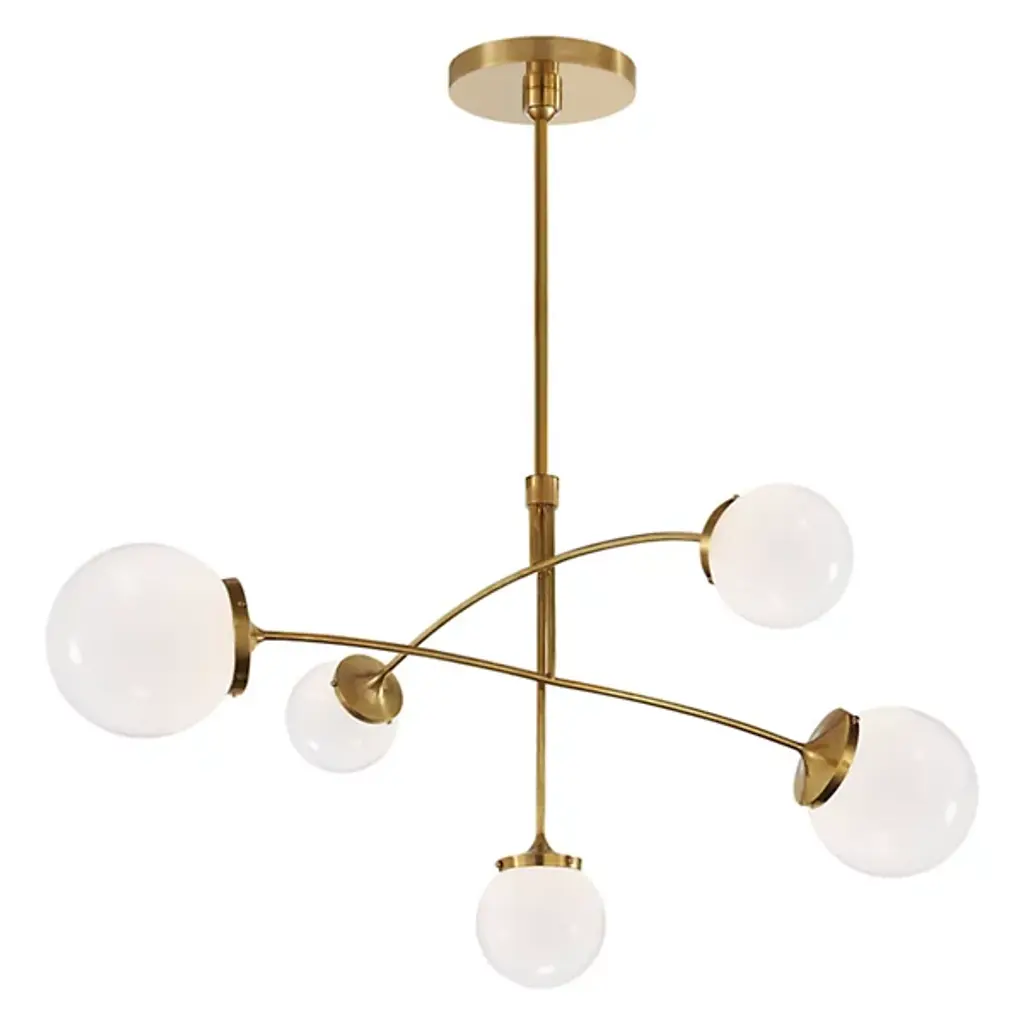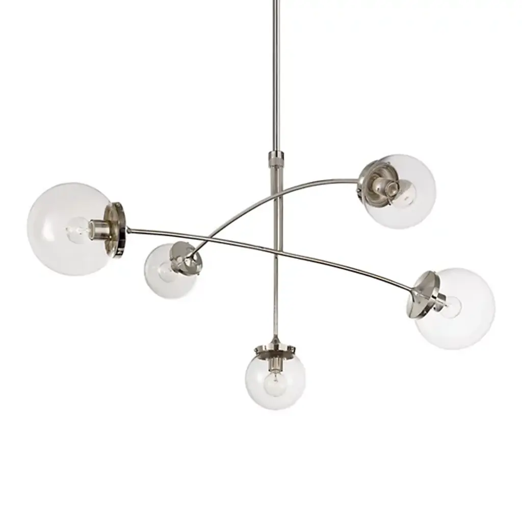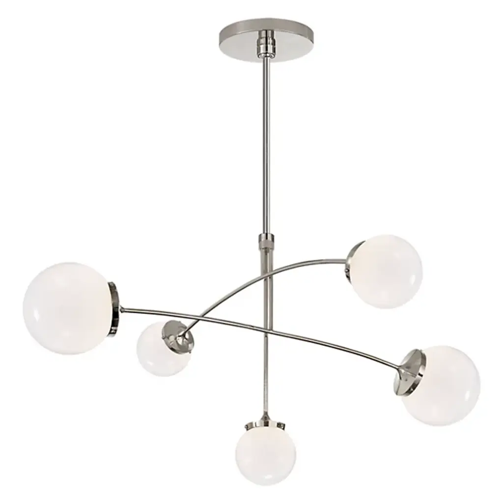 The Prescott Medium Chandelier from Visual Comfort Signature, formerly known as Visual Comfort, adds levity to one’s room through the playful quality of its movement and plump forms. The modern design closely resembles a gravity-defying mobile sculpture. Its slender metal arms feel balanced to perfection as they cross over each other in an asymmetric visual. The shine of the metal enhances the glass at the end. Crafted into globes, the glass shades appear like beautiful bubbles floating across the air. When turned on, each globe fills up with a pleasant warmth to create a soothing atmosphere.