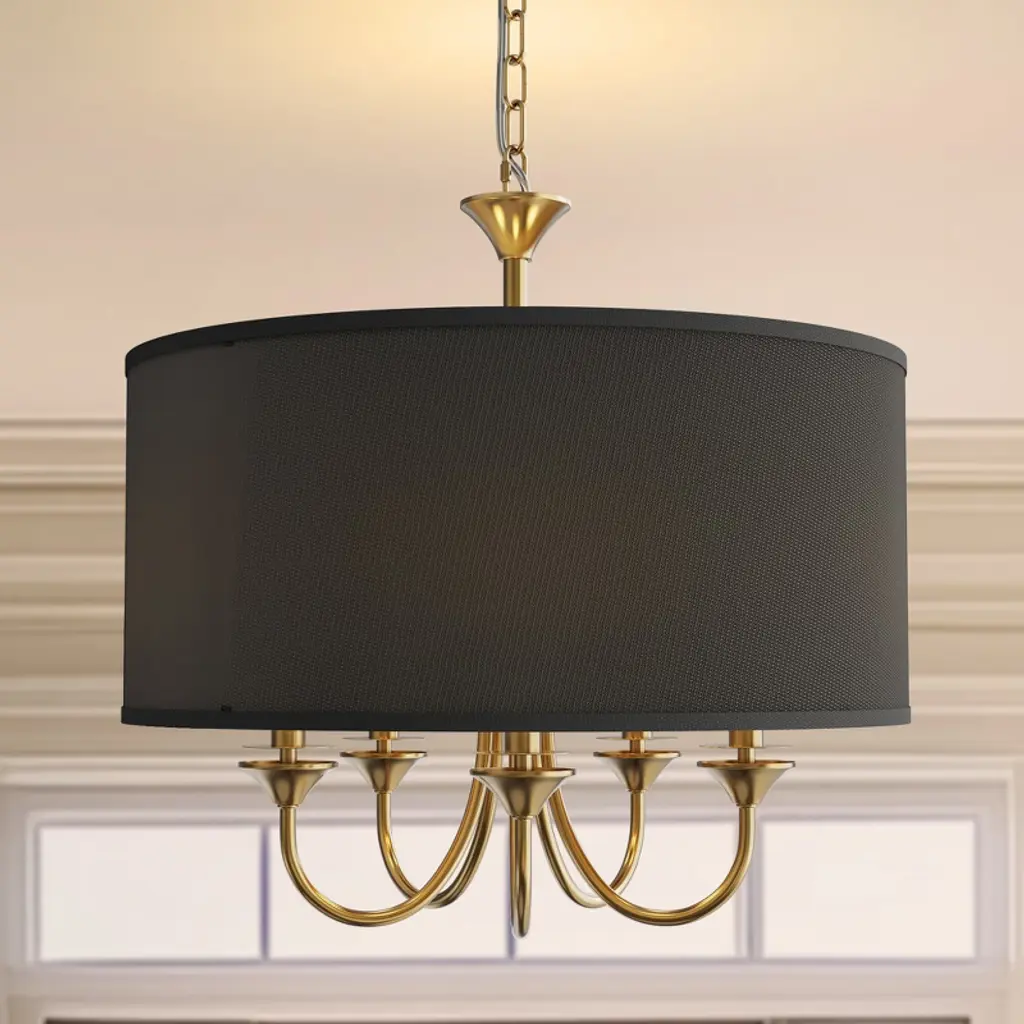 Description Introduce a gorgeous transitional look to your decor with Hampton Hill¡¯s Presidio Chandelier. Featuring a black tapered fabric shade that is able to tilt, this transitional chandelier adds a touch of elegance with the plated brass finish on the metal frame and ceiling cover. The ceiling drop down height is 62.5-inches with a 10-inch black cord to perfectly fit your space. Hardwire this chandelier to your ceiling, could be a sloped ceiling to create a display to illuminate your kitchen or living room. Five Type-B 40-watt incandescent bulbs or five 9-watt CFL light bulbs are needed. Mounting hardware and professional installation is required. Comes with a 2-year warranty. Product Details See below 1 Chandelier:24inDia x 62.5inH Body Size:13.75inDia x 11.25inH Shade Size:23inDia x 24inDia x 8.25inH Socket Size:1inDia x 2inH Canopy Pendants:4.75inDia x 0.75inH Material 75% Iron, 25% Fabric Shade Fabric: 55% cotton, 45% linen Base: Metal Base Finish: Plated Brass