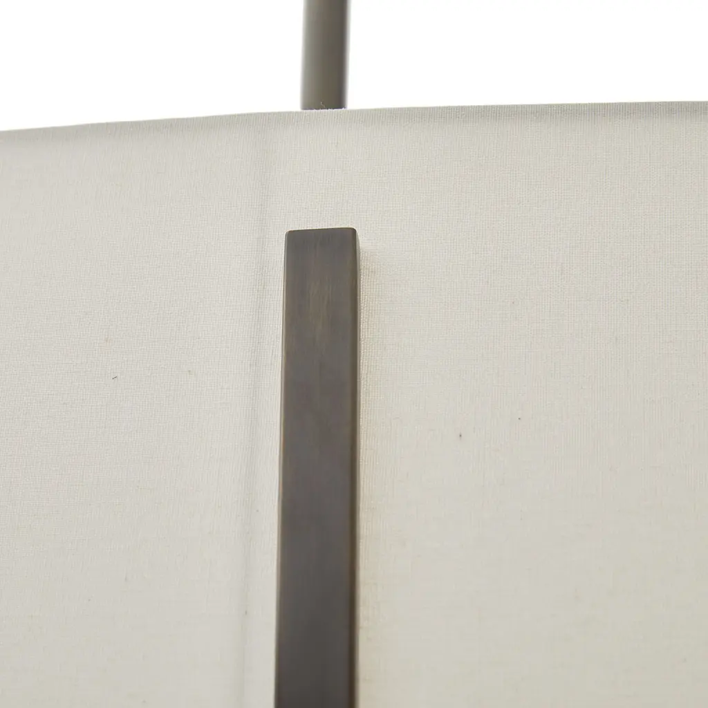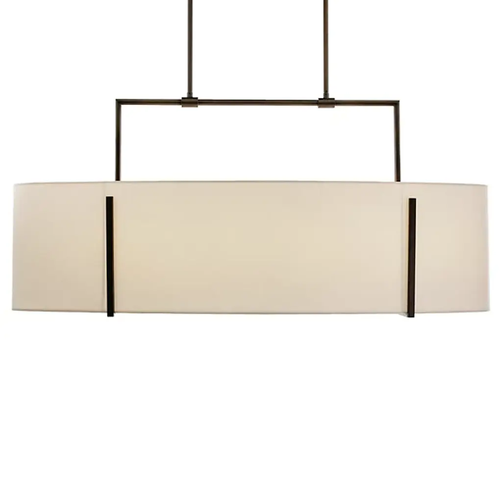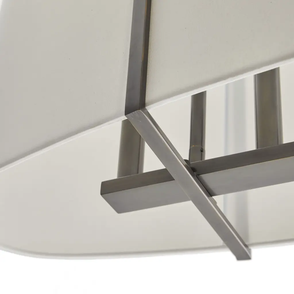 In an inventive linear composition, the Presley is executed in an architectural framework of English bronze steel, which forms a cradle for the chandelier’s canoe-shaped shade. The contrasting materials create a striking juxtaposition, and its crisp, white linen shade casts a soft glow.