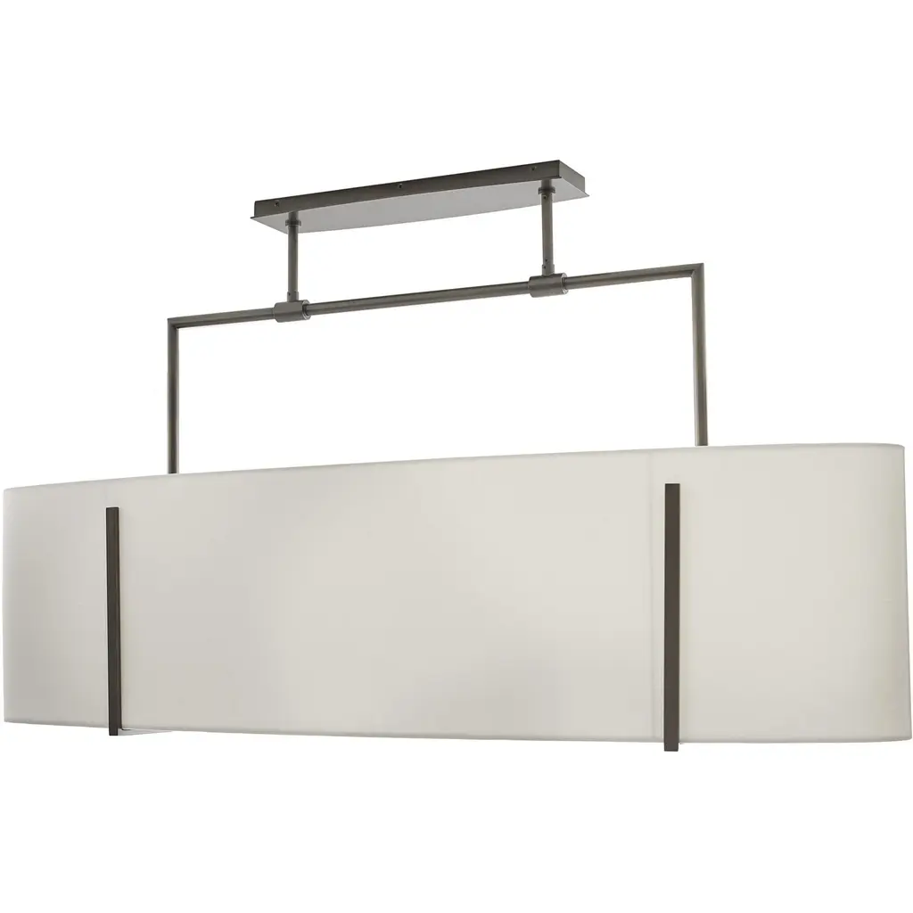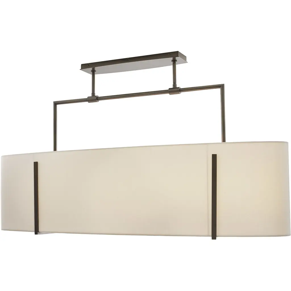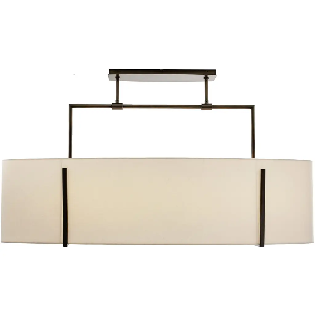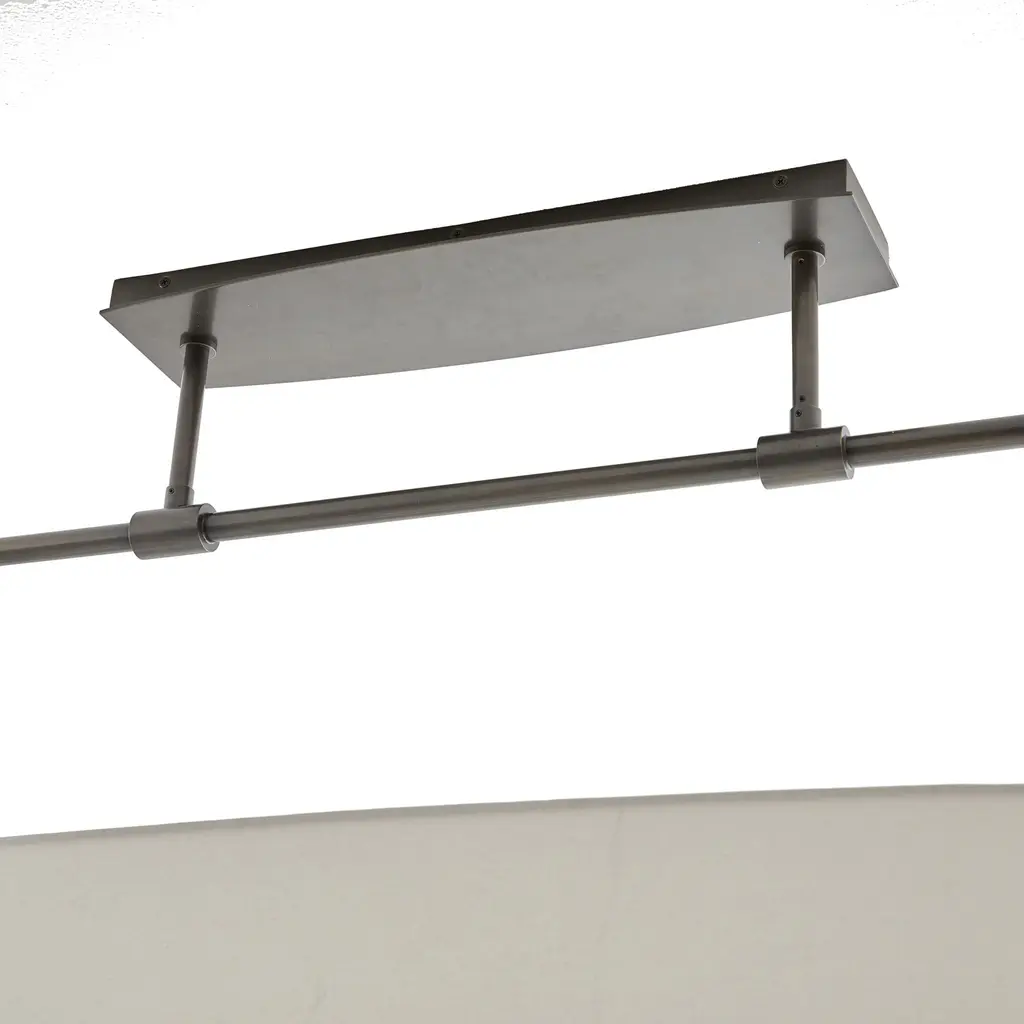 In an inventive linear composition, the Presley is executed in an architectural framework of English bronze steel, which forms a cradle for the chandelier’s canoe-shaped shade. The contrasting materials create a striking juxtaposition, and its crisp, white linen shade casts a soft glow.