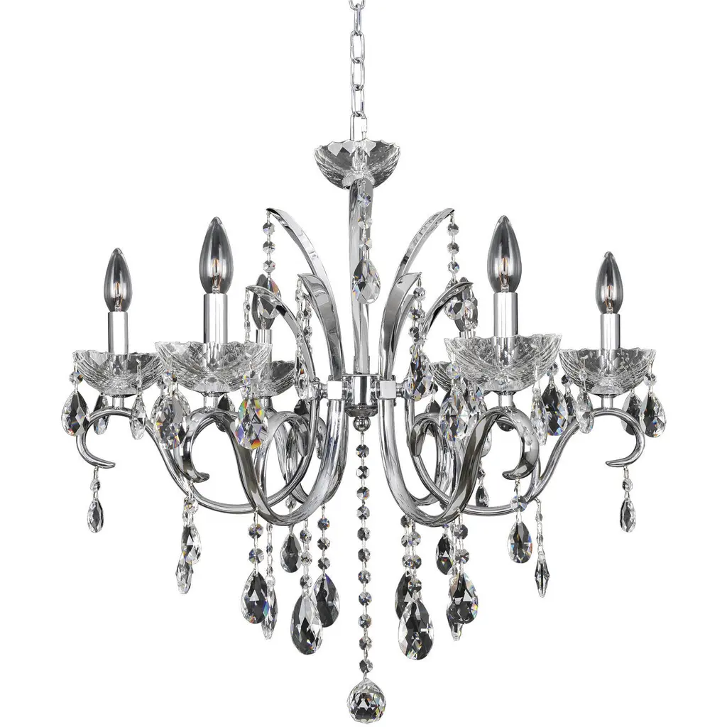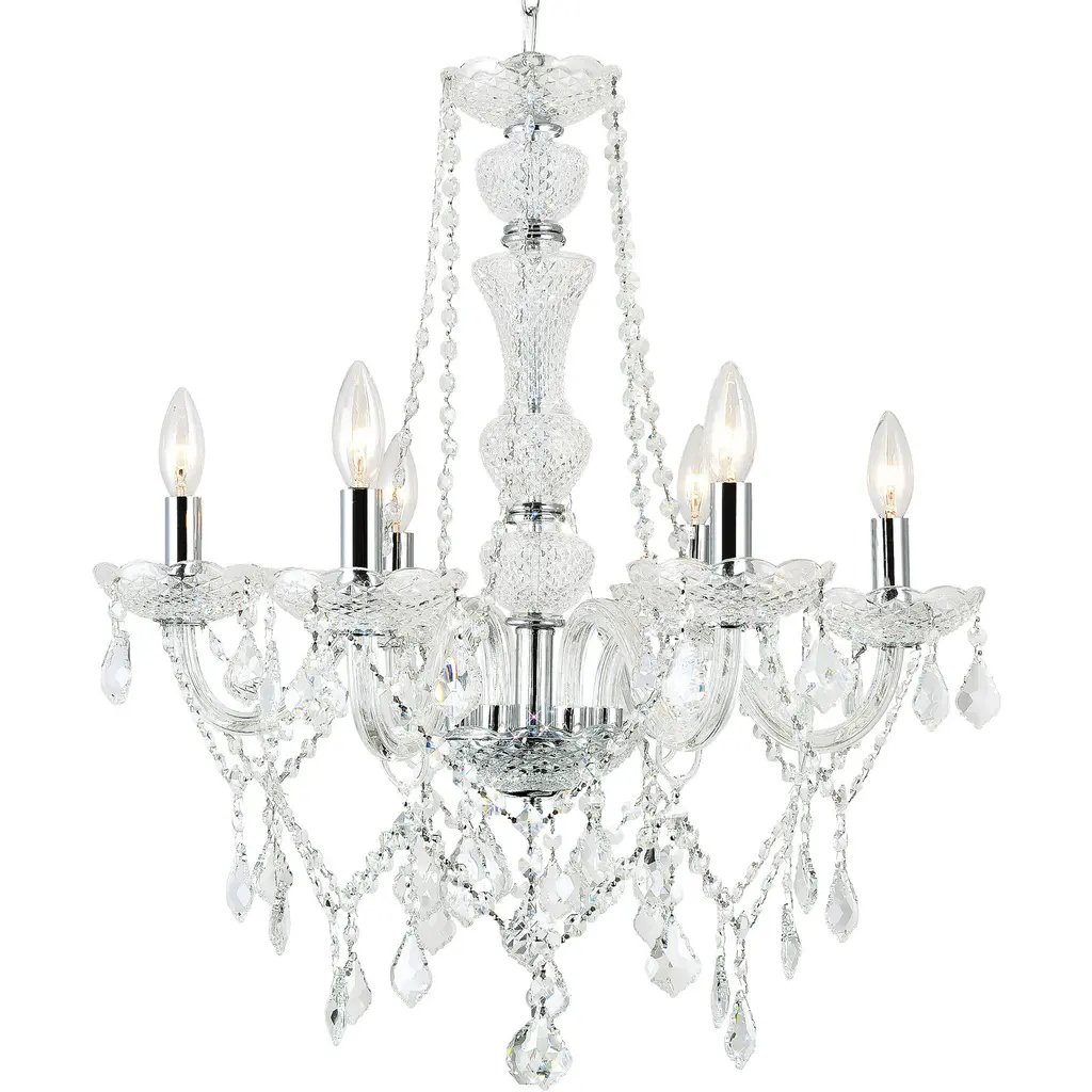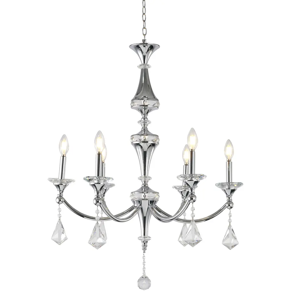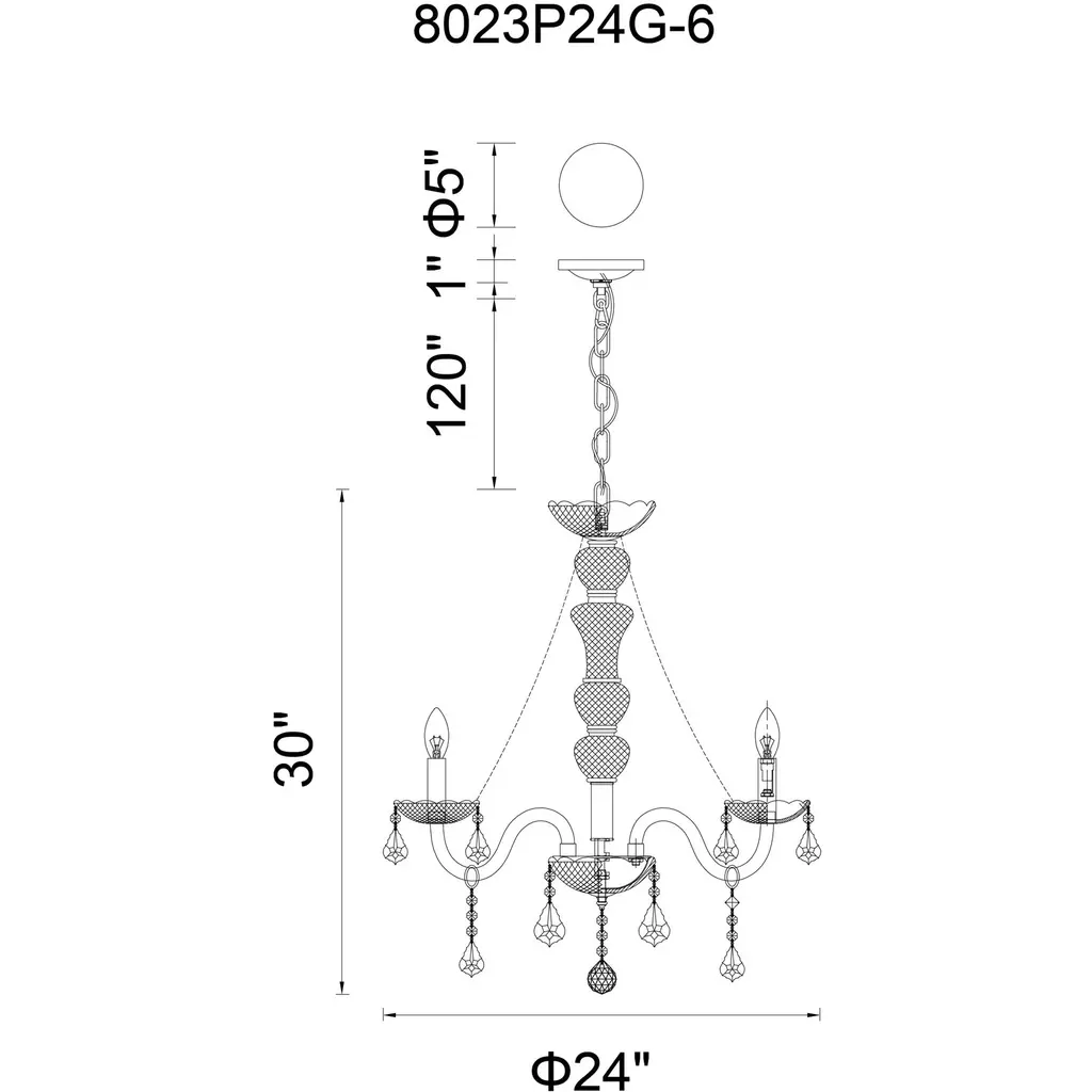 The 24" Princeton 6 Light Chandelier is a statement-making light source with dramatic design. The ornate candelabra silhouette is further enhanced by the presence of draping strings of crystals. Finished with candelabra bulbs that emit a soft and warm glow, this down chandelier will provide your space the perfect ambiance to gather your loved ones.