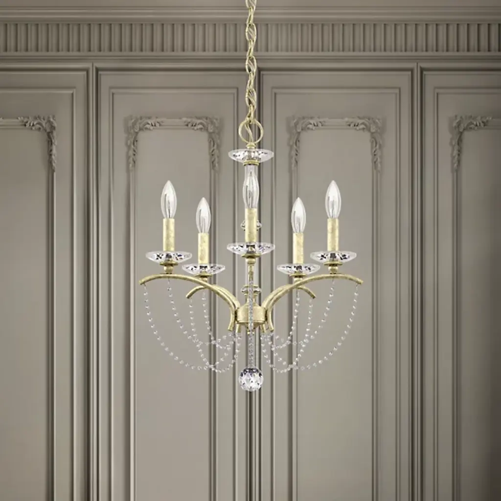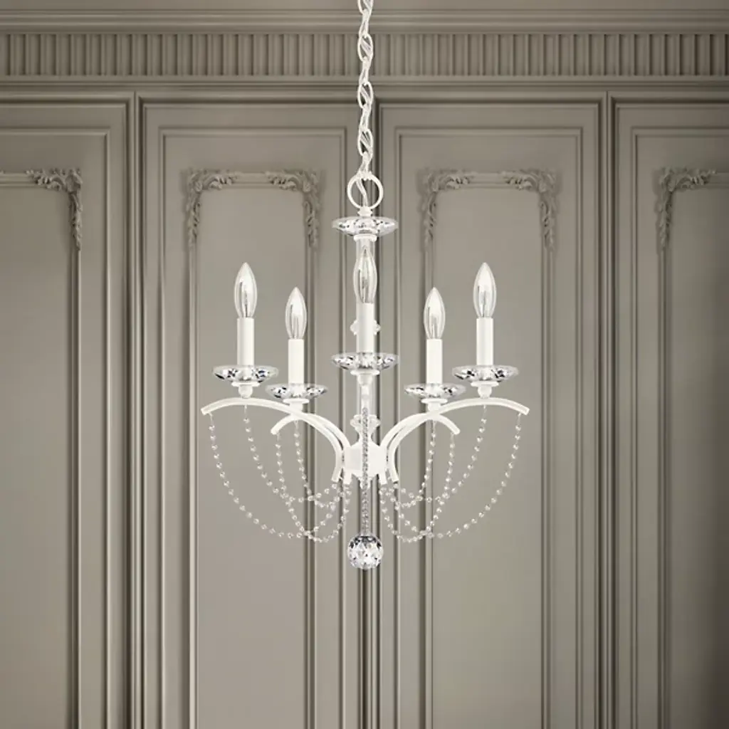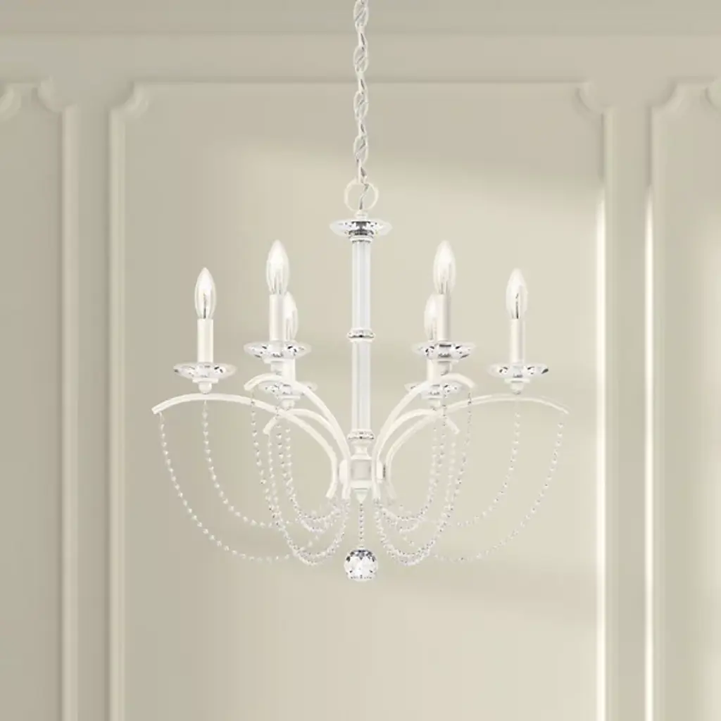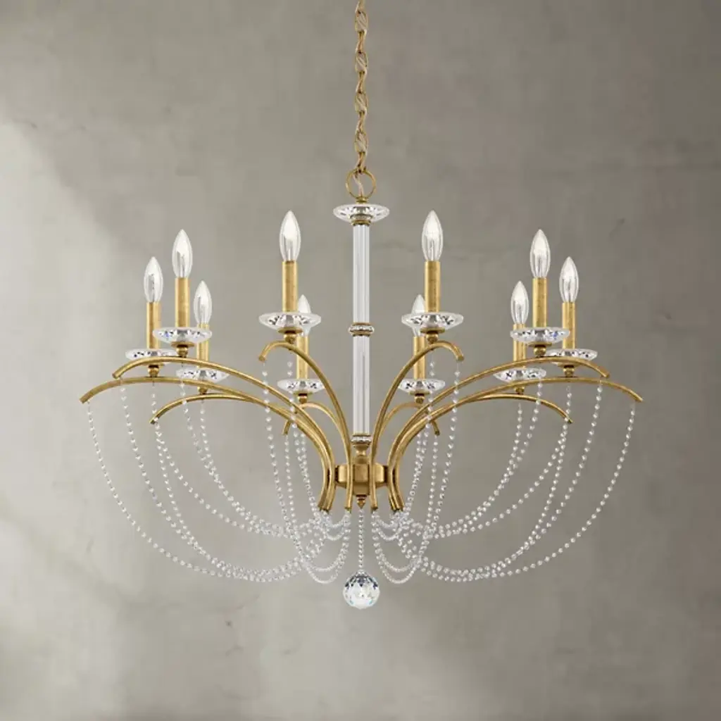 Bring a stately style to your inside spaces with the elegant and appealing lines of the Priscilla Chandelier from Schonbek Lighting. A stylish transitional piece with elegant retro lines, it relies on a two-tier canopy structure and single central chain to support a multi-armed structure of smooth steel below. The fixture employs a central column of Bohemian crystal while contrasting the steel structure with a set of clear crystal dish bobeches. Finally, elegant chains of translucent orb accents drape like pearls below each arm, lending the refinement of rich jewelry to an already captivating fixture.