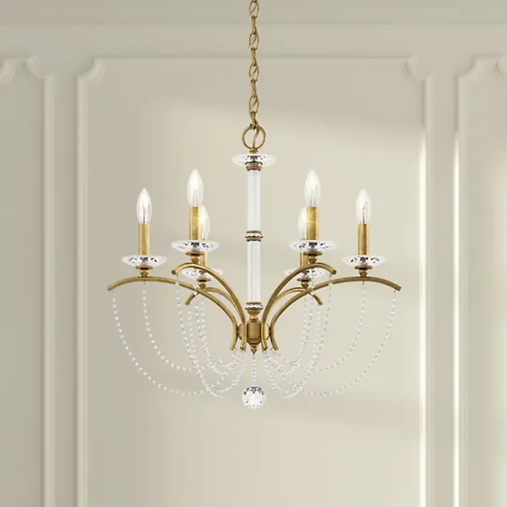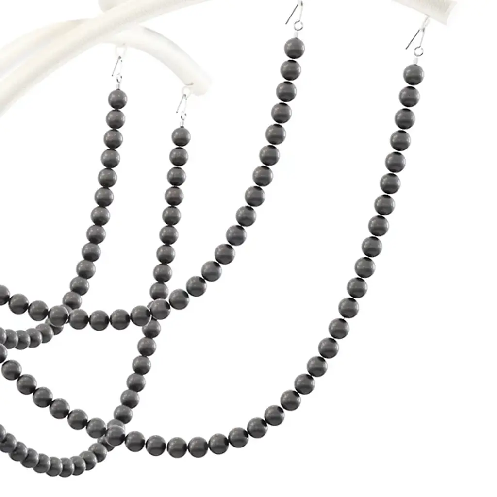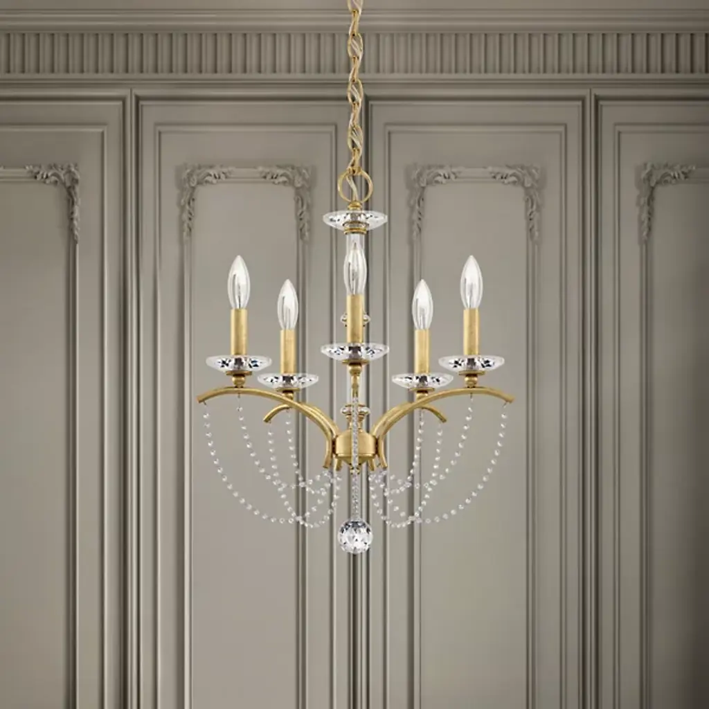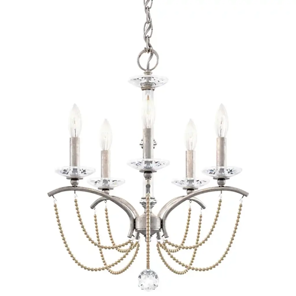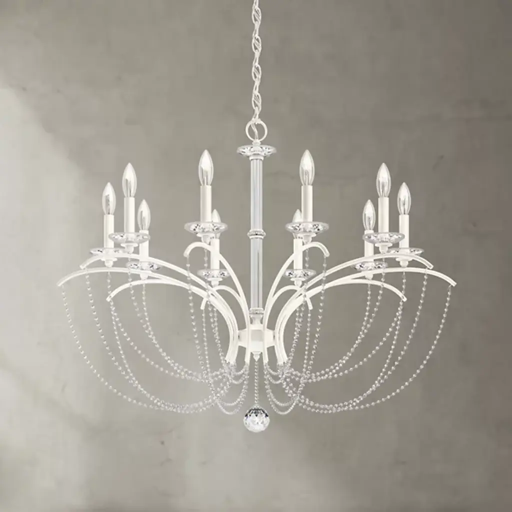 Bring a stately style to your inside spaces with the elegant and appealing lines of the Priscilla Chandelier from Schonbek Lighting. A stylish transitional piece with elegant retro lines, it relies on a two-tier canopy structure and single central chain to support a multi-armed structure of smooth steel below. The fixture employs a central column of Bohemian crystal while contrasting the steel structure with a set of clear crystal dish bobeches. Finally, elegant chains of translucent orb accents drape like pearls below each arm, lending the refinement of rich jewelry to an already captivating fixture.