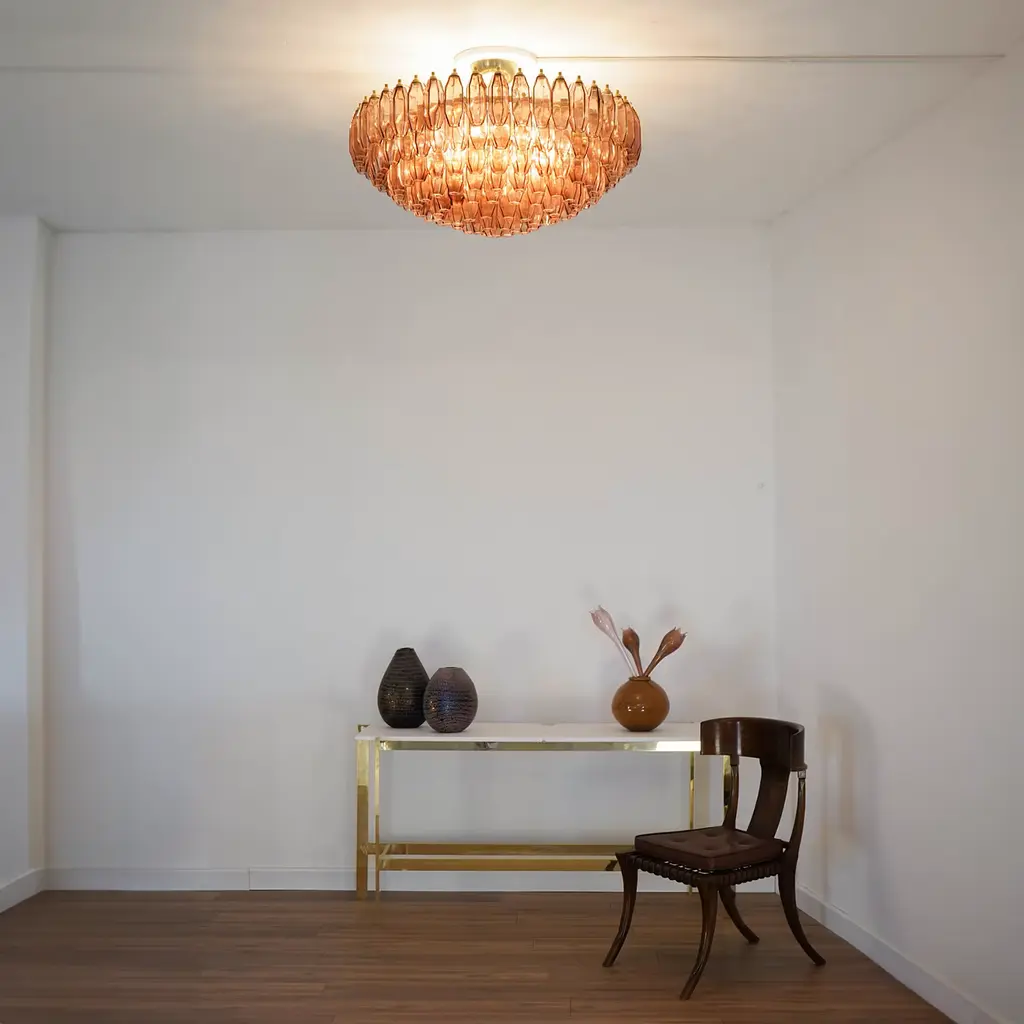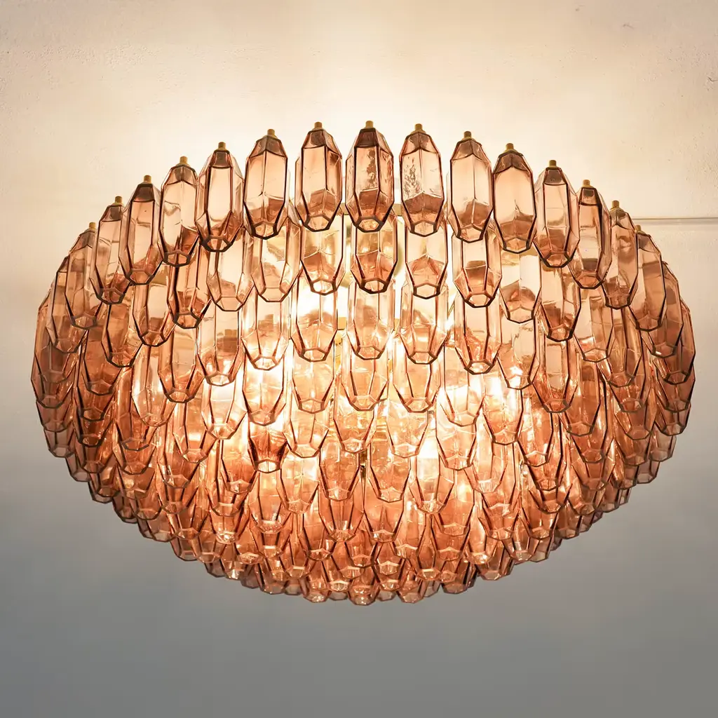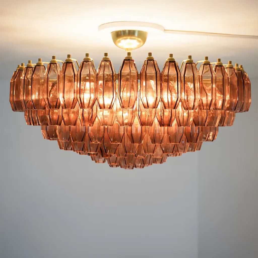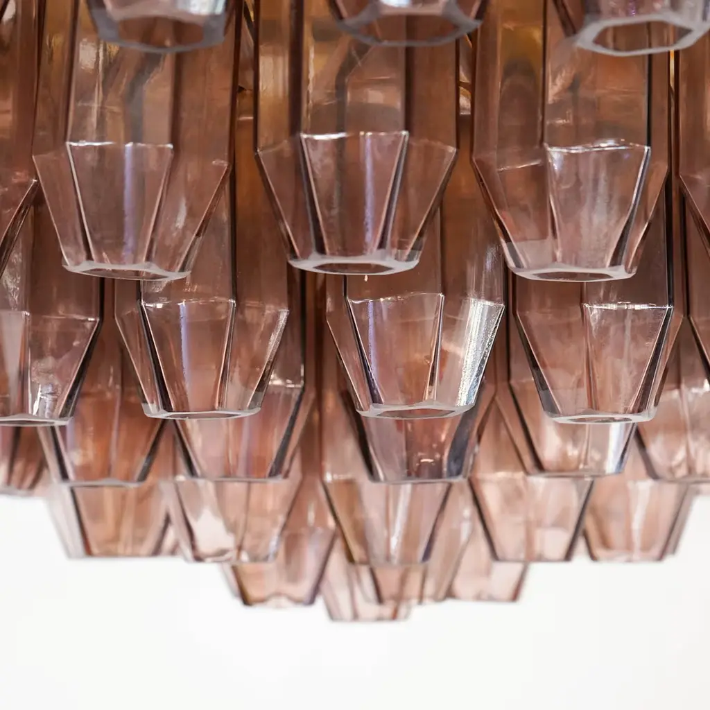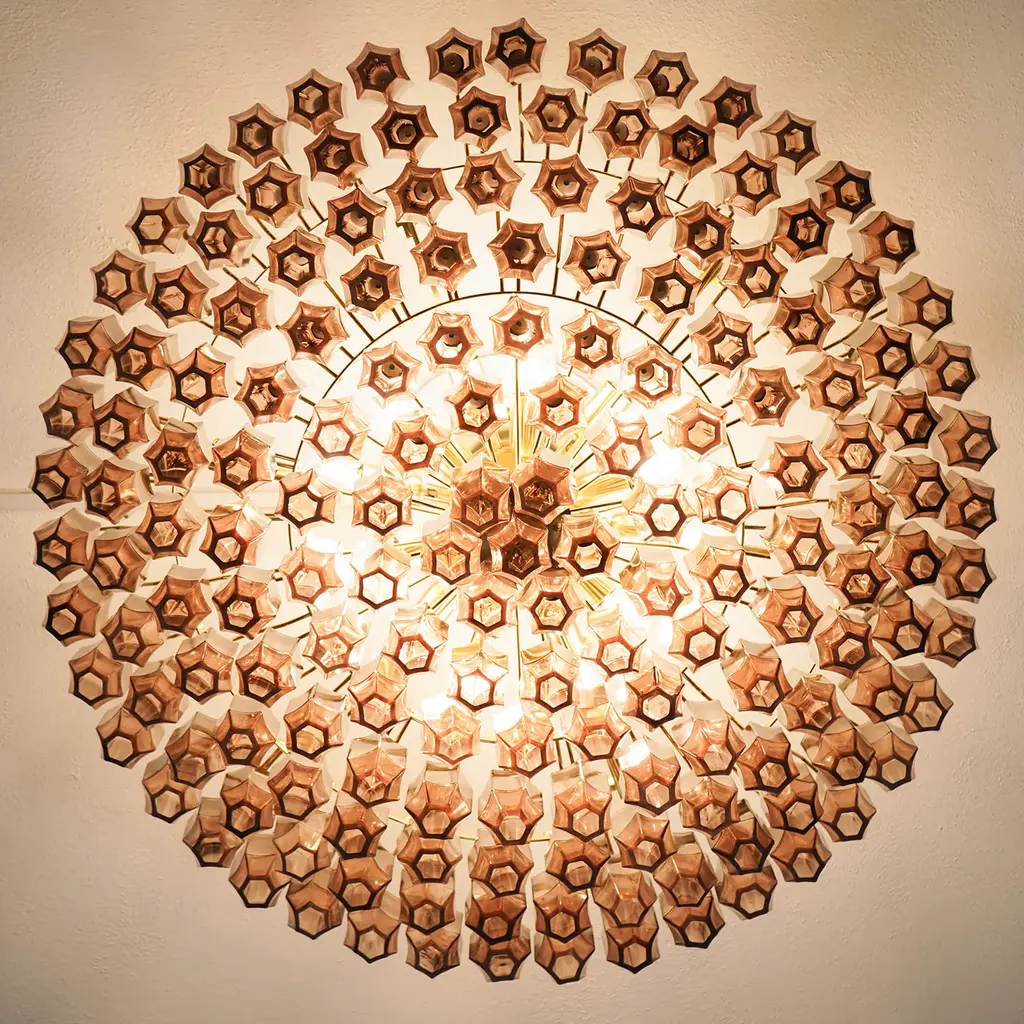 A splendid cluster of 169 mouth-blown amber glass elements shaped like pencils imbues this chandelier with a luxurious charm. Thanks to a special double magnifying lens design, each glass element contributes to the clever concealing of the brass hardware structure while offering a perfectly homogeneous and sophisticated light output. Please explore available variants with the Concierge.