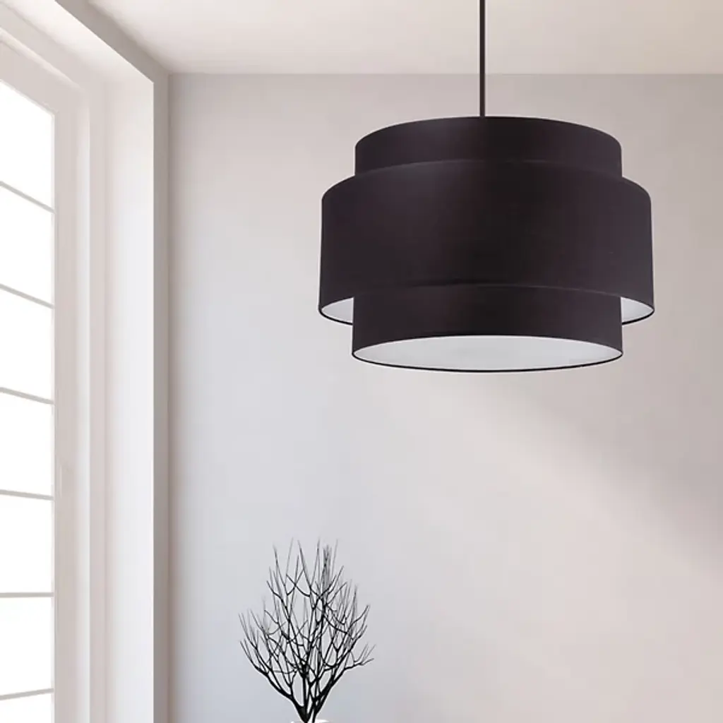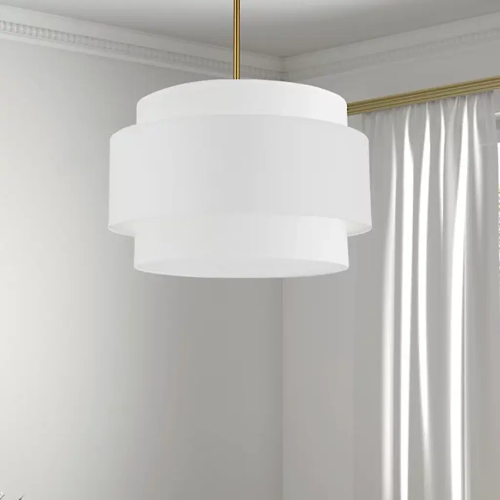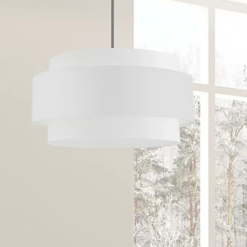 Clean, airy geometry for modern or transitional interiors. The Priya Chandelier by Dainolite is comprised of 3 fabric drum shades, with the largest one placed in the middle so that it appears to float around the smaller ones sitting above and below. The shades work together to produce a multi-layered wash of ambient light around a space, while the open bottom enables a bright wash of direct downlight onto a dining table or foyer.
