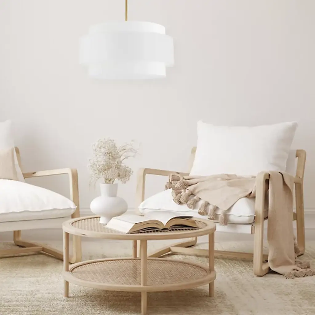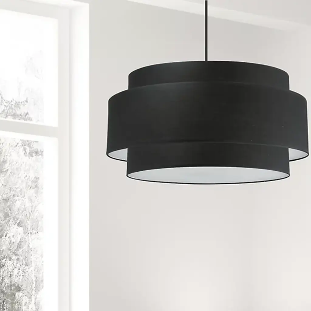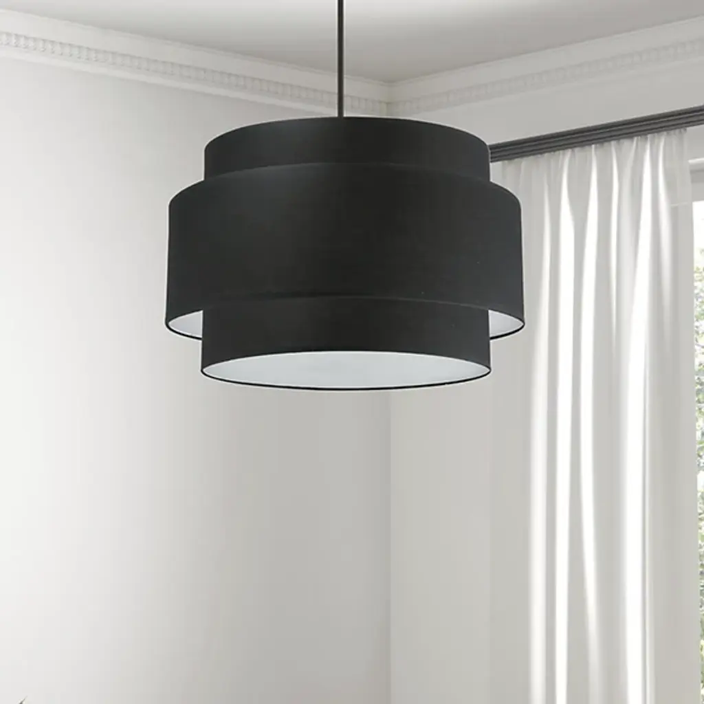 Clean, airy geometry for modern or transitional interiors. The Priya Chandelier by Dainolite is comprised of 3 fabric drum shades, with the largest one placed in the middle so that it appears to float around the smaller ones sitting above and below. The shades work together to produce a multi-layered wash of ambient light around a space, while the open bottom enables a bright wash of direct downlight onto a dining table or foyer.