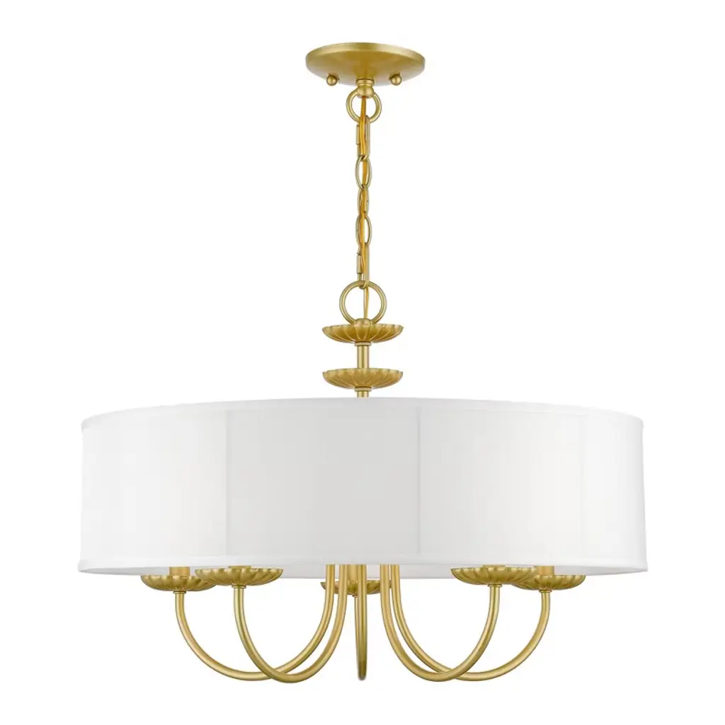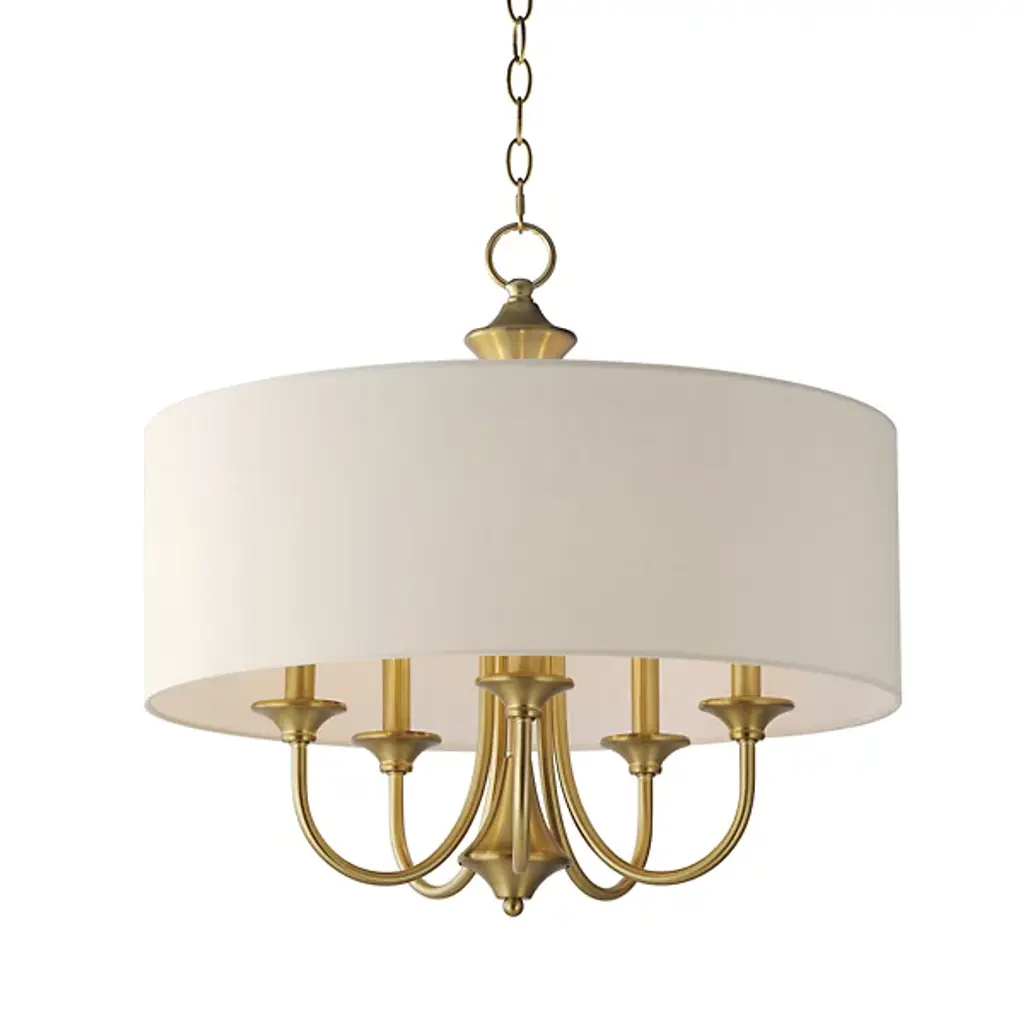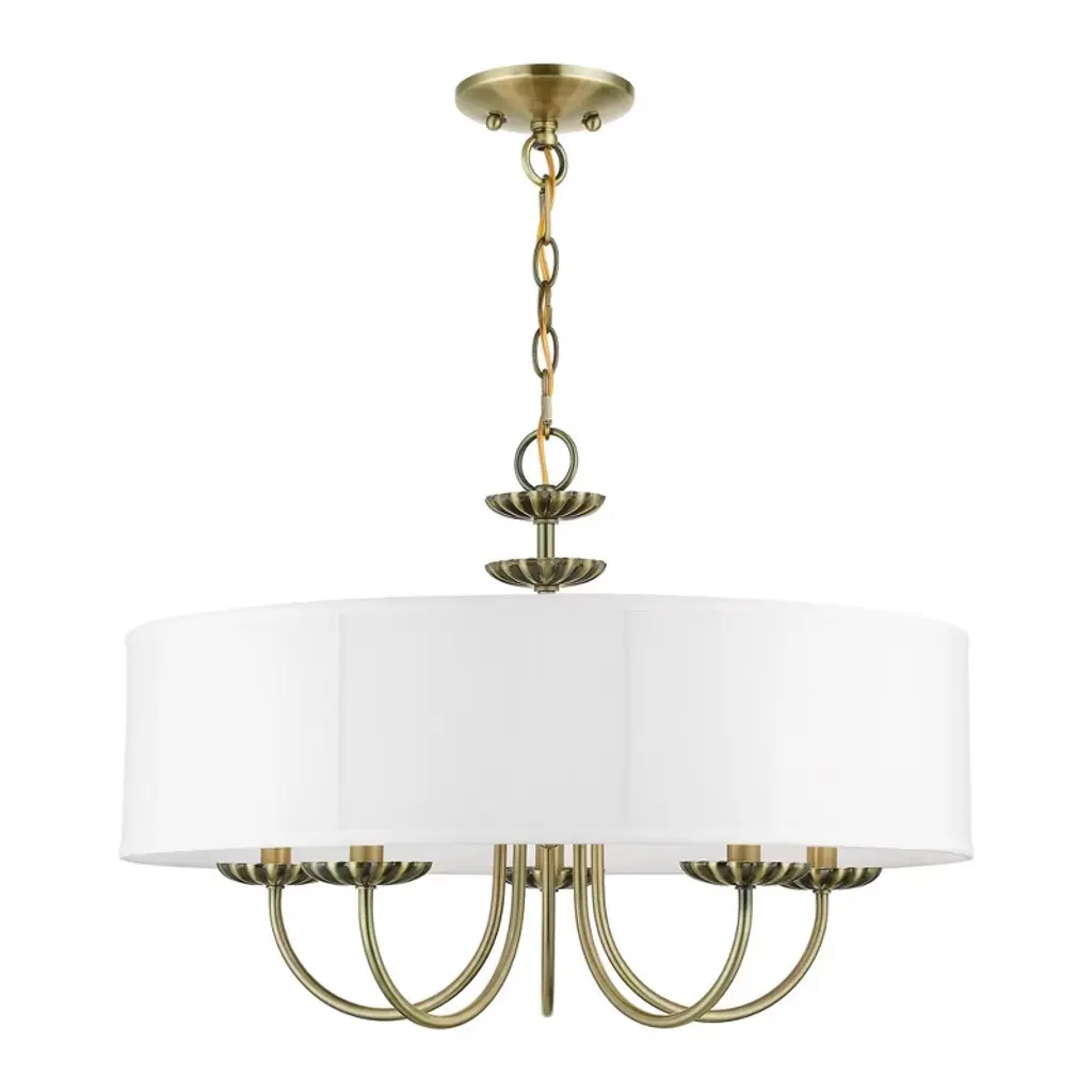 Introducing the Progress Lighting Drum Shade Collection Chandelier, a stunning addition to your home decor. Crafted from durable steel with a brushed bronze finish, this chandelier exudes elegance and charm. The 21.63" width, 21.13" height, and 21.63" length make it a perfect centerpiece for your space. The 42" chain length allows for customizable installation. With a dry rating, it's suitable for most indoor settings. This chandelier features a drum shade with a crisp white textured fabric, creating a country-casual ambiance. The fixture accommodates 5 incandescent bulbs with a maximum wattage of 60 watts each, offering ample illumination. It's also compatible with dimmable bulbs, allowing you to set the perfect mood. Elevate your home with the timeless beauty of the Progress Lighting Drum Shade Collection Chandelier.