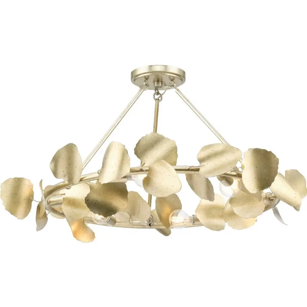 Introducing the Laurel Collection from Progress Lighting, where natural beauty meets elegant design. This stunning fixture is handcrafted from steel with gently curving leaves finished in a richly blended gilded silver patina, adding a touch of timeless sophistication to any space. With a width of 28" and a height of 14.5", this damp-rated fixture is perfect for halls, foyers, bedrooms, and living rooms. It accommodates 6 incandescent bulbs with a wattage of 60 watts each, creating a soft, ambient glow. The fixture is part of the Progress Lighting Design Series, offering fashionable styles and affordable luxury lighting for the home. Backed by a 1-year limited warranty, this fixture includes installation instructions and mounting hardware for easy setup. Elevate your space with the natural, whimsical leaves and sophisticated lines of the Laurel Collection.