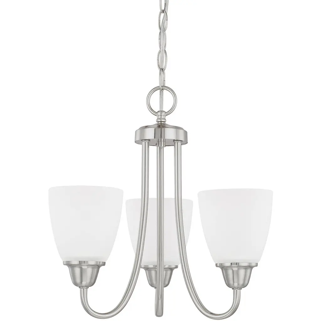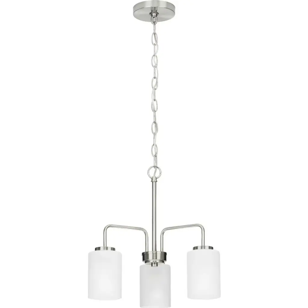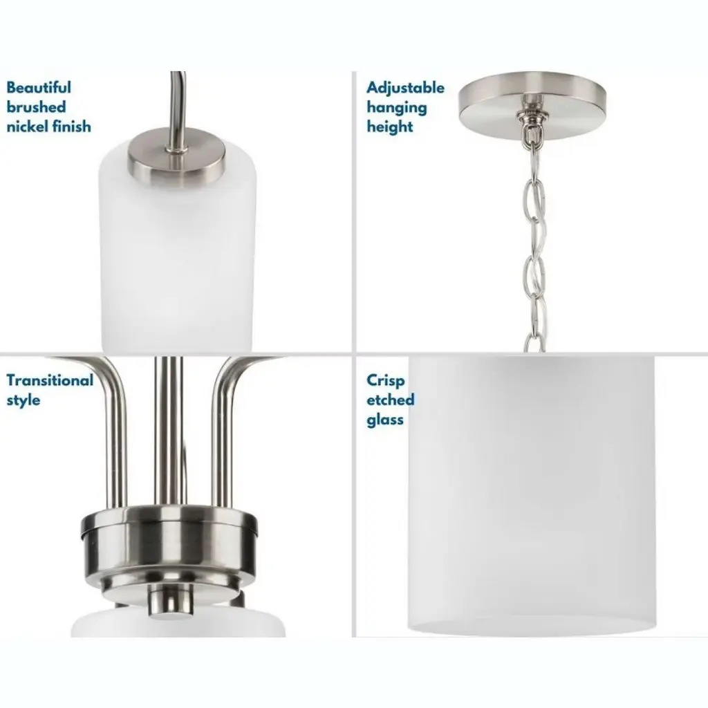 Introducing the Merry Collection 3-Light Etched Glass Brushed Nickel Linear Chandelier Light by Progress Lighting. Crafted from durable steel with a sleek brushed nickel finish, this 18" wide, 16.37" high, and 18" long chandelier exudes a clean, contemporary design. The three incandescent bulbs emit a generous, elegant glow through crisp etched glass shades, creating a modern retreat in your living space. With a dry rating, this chandelier is suitable for indoor use. The 48" chain allows for adjustable hanging length, and the 5.12" canopy is included for easy installation. Elevate your space with the perfect blend of transitional and modern character.