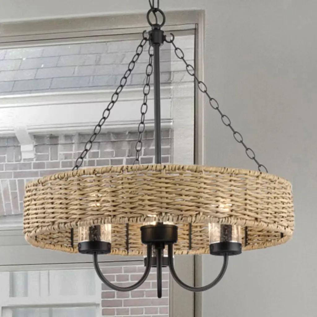Introducing the Pembroke outdoor collection from Progress Lighting. This classic yet casual chandelier features a weather-resistant handcrafted mocha rattan shade suspended by a trio of chains finished in matte black. Inside, three seeded glass columns top the gracefully curved arms, casting softly diffused light onto outdoor surfaces. The woven rattan and seeded glass shades offer soft ambient lighting, perfect for coastal, rustic, and transitional outdoor spaces. Measuring 20" in width and 21.5" in height, this damp-rated chandelier uses three 60-Watt medium base bulbs (sold separately) and is dimmable when used with dimmable bulbs. CETLus Damp Location listed, it comes with a 1-Year Limited Warranty and includes installation instructions and mounting hardware for easy setup. Elevate your outdoor entertaining spaces with the Pembroke outdoor chandelier.