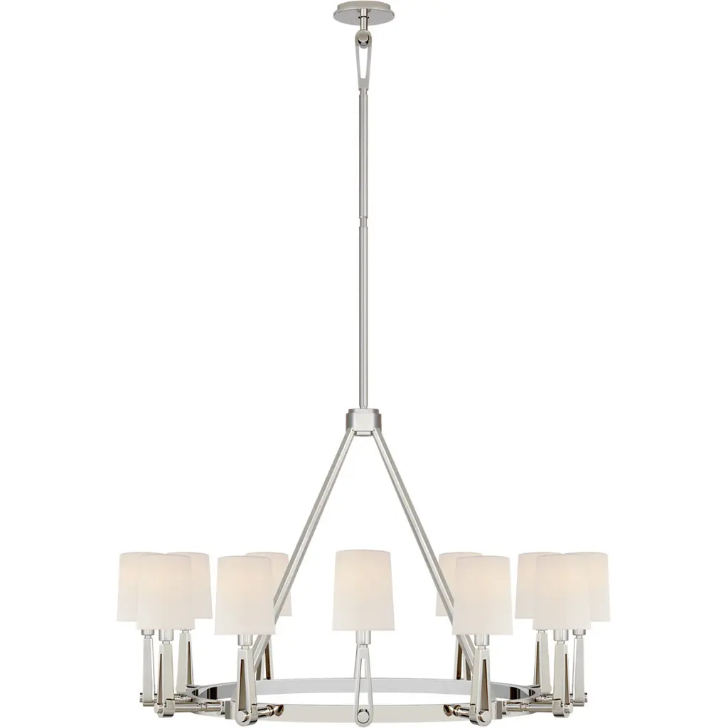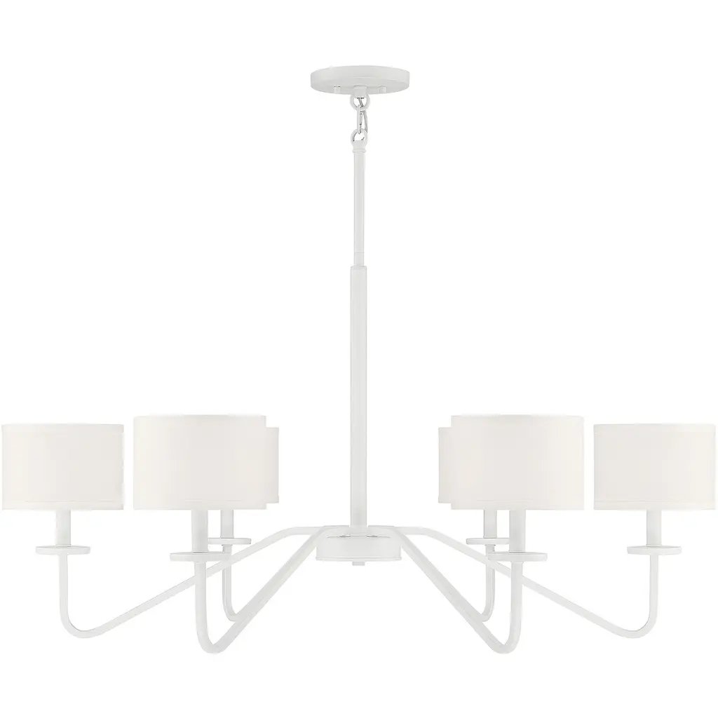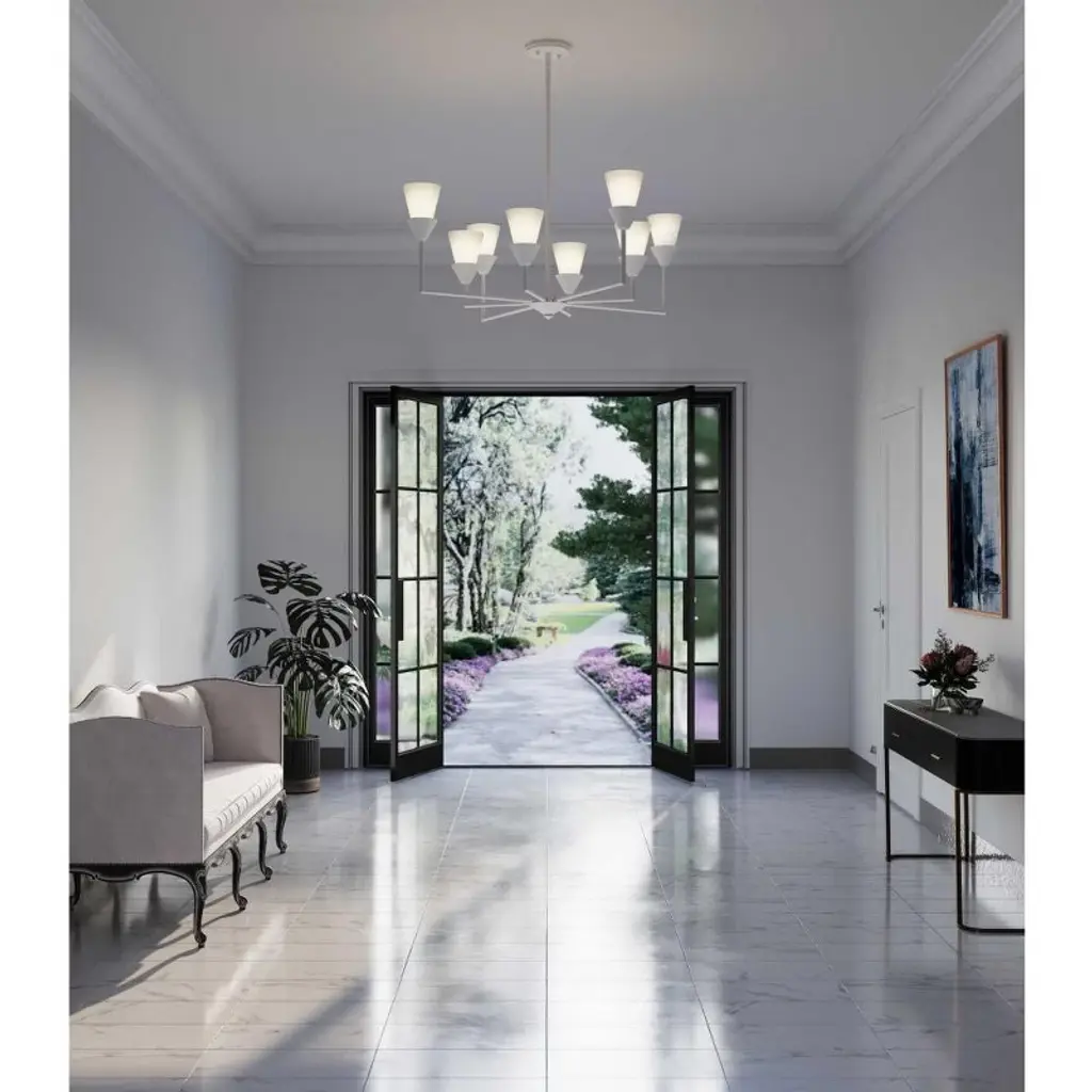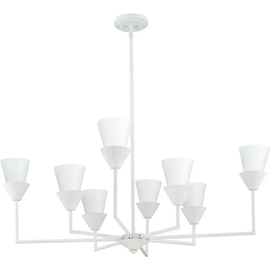 Introducing the Pinellas Chandelier from Progress Lighting's Design Series. This modern expression of a timeless form features a signature dual conical motif, artfully nested together to provide a pleasing diffusion of light from opal glass shades. The steel fixture with a white plaster finish measures 40" in width and 14.37" in height, making a statement in dining rooms, great rooms, and bedrooms. With 8 incandescent bulbs and a dry rating, this chandelier offers lovely ambient illumination. It includes installation instructions, mounting hardware, and a 1-Year Limited Warranty for your complete satisfaction. Elevate your space with this contemporary and luxurious lighting solution.