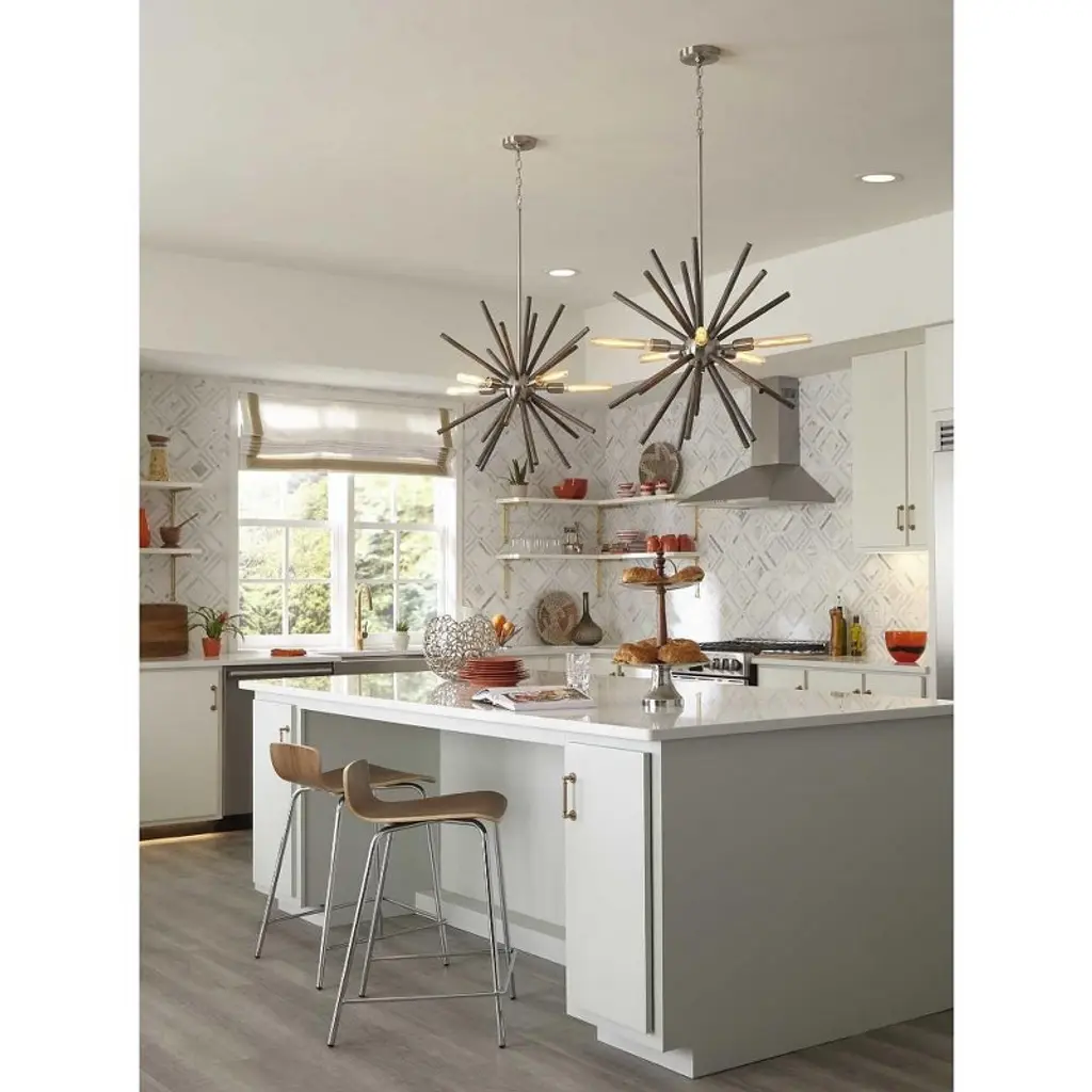 Introducing the Thorpe Collection 5-Light Brushed Nickel Mid-Century Modern Chandelier Light by Progress Lighting. This stunning chandelier features a starburst form with a rustic twist, combining angular lines in a faux Barnwood finish with a beautiful brushed nickel center and smooth stem. The 27.62" width and 23.88" height make it a striking centerpiece for any room. With a dry rating, it's perfect for indoor use. The chandelier includes a 5-bulb incandescent lighting system with a maximum wattage of 60 watts per bulb, creating a soft and playful ambiance. The 8" chain length and included canopy make installation a breeze. Elevate your space with the Thorpe Collection's unique blend of modern and rustic design.