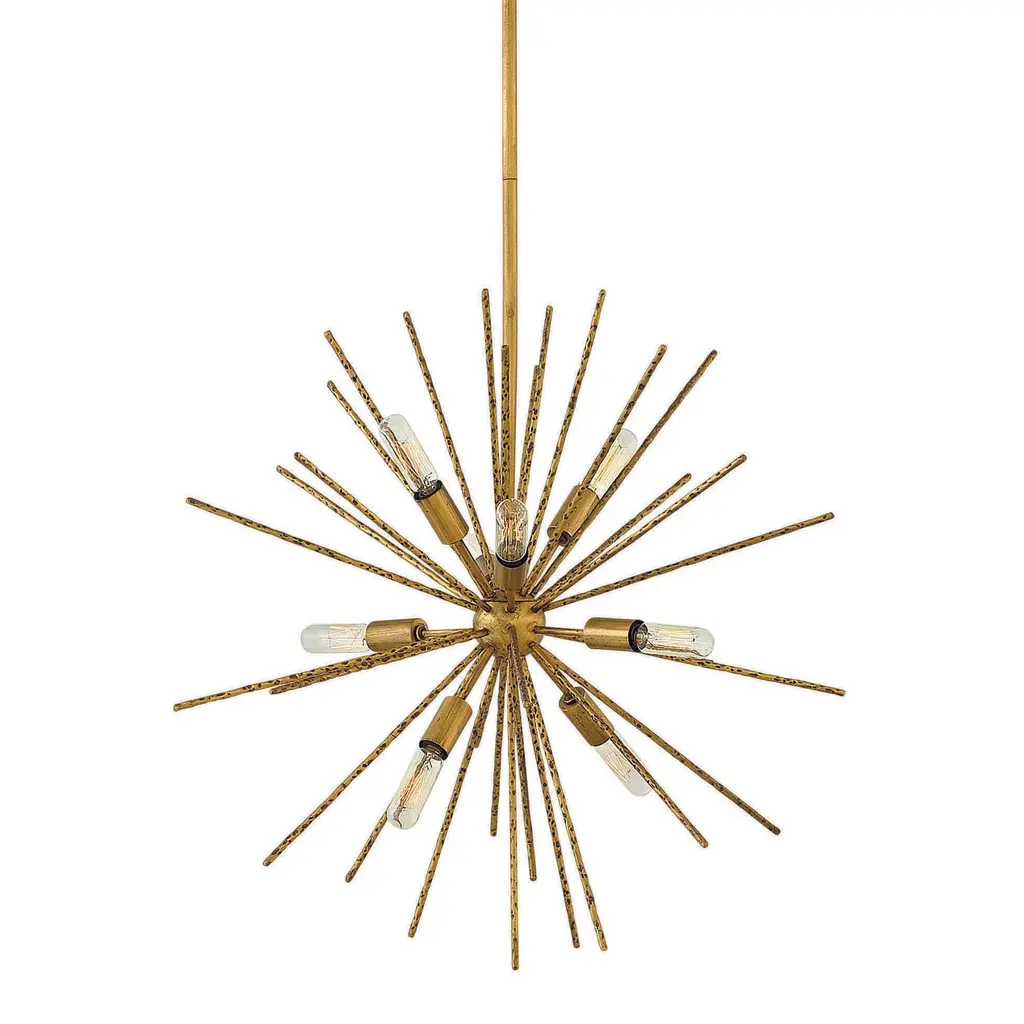 Introducing the Thorpe Collection 5-Light Satin Brass Chandelier Light by Progress Lighting. This stunning piece combines the starburst form with a rustic twist, creating a captivating mid-century modern design. Crafted from durable steel with a luxurious satin brass finish, the chandelier measures 27.62" in width, 23.88" in height, and 27.62" in length. It comes with an 8" chain and features a faux Barnwood finish on angular lines, complemented by a brushed nickel center and stem. The chandelier accommodates 5 incandescent bulbs with a maximum wattage of 60 watts each, creating a soft and playful ambiance. This dry-rated fixture includes a 5" canopy and rod lengths of 1-6 and 4-12, making it a versatile and stylish addition to any space. Elevate your decor with the Thorpe Collection Chandelier from Progress Lighting.