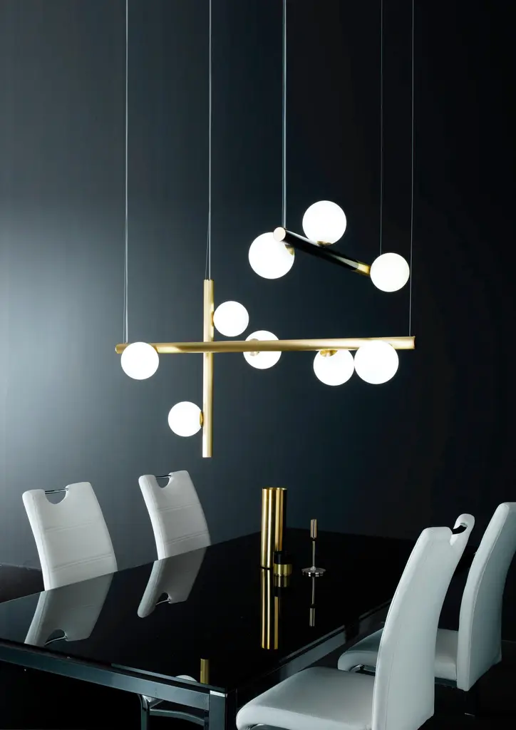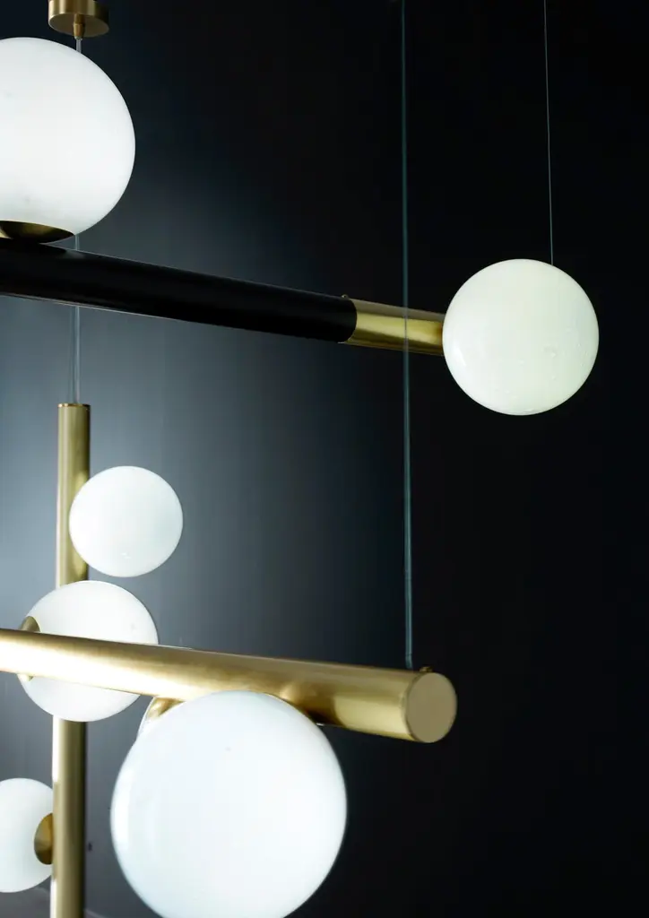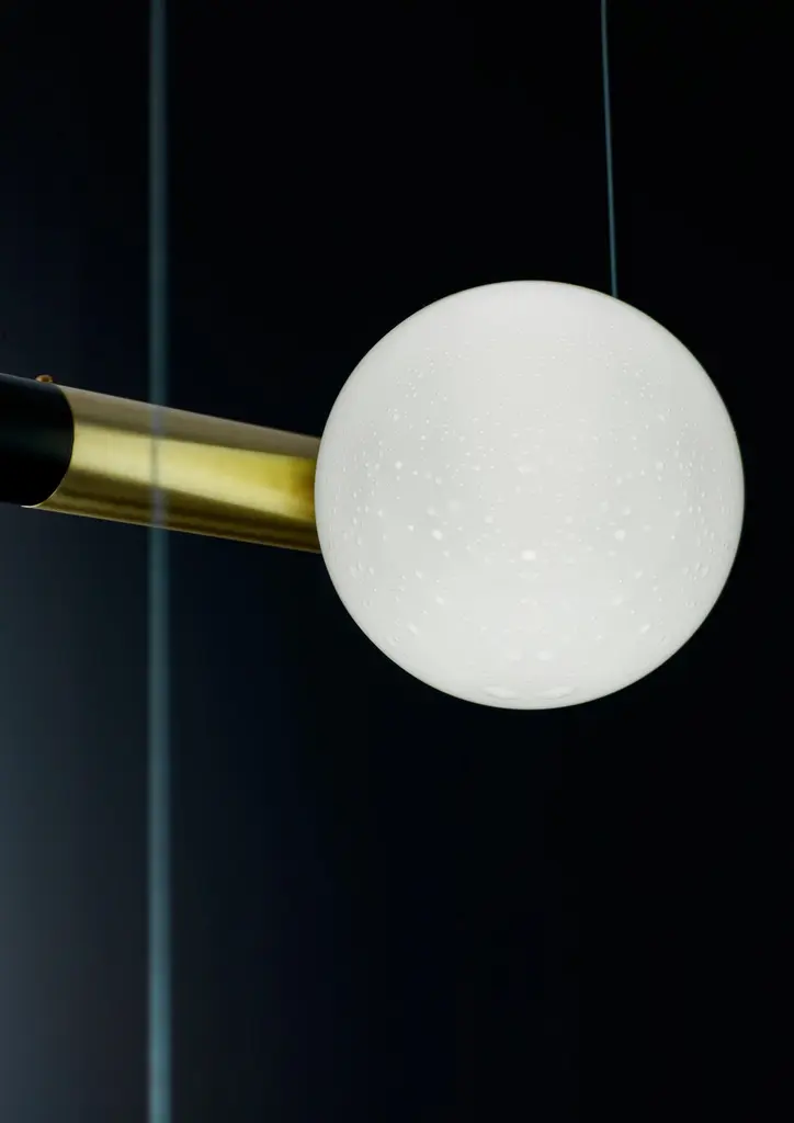 Pulegoso glass "Diana" chandelierDimensions: 80 x 10 x 10 cmMaterials: glass, brassBrass chandelier with puelegoso glass spheres, brass satin and/or matte finish.