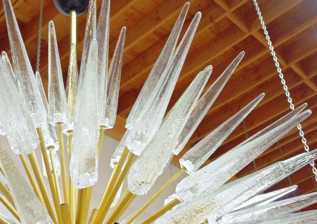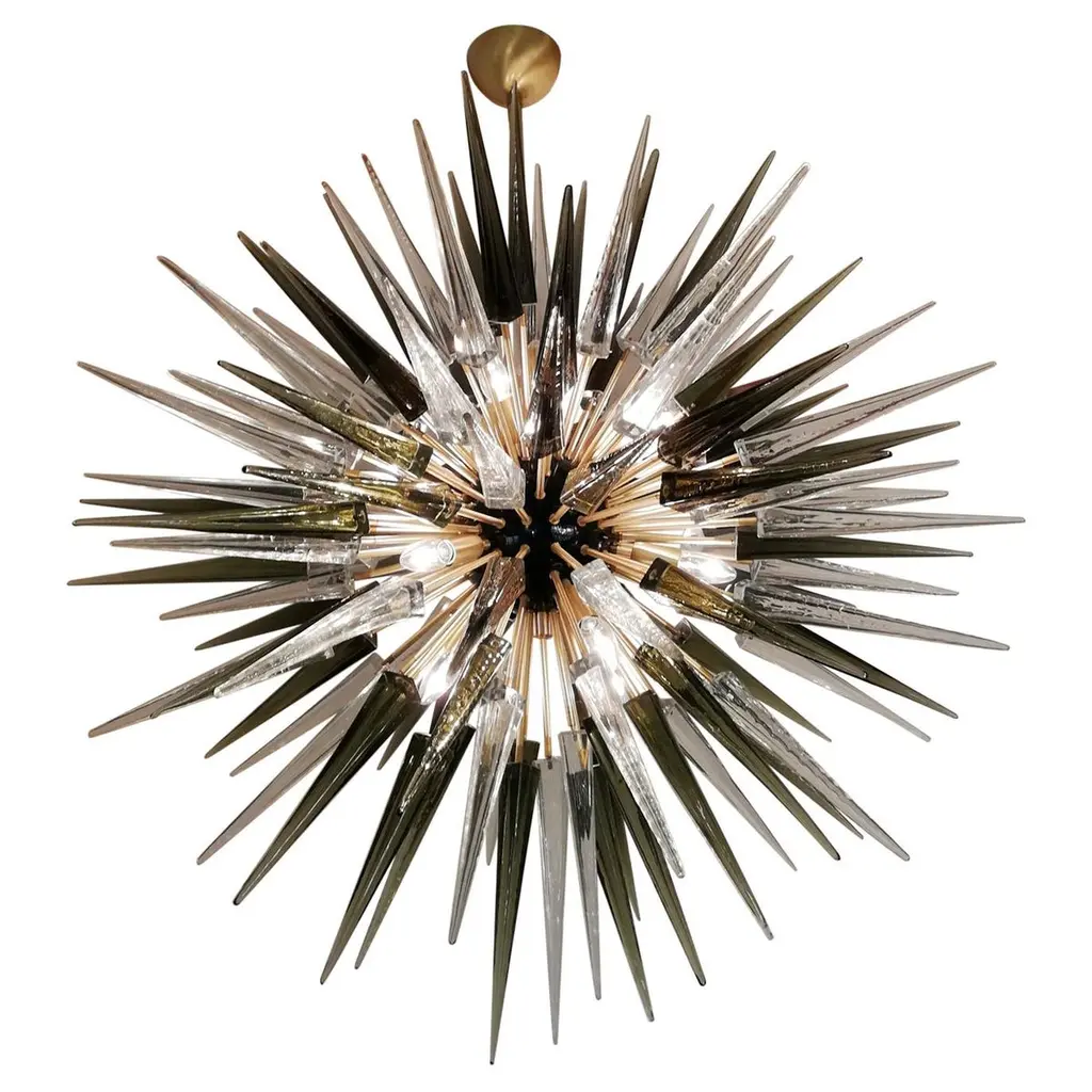 Italian modern Sputnik chandelier shown with clear Murano glass shards, black enameled centre, mounted on brass frame / Designed by Fabio Bergomi for Fabio Ltd / Made in Italy 12 lights / E12 or E14 type / Max 40W eachDiameter: 52 inches / Height: 60 inches including rod and canopy Order only / This item ships from ItalyOrder Reference #: FABIOLTD C262