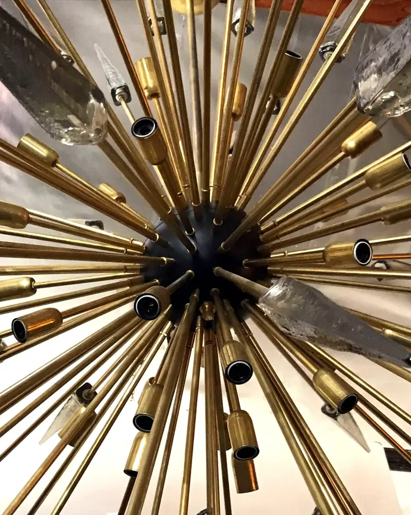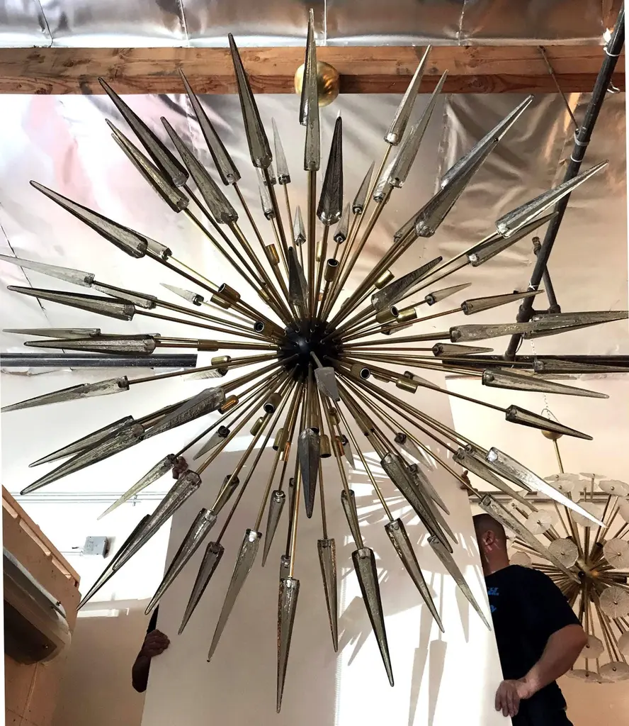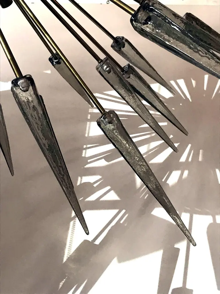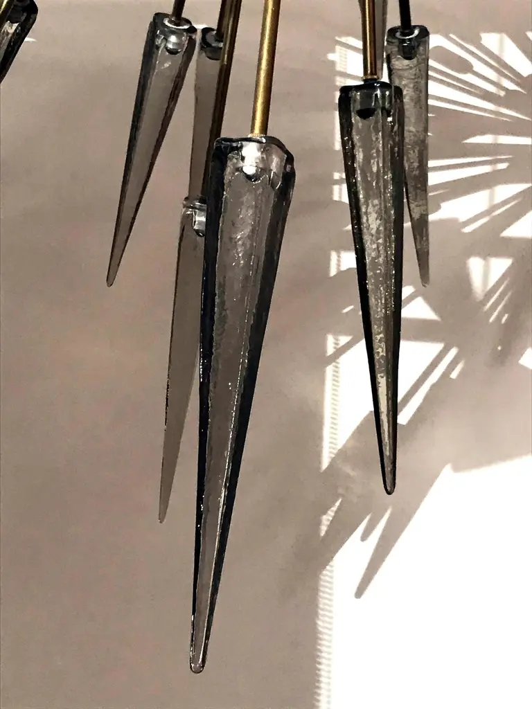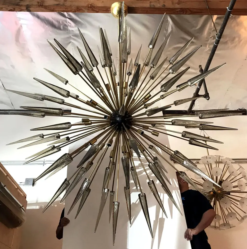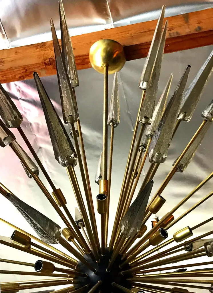 Italian modern Sputnik chandelier with smoky Murano glass shards spikes, mounted on natural unlacquered brass frame with black enameled centre, designed by Fabio Bergomi for Fabio Ltd / Made in Italy30-light / E12 or E14 type / max 40 W eachMeasures: Height 89 inches including rod and canopy, diameter 72 inchesOrder only / This item ships from ItalyOrder Reference #: FABIOLTD C472 SMOKY