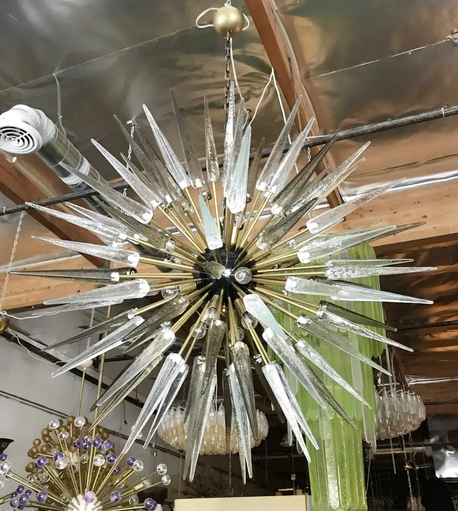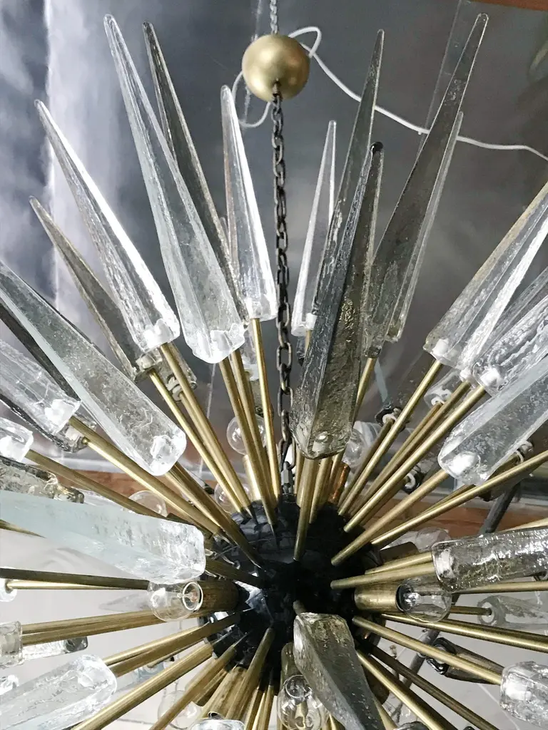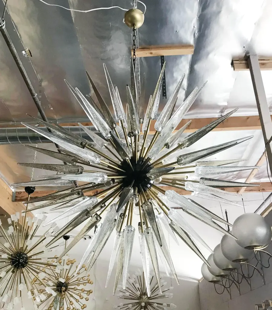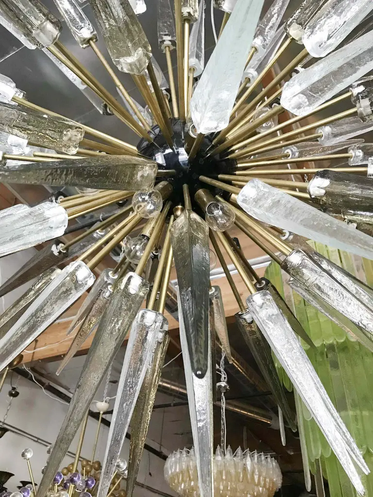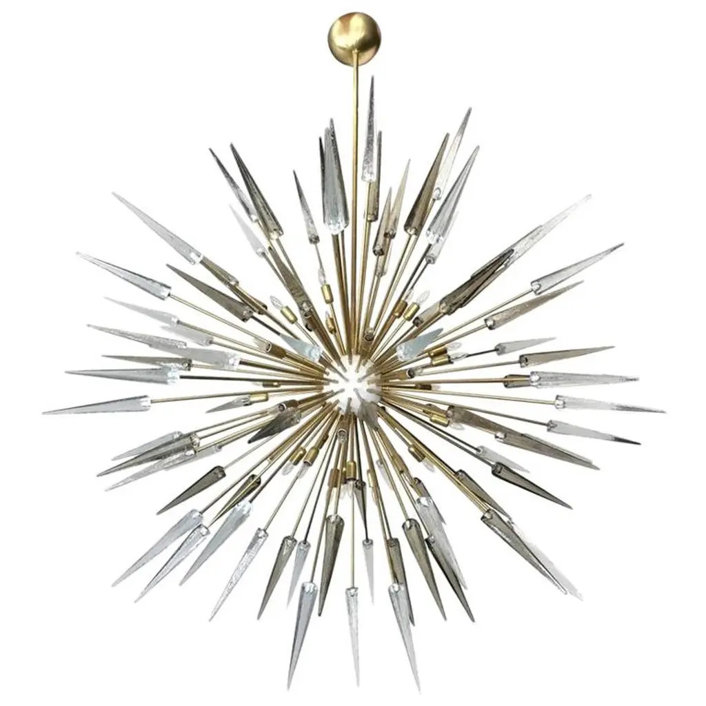 Italian modern Sputnik chandelier with clear and smoky Murano glass shards spikes, mounted on natural unlacquered brass frame with black enameled centre, designed by Fabio Bergomi for Fabio Ltd, made in Italy16-light / E12 or E14 type / max 40W eachMeasures: Diameter 52 inches, height 52 inches plus chain and canopyOrder only / this item ships from ItalyOrder Reference #: FABIOLTD C597
