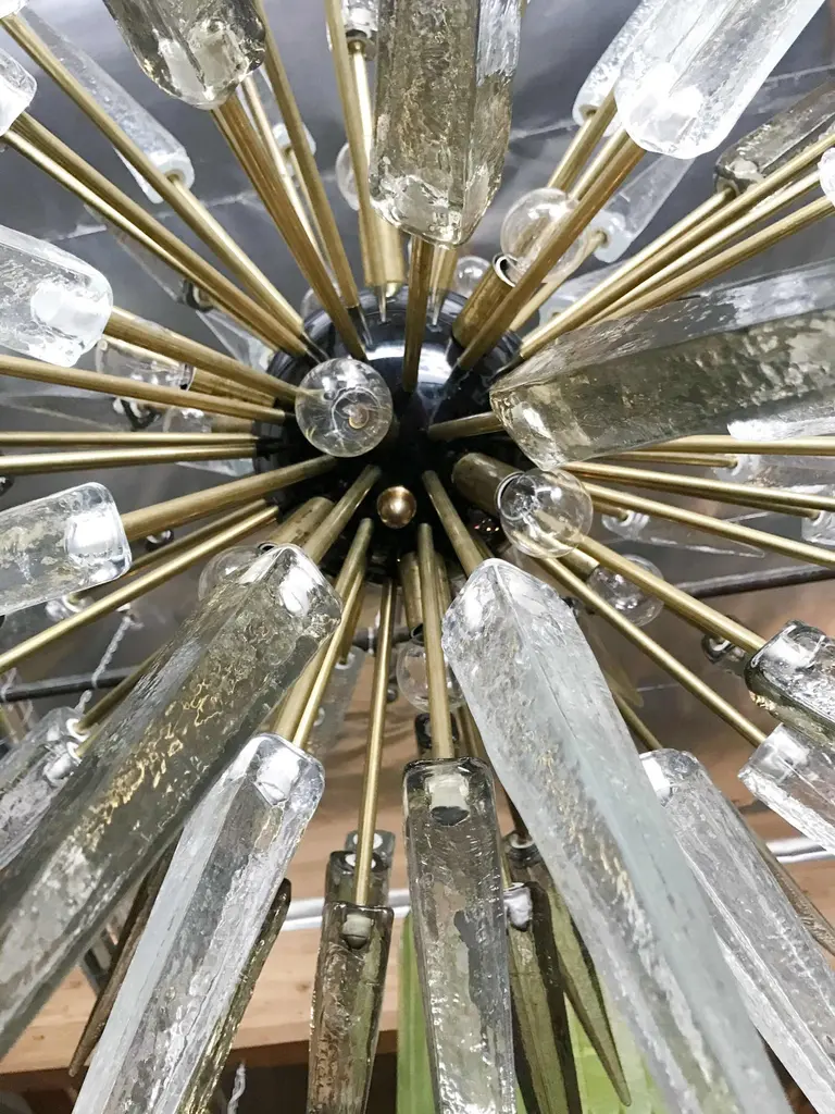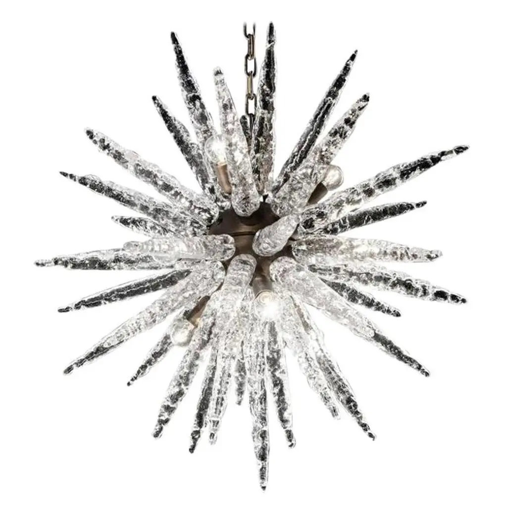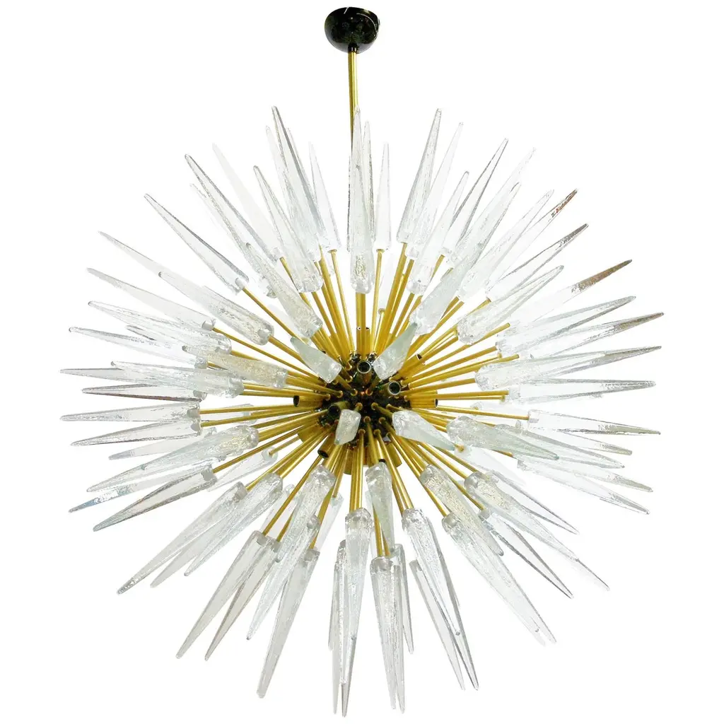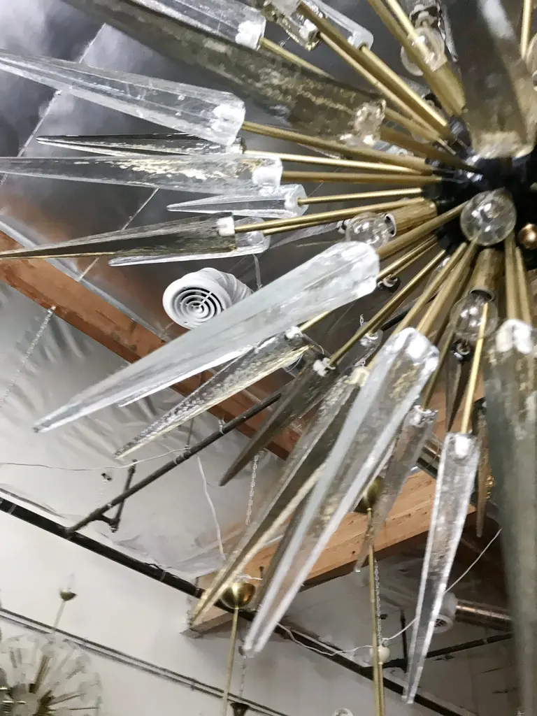 Italian modern Sputnik chandelier with clear and smoky Murano glass shards spikes, mounted on natural unlacquered brass frame with black enameled centre, designed by Fabio Bergomi for Fabio Ltd, made in Italy16-light / E12 or E14 type / max 40W eachMeasures: Diameter 52 inches, height 52 inches plus chain and canopyOrder only / this item ships from ItalyOrder Reference #: FABIOLTD C597