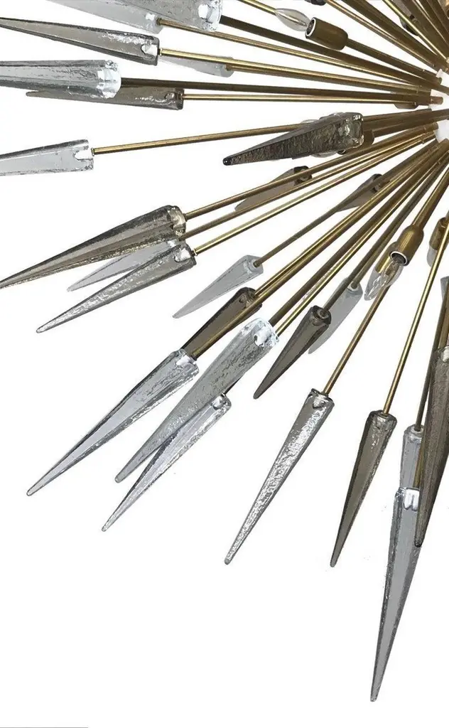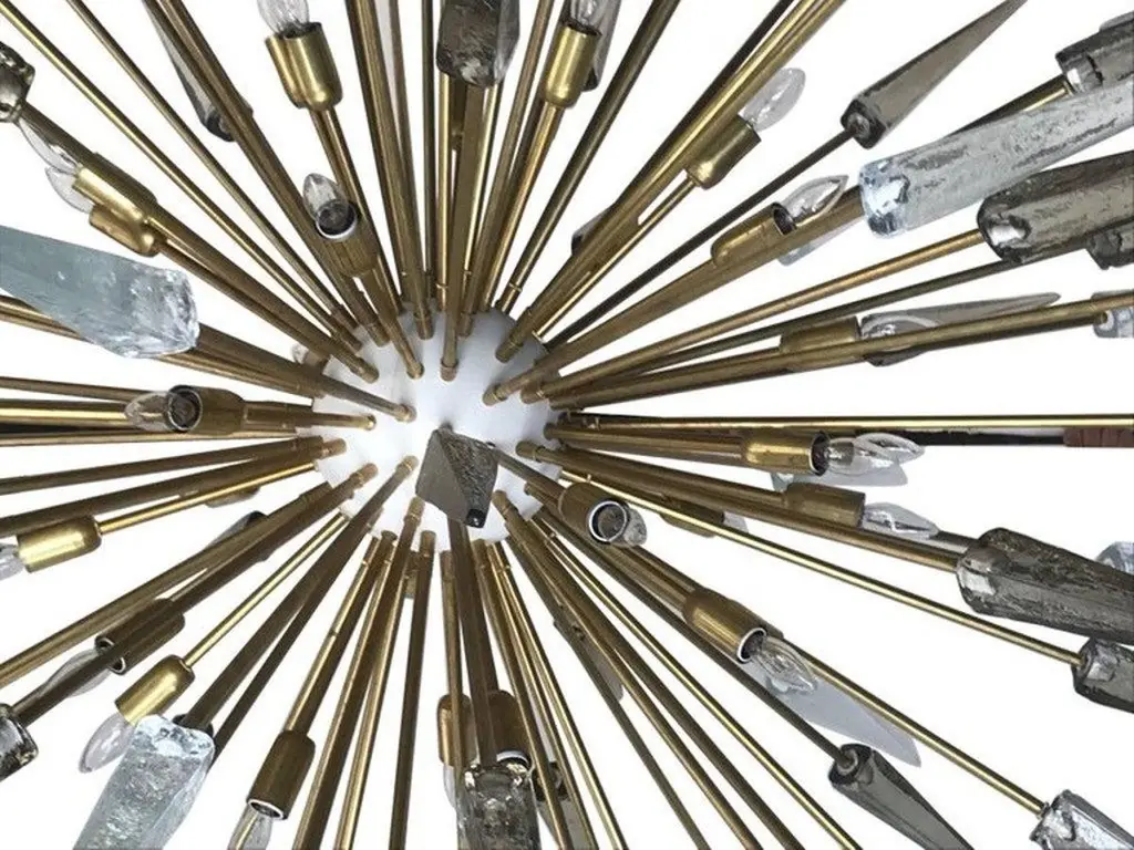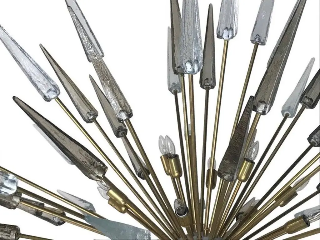 Italian modern sputnik chandelier with clear and smoky Murano glass shards spikes, mounted on natural unlacquered brass frame with white enameled centre, designed by Fabio Bergomi for Fabio Ltd / Made in Italy30 lights / E12 or E14 type / max 40W eachMeasures: Height 89 inches including rod and canopy / Diameter 72 inchesOrder only / This item ships from ItalyOrder Reference #: FABIOLTD C432