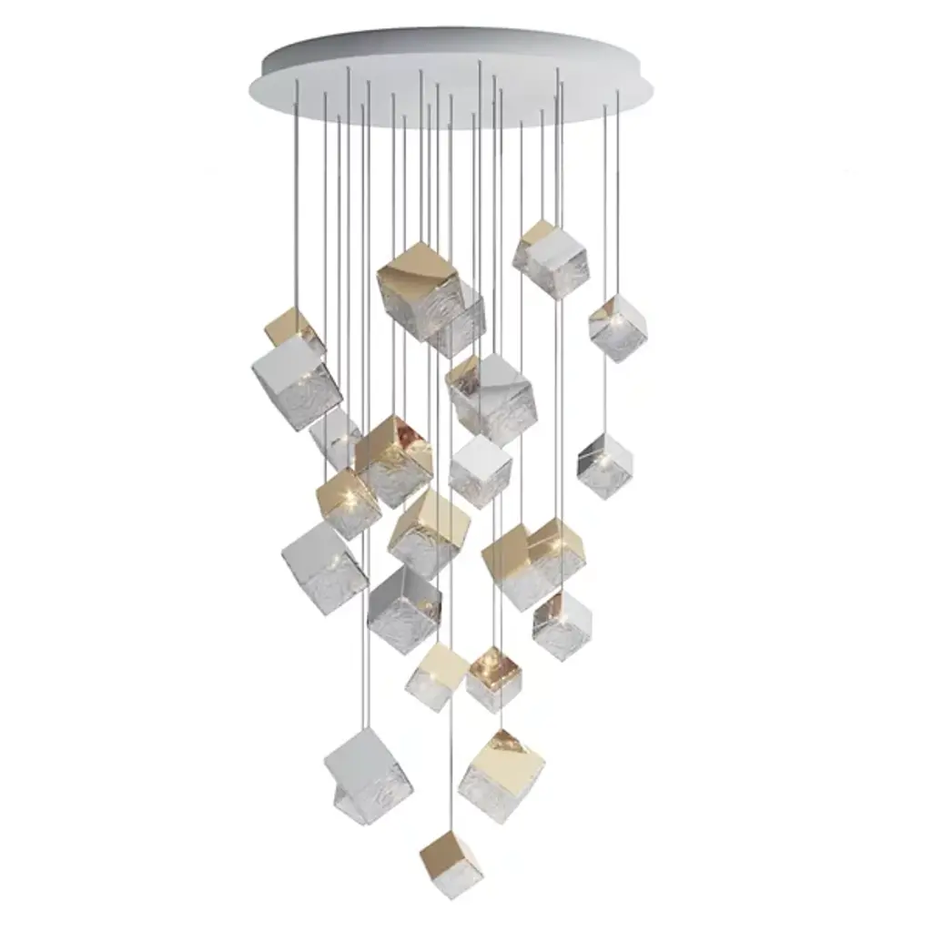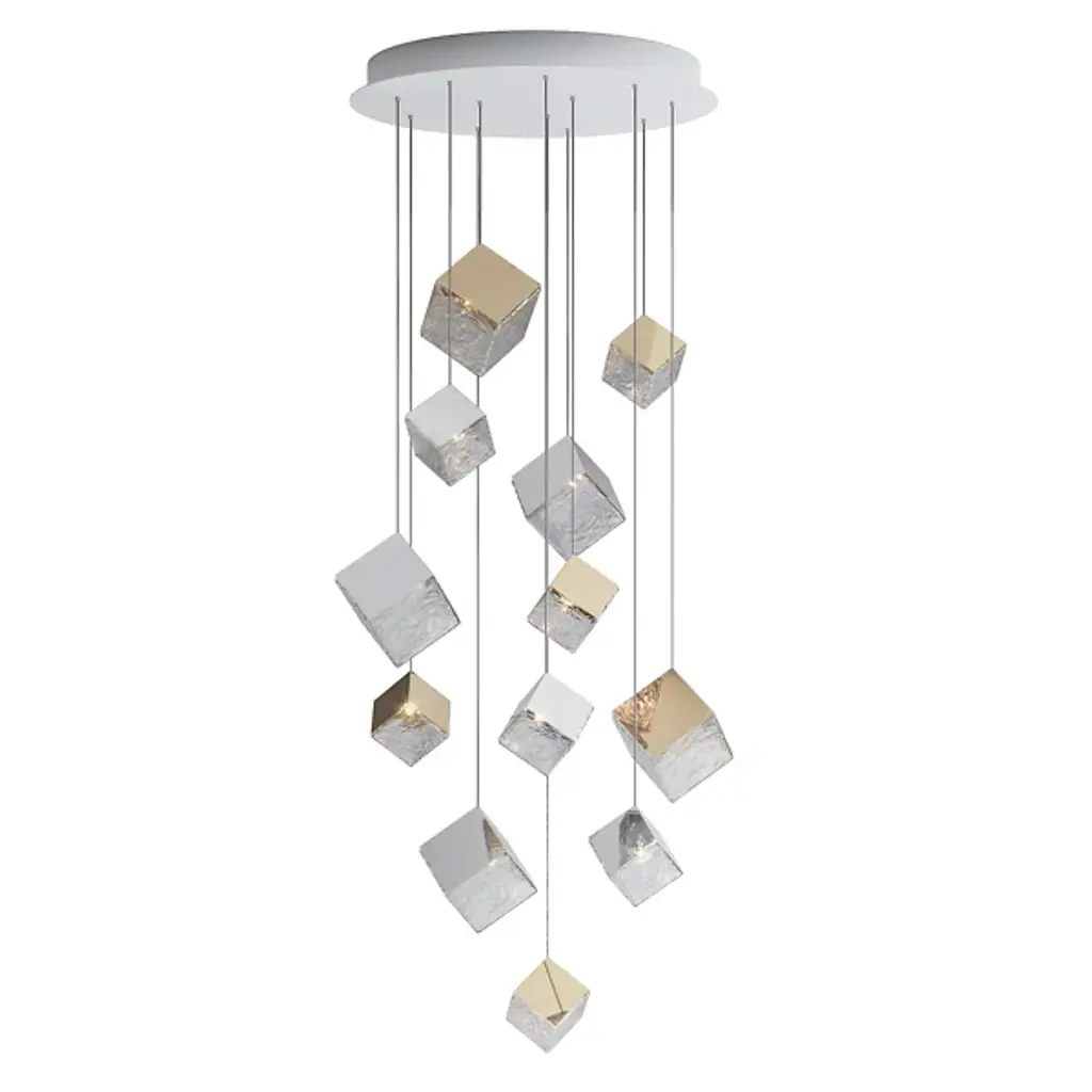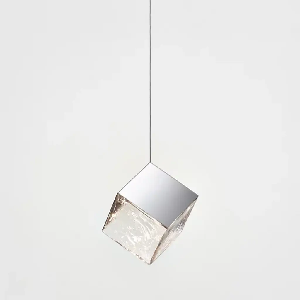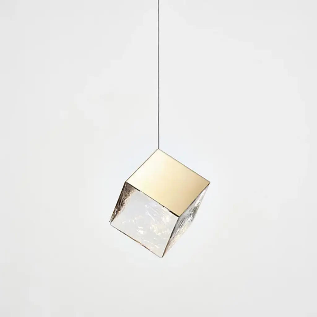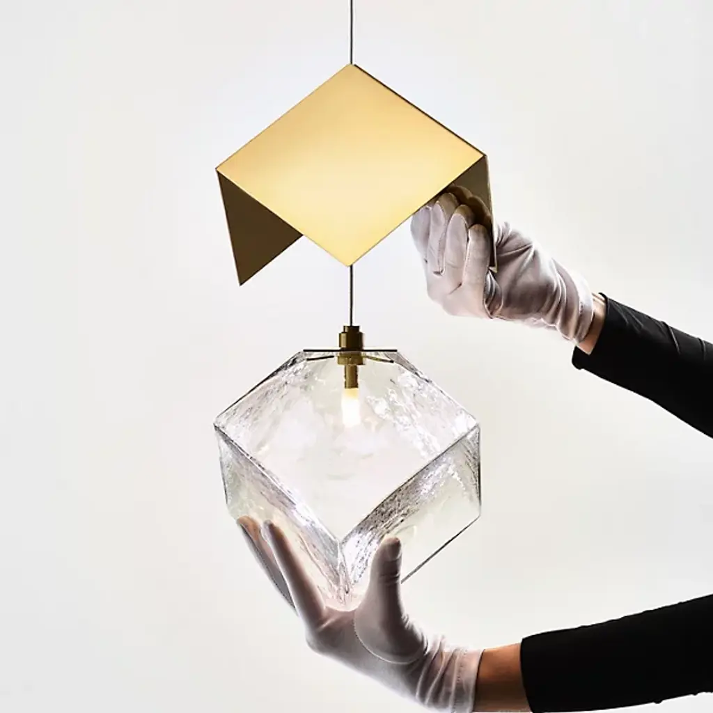 The Pyrite Chandelier from Bomma blends simplicity with a touch of elegance. Handblown molten crystal is shaped into a precise cube, resulting in a unique light fixture with a gleaming, rippled surface encased on three sides by polished metal. Designed by DECHEM Studio, inspired by the beauty of mineral formations, the chandelier comes in two stunning finishes. The golden option reflects its namesake, golden firestone, while the silver finish is inspired by the purity of salt crystals, offering a sophisticated lighting solution for any space.