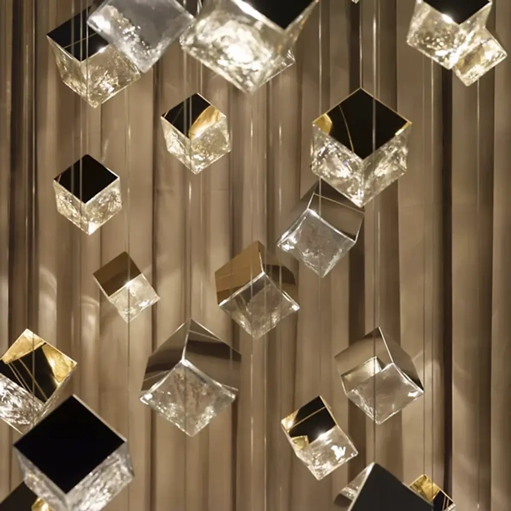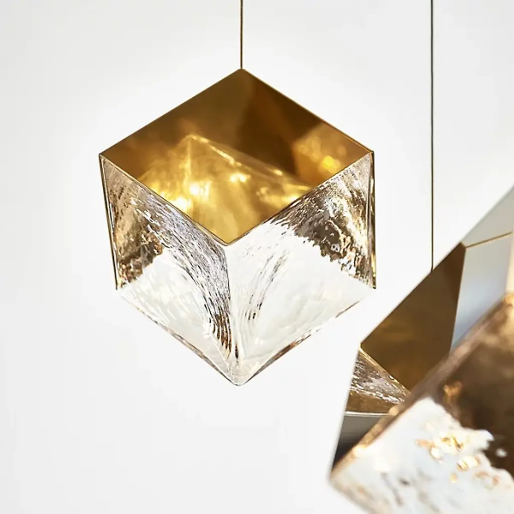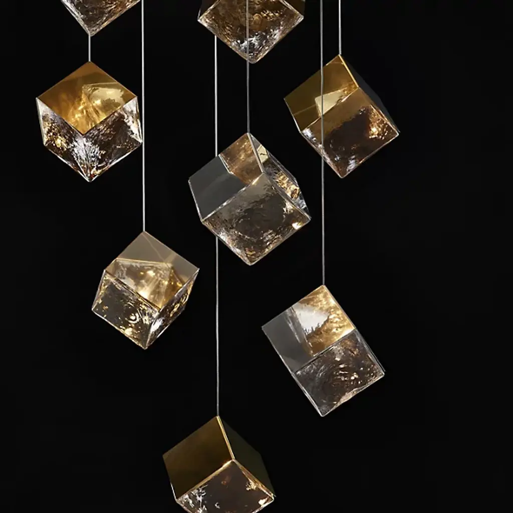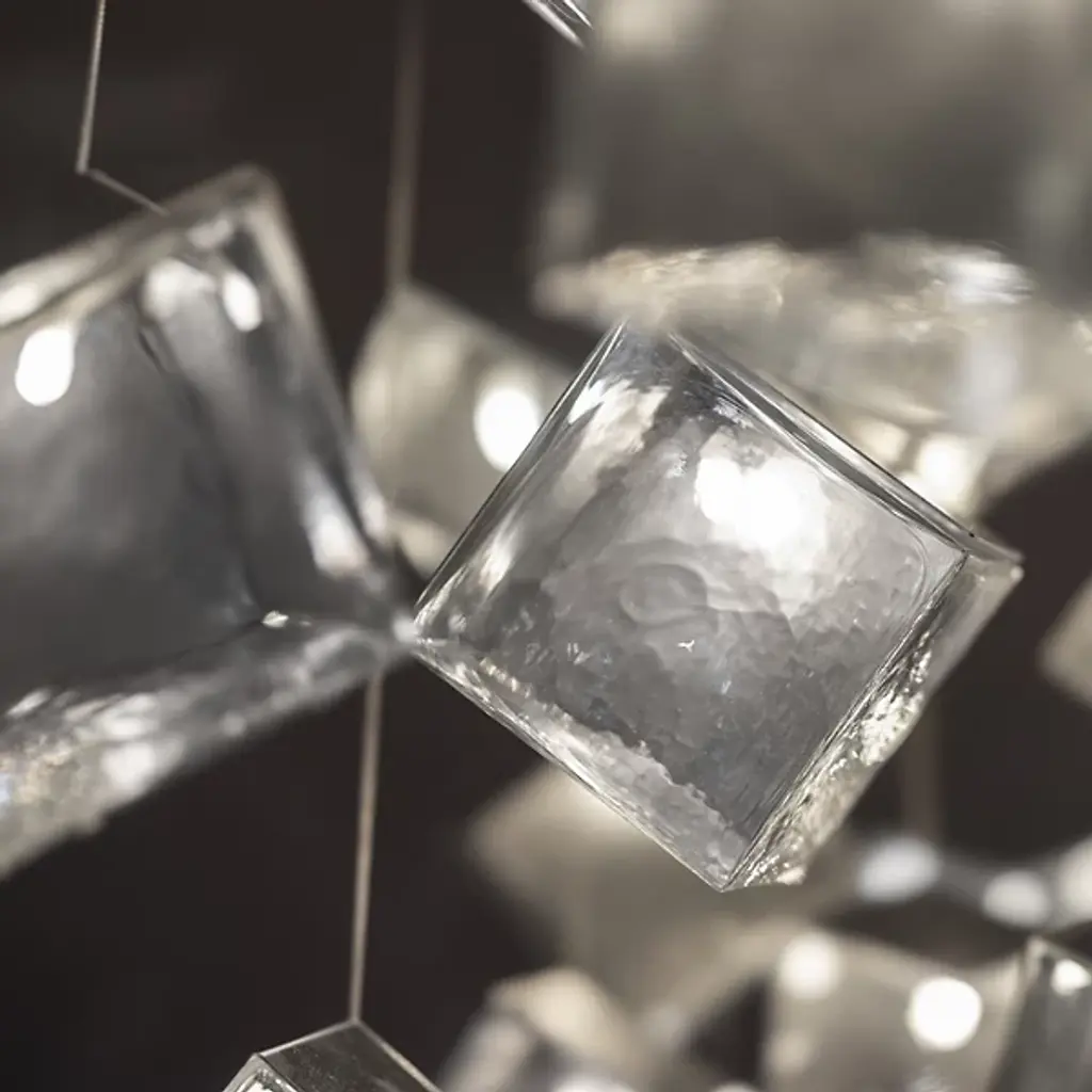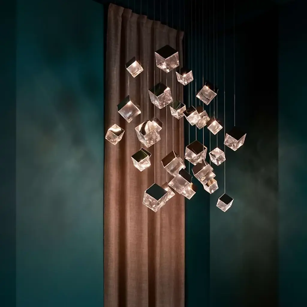The Pyrite Chandelier from Bomma blends simplicity with a touch of elegance. Handblown molten crystal is shaped into a precise cube, resulting in a unique light fixture with a gleaming, rippled surface encased on three sides by polished metal. Designed by DECHEM Studio, inspired by the beauty of mineral formations, the chandelier comes in two stunning finishes. The golden option reflects its namesake, golden firestone, while the silver finish is inspired by the purity of salt crystals, offering a sophisticated lighting solution for any space.